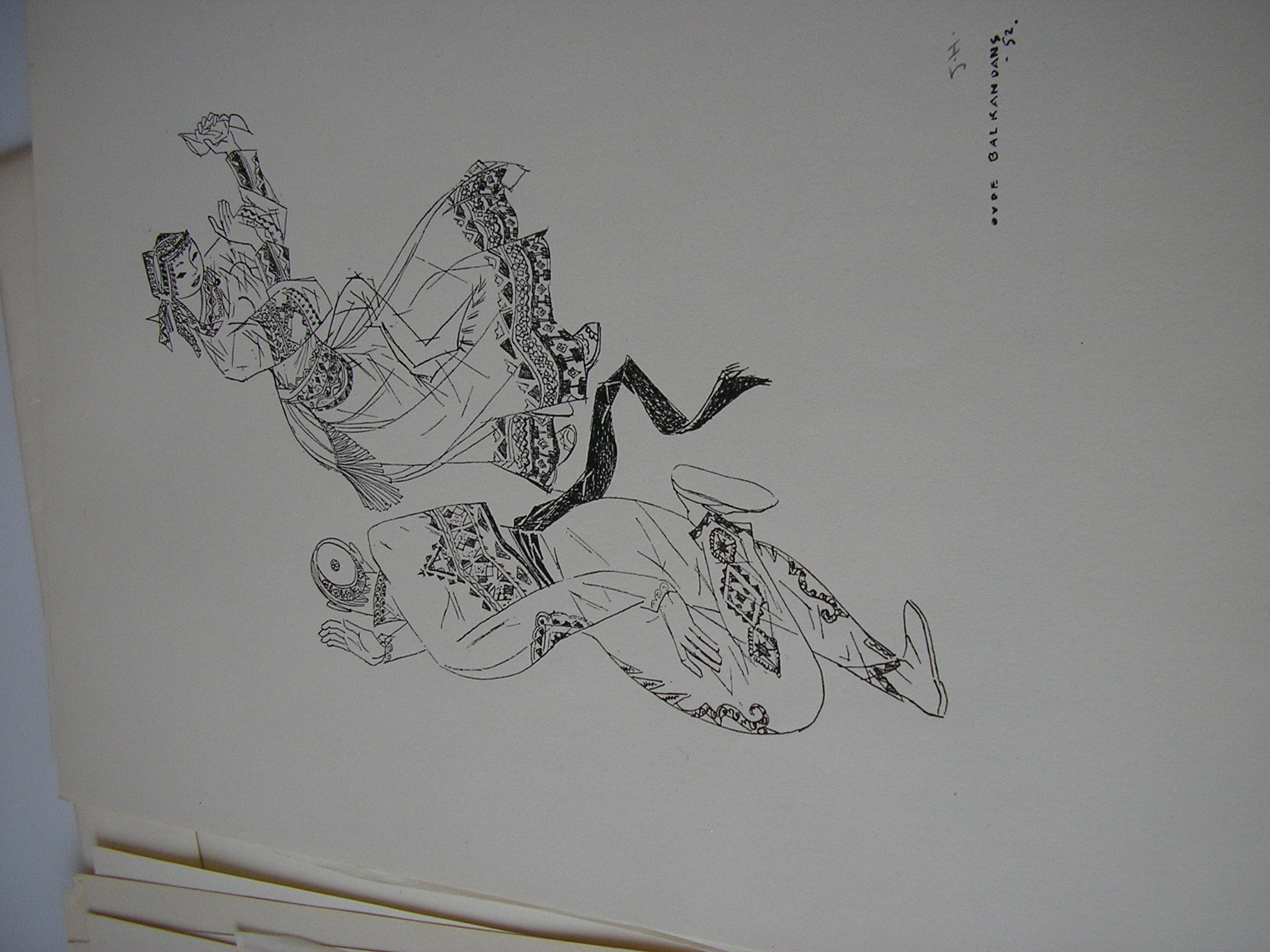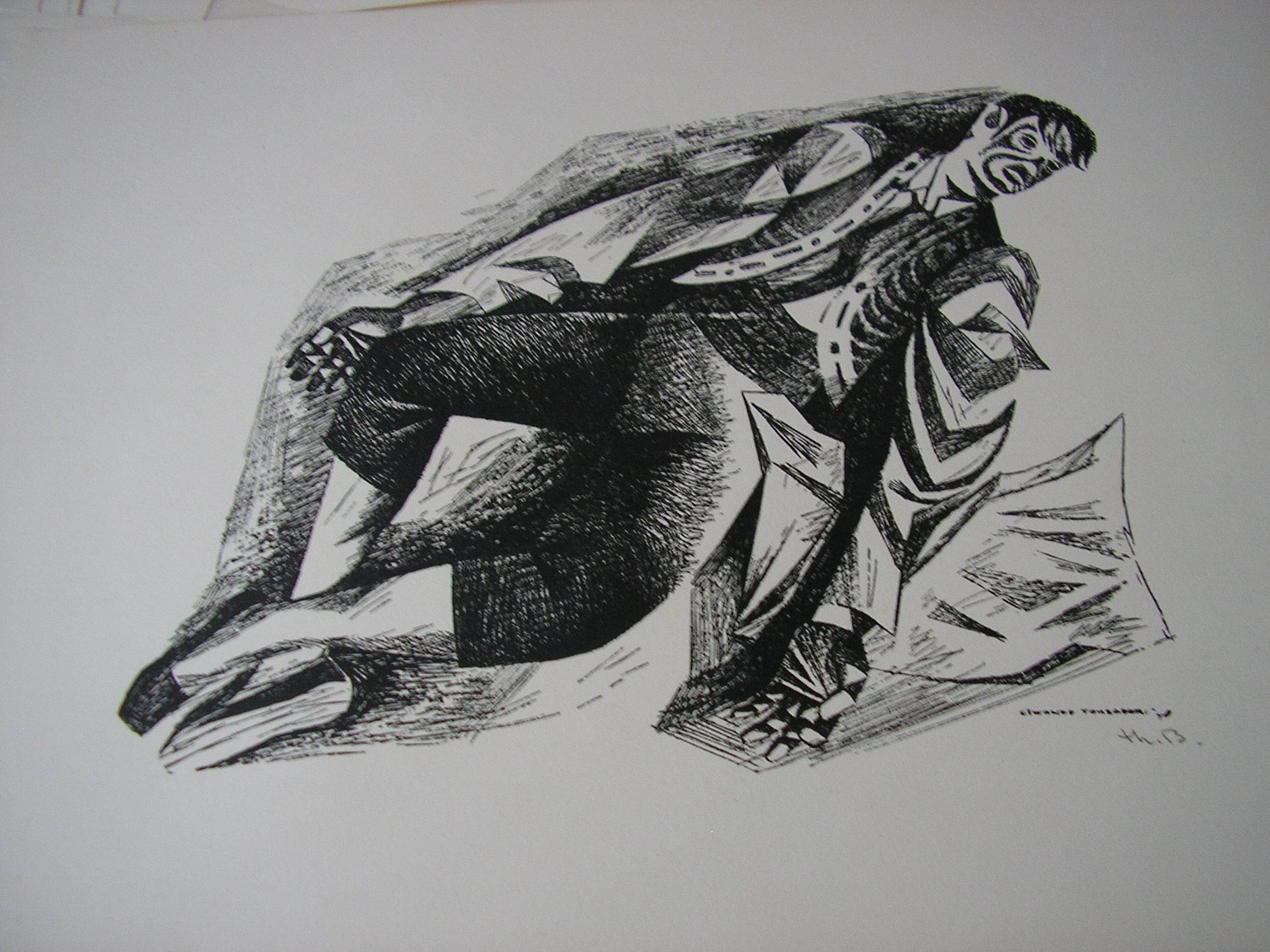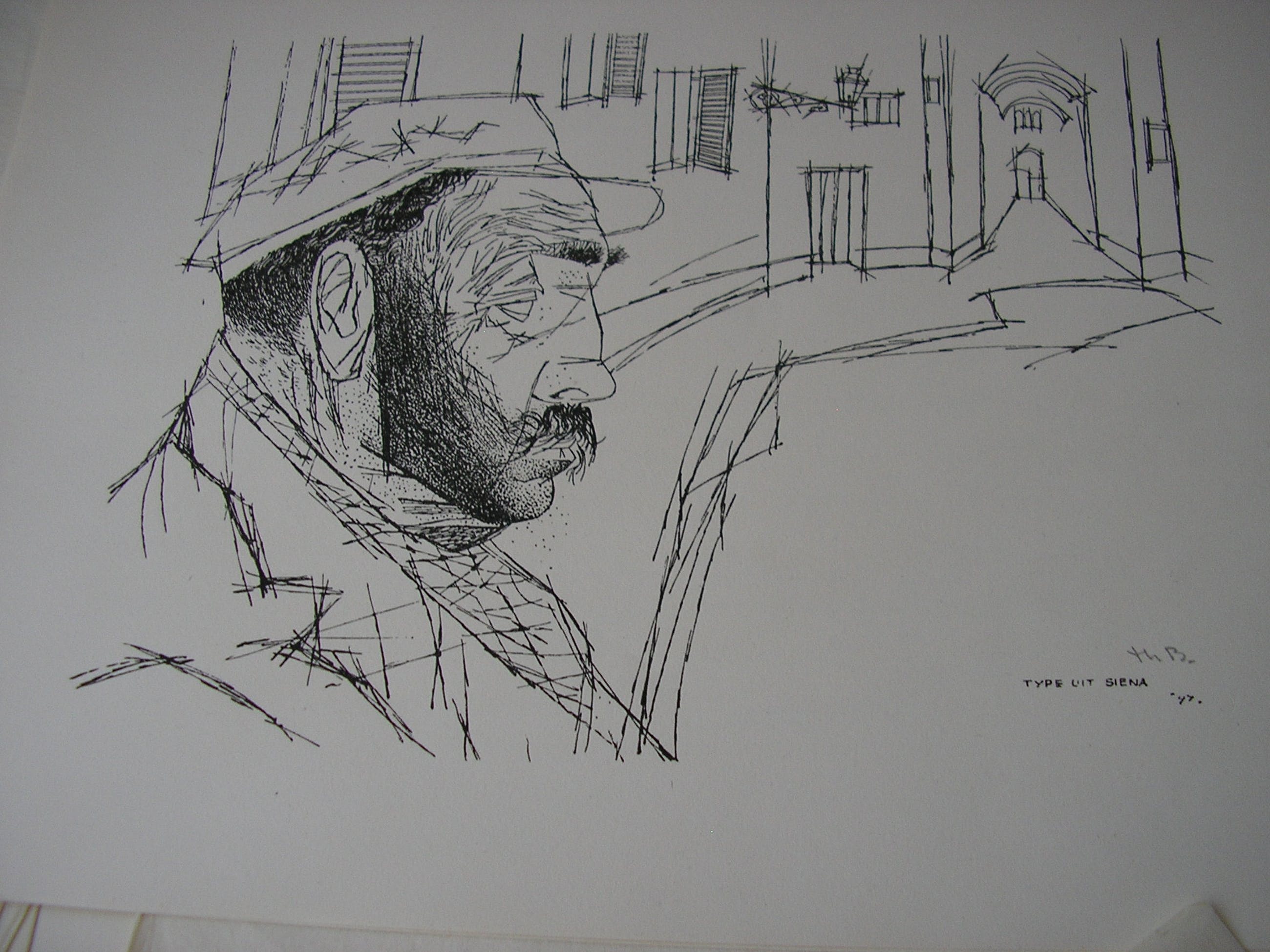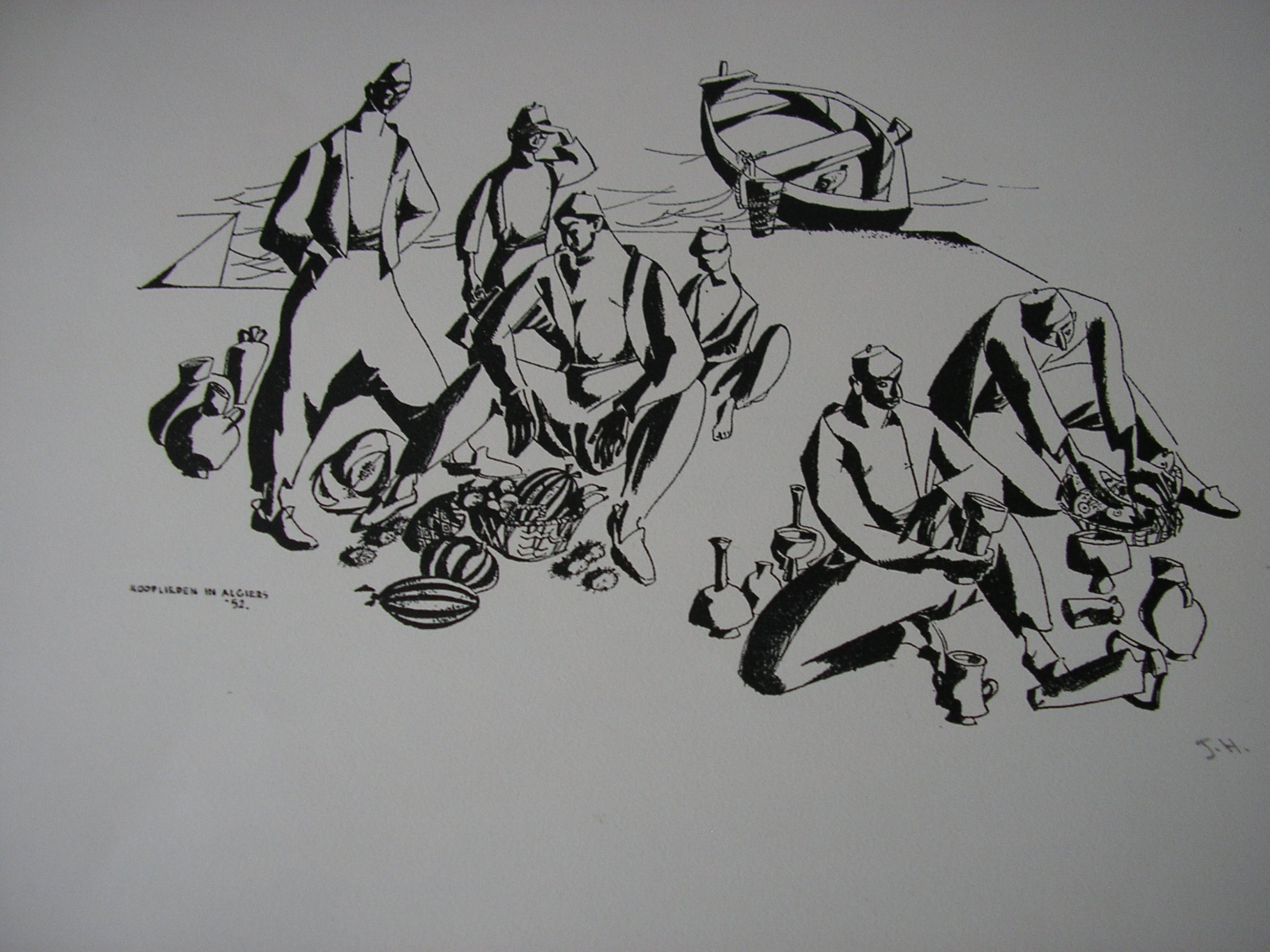 Verzameling van 10 tekeningen in uitstekende konditie: Nummer 67 van een uitgave van 100 genummerde exemplaren , gedrukt in NV Roepers Drukkerij te S'Gravenhage met een inleiding van Jan de Kruys, december 1952. Eén tekening is met de hand gekleurd door Theo Bitter en alle tien zijn getekend door de artiesten.