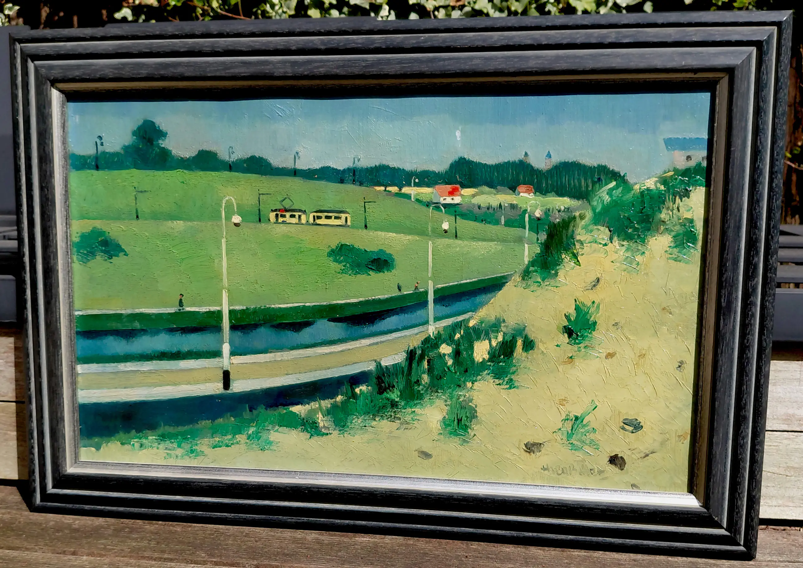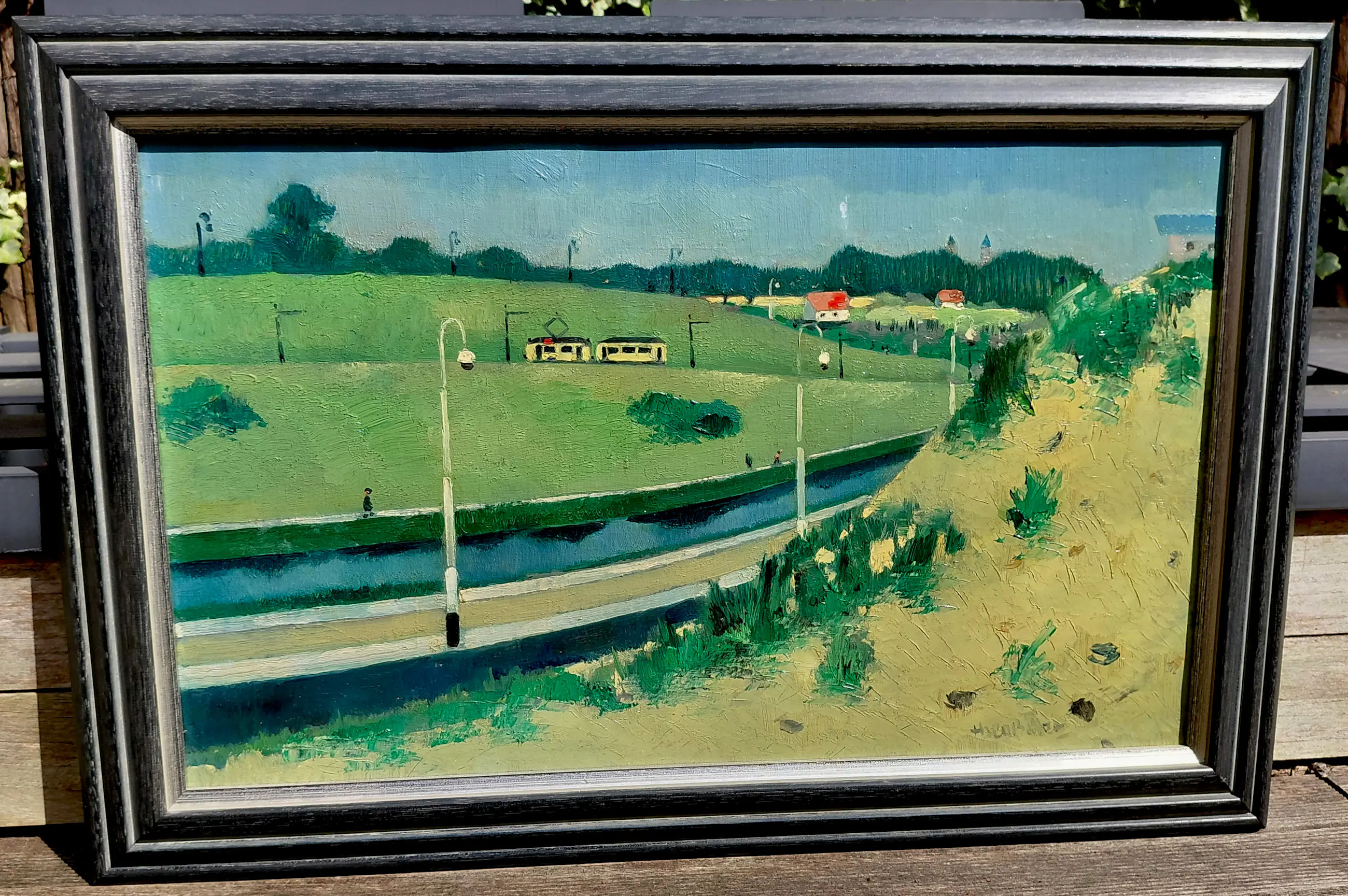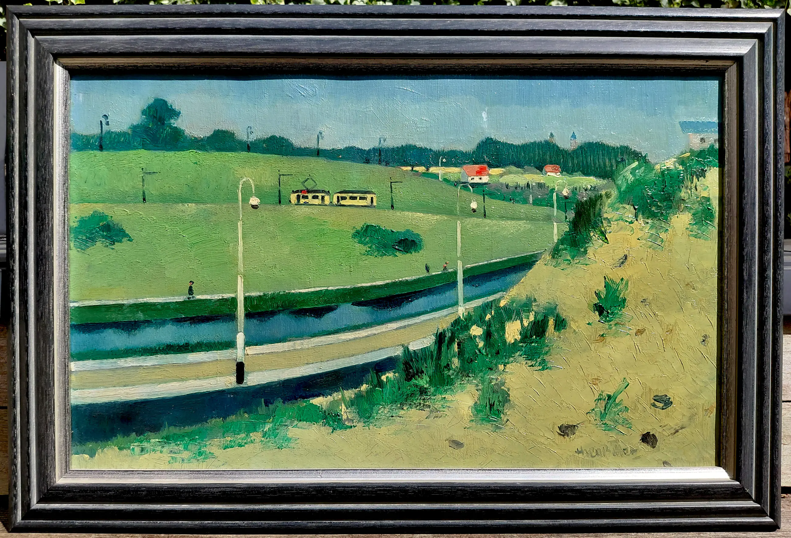 Theo Bitter - Tram in Scheveningen, olieverf op doek (netjes ingelijst)
