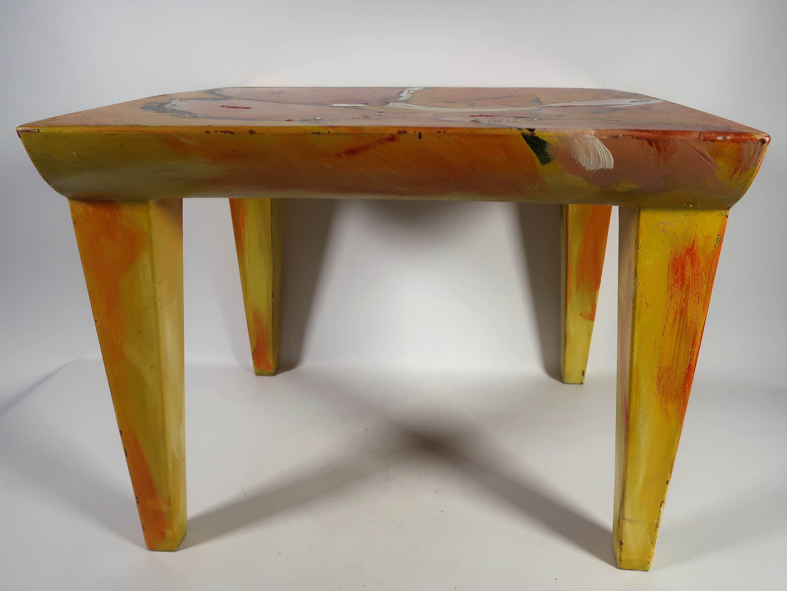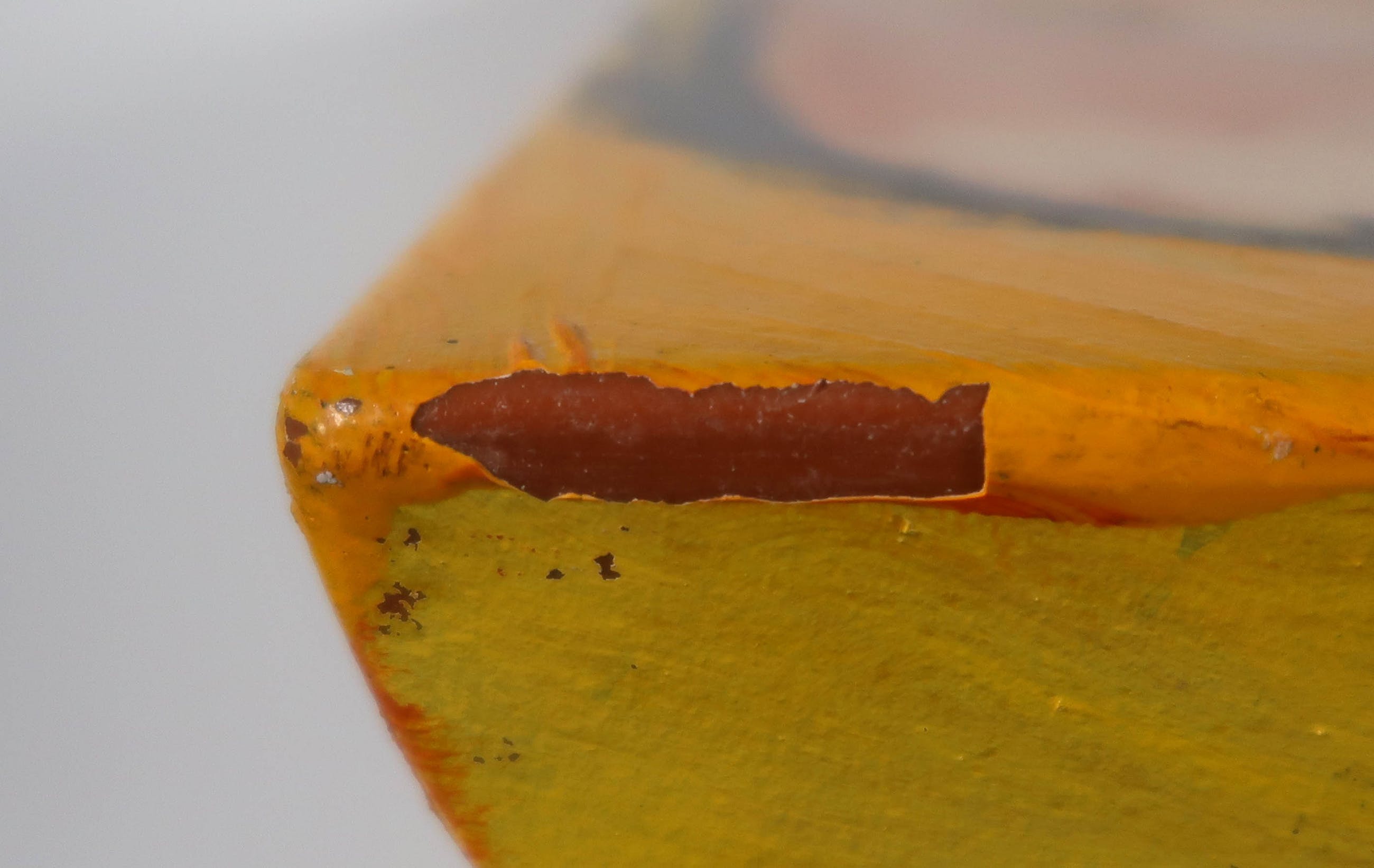 Het werk is in algeheel goede conditie. Hier en daar is er wat verf afgebladderd, tevens zijn de randen van het blad en de poten verweerd. Zie de foto's voor een impressie. | |