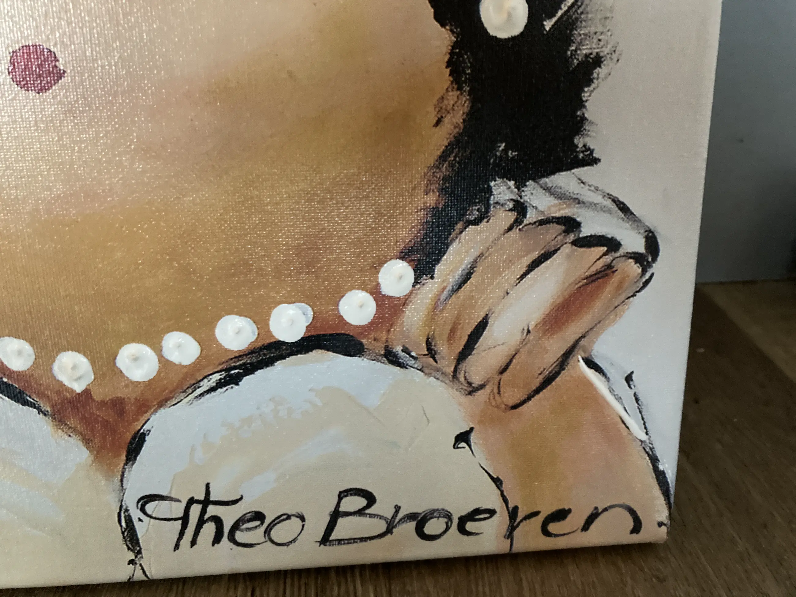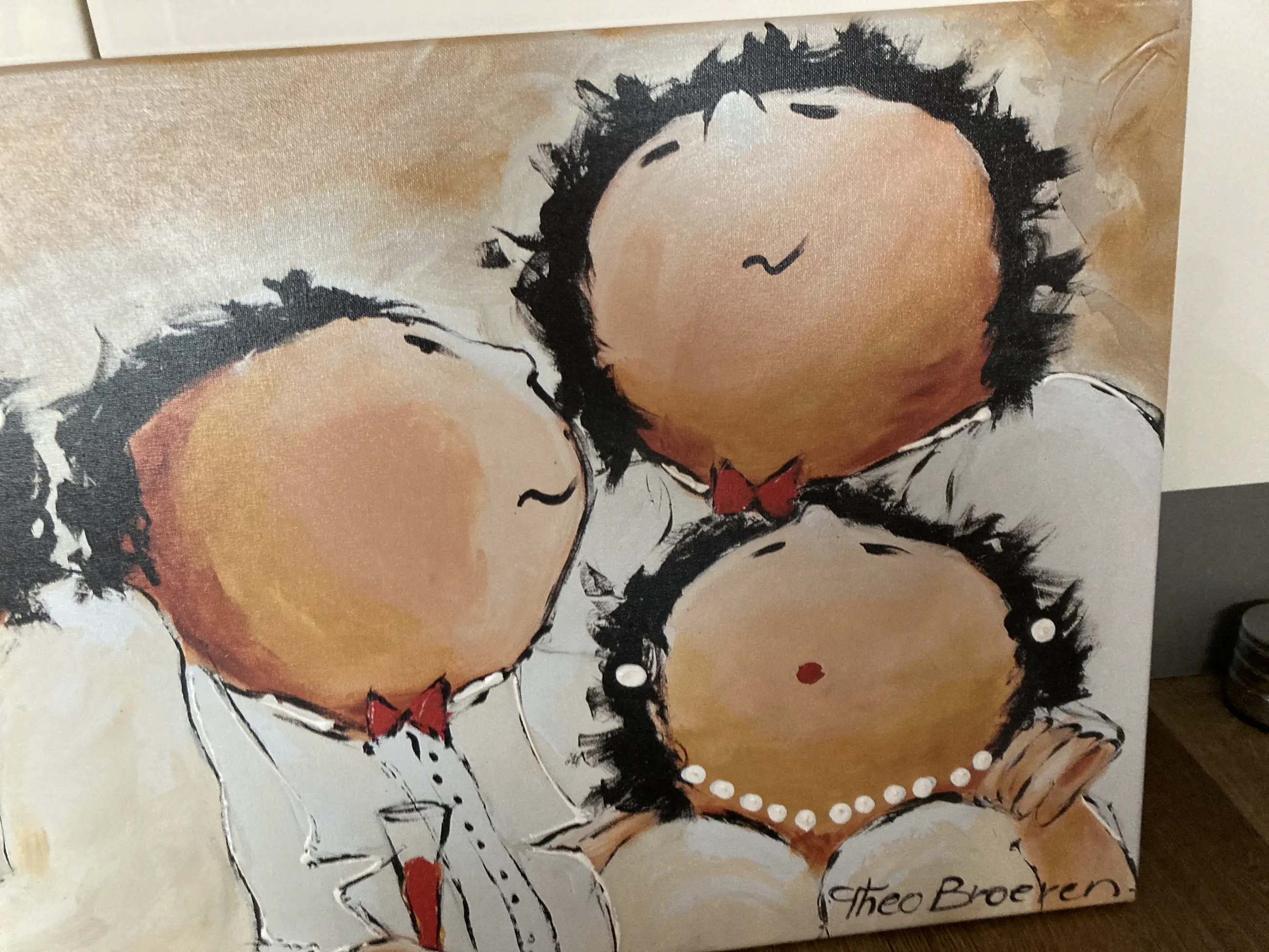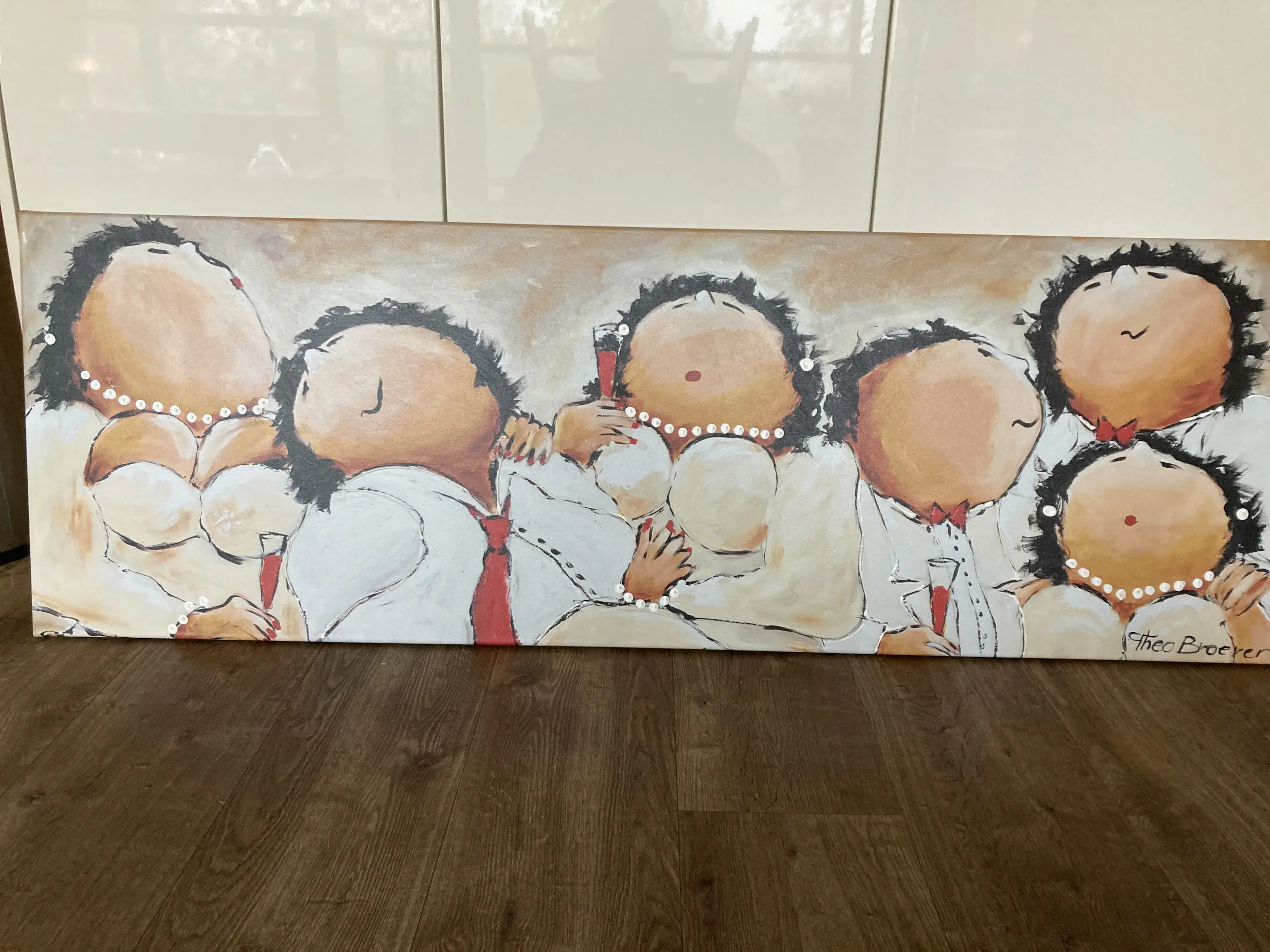 Mooi,kleurrijk en groot schilderij van Theo Broeren met een typisch Dikke Dames tafereel.