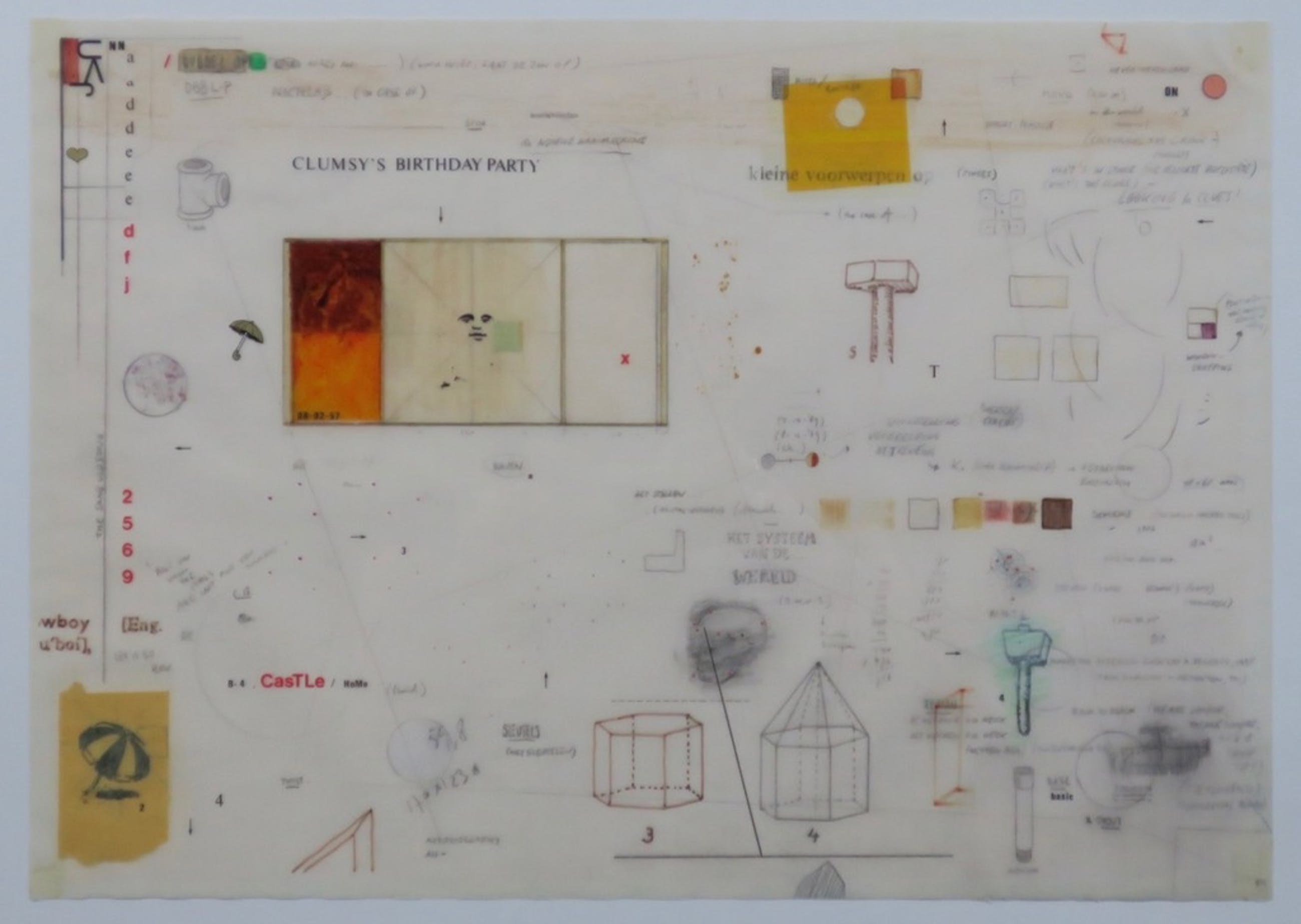 Materiaal: Gemengde techniek op papier, o.a. collage, potlood en stift