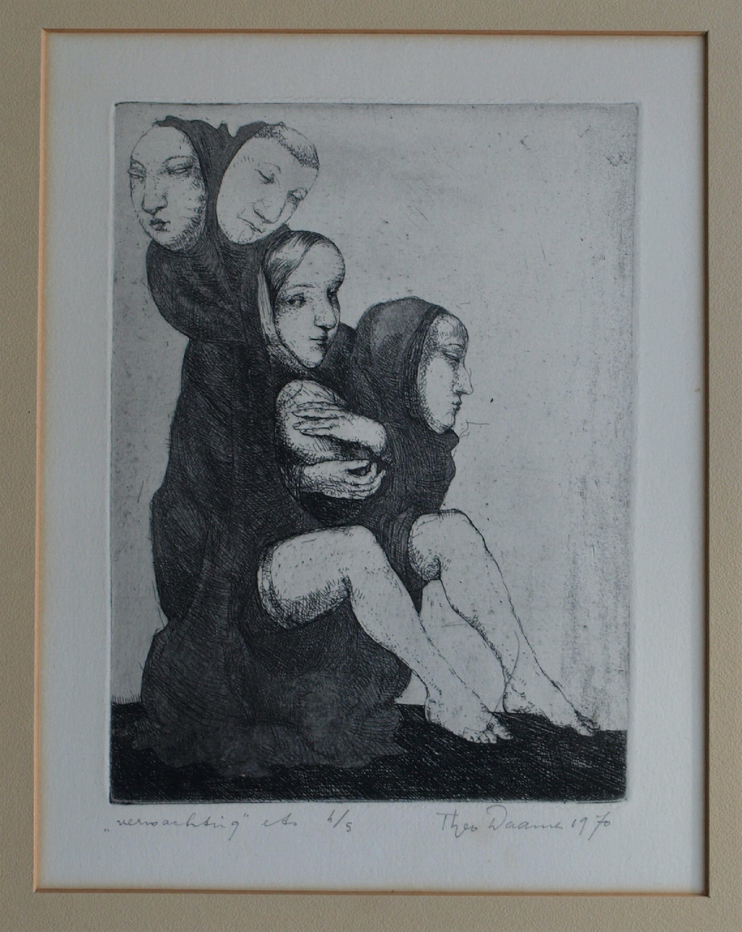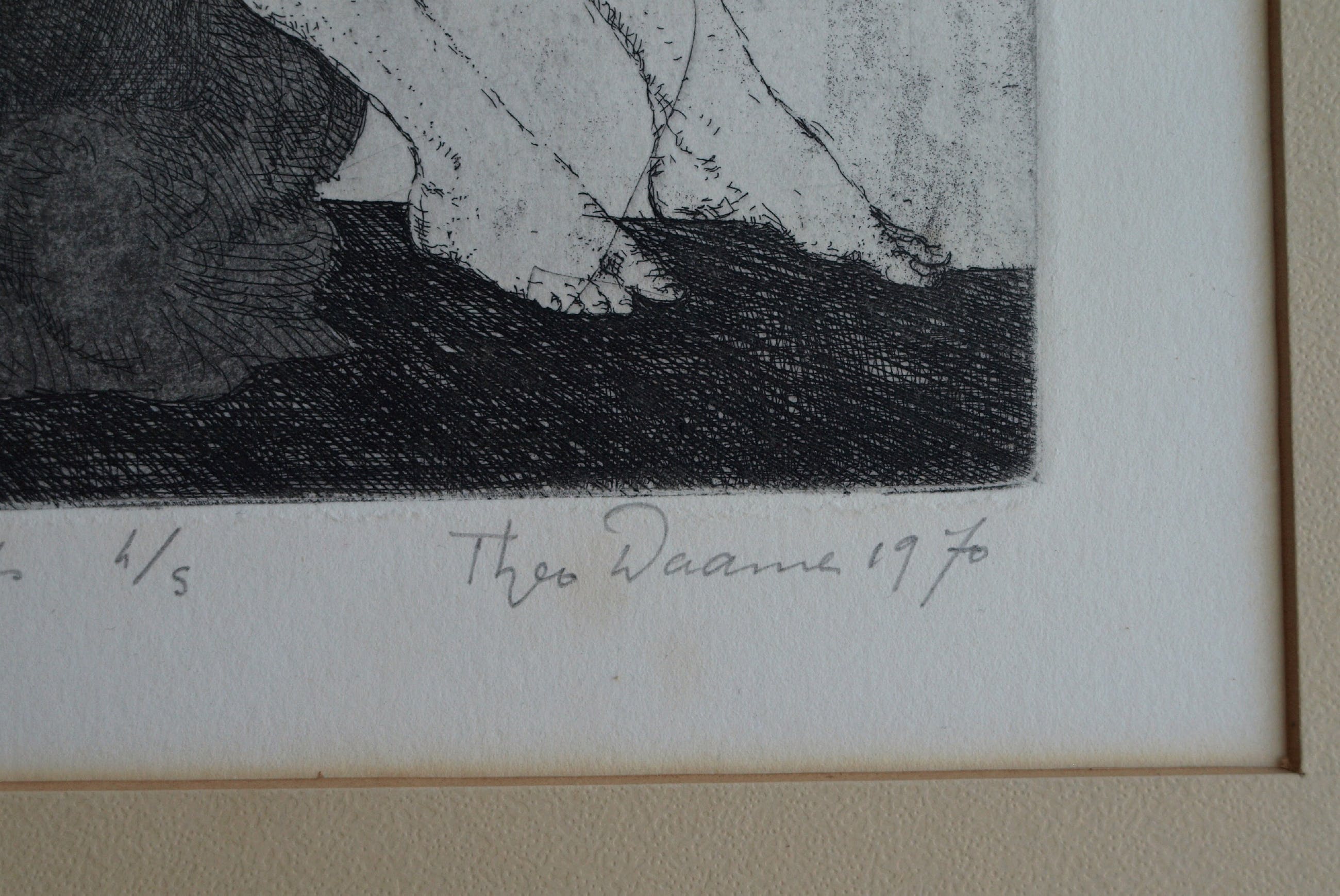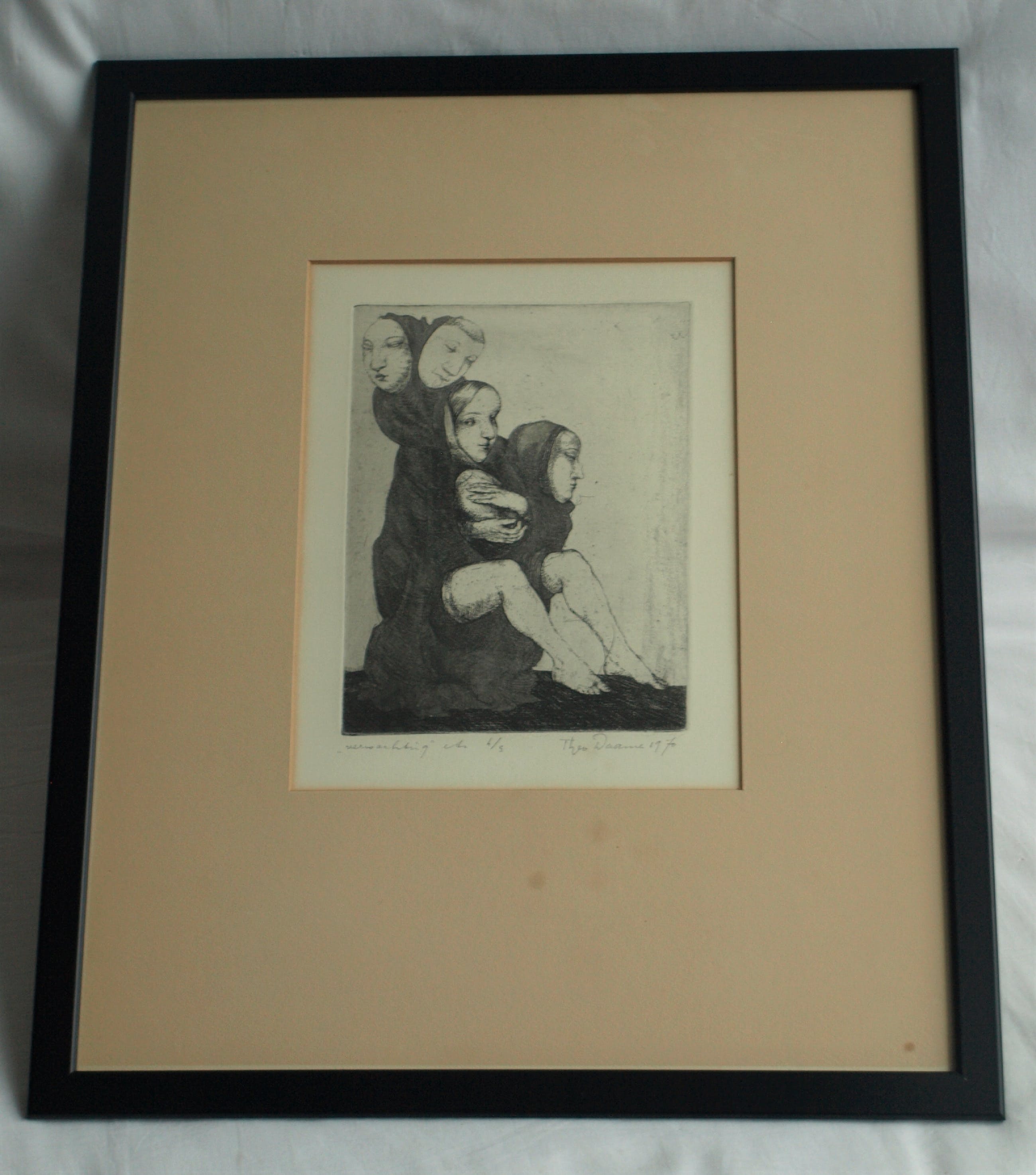 Een vroege ets uit 1970 van de Amsterdamse kunstenaar Theo Daamen (1939-2021) , getiteld “Verwachting”. -Gesigneerd, gedateerd, getiteld en genummerd met potlood. Nr 4 van de kleine oplage van 5. -De ets zit achter het originele passe-partout en is ingelijst in een eenvoudige zwarte lijst met plexiglasplaat. -Afmetingen: Lijst, 53,5 x 43,5 cm. Beeld / ets, 22 x 16 cm. -Herkomst: Uit een particuliere kunstverzameling. -Conditie: De ets is in goede staat. Het papier is licht vergeeld. Het passe-partout is vergeeld en heeft vlekjes. Zie ook de foto’s voor een eigen indruk. Kan zo aan de muur.