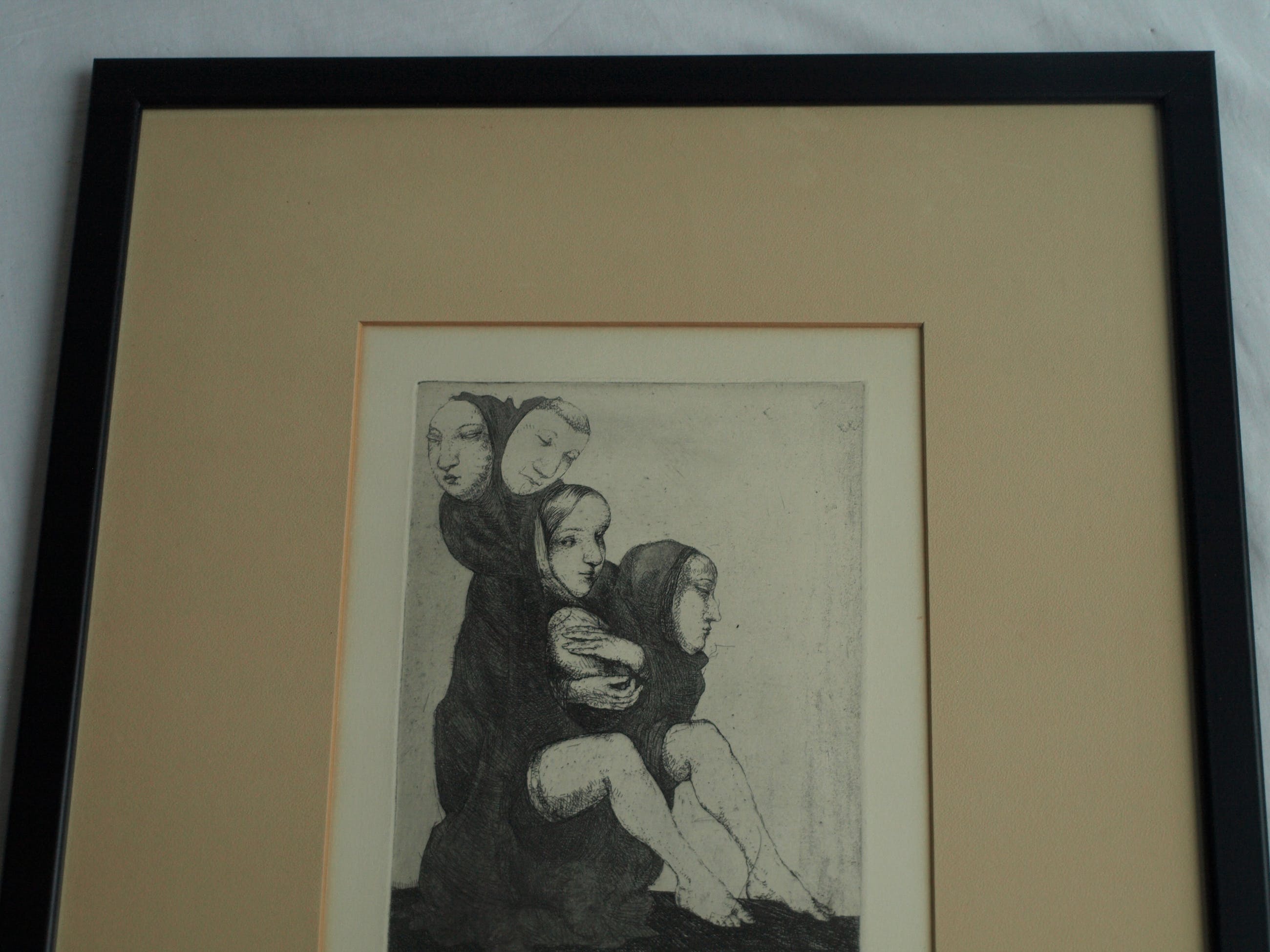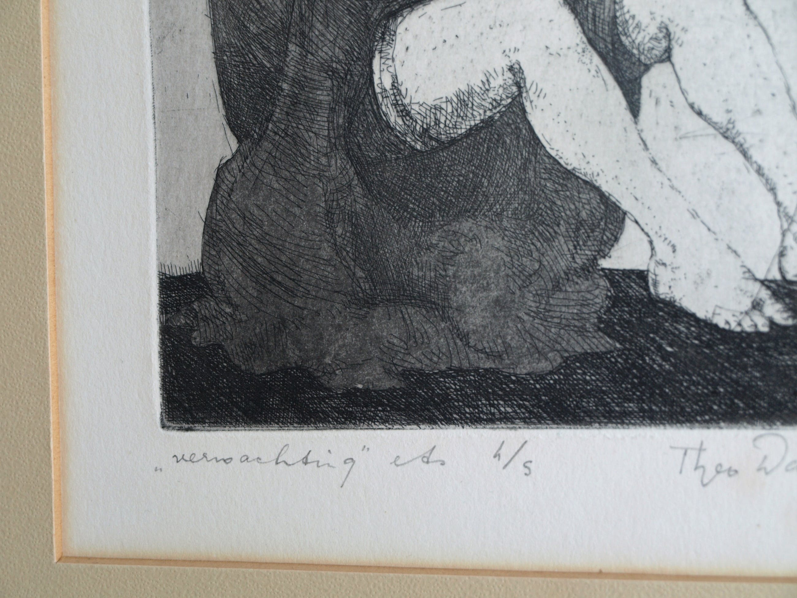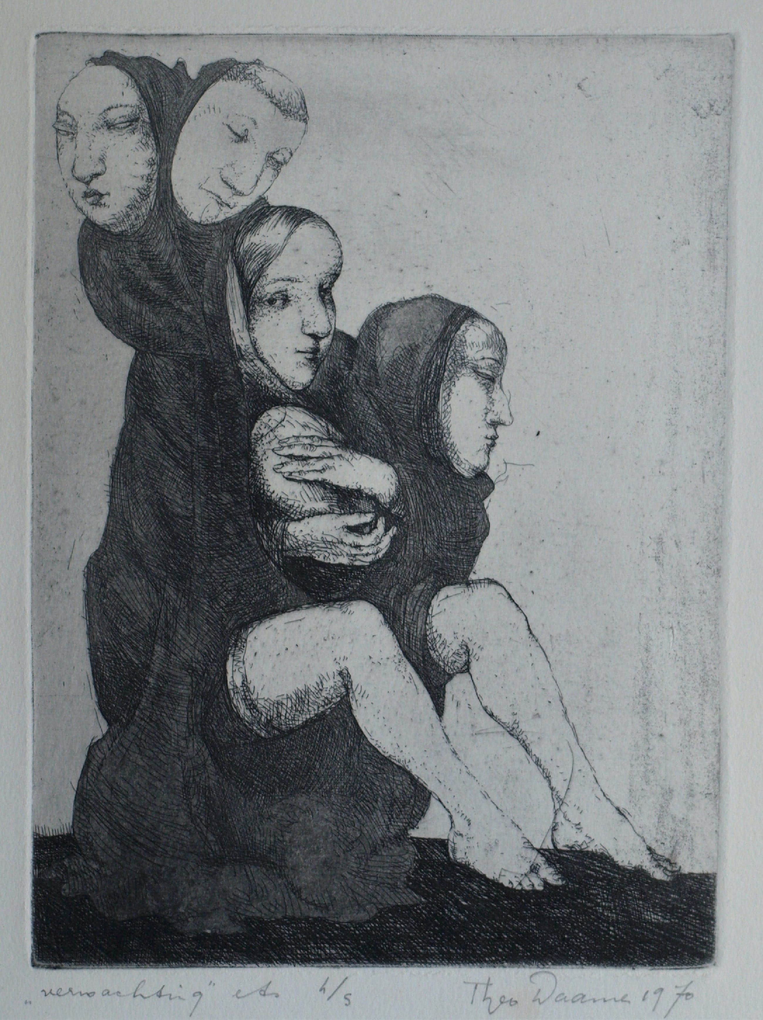 Een vroege ets uit 1970 van de Amsterdamse kunstenaar Theo Daamen (1939-2021) , getiteld “Verwachting”. -Gesigneerd, gedateerd, getiteld en genummerd met potlood. Nr 4 van de kleine oplage van 5. -De ets zit achter het originele passe-partout en is ingelijst in een eenvoudige zwarte lijst met plexiglasplaat. -Afmetingen: Lijst, 53,5 x 43,5 cm. Beeld / ets, 22 x 16 cm. -Herkomst: Uit een particuliere kunstverzameling. -Conditie: De ets is in goede staat. Het papier is licht vergeeld. Het passe-partout is vergeeld en heeft vlekjes. Zie ook de foto’s voor een eigen indruk. Kan zo aan de muur.