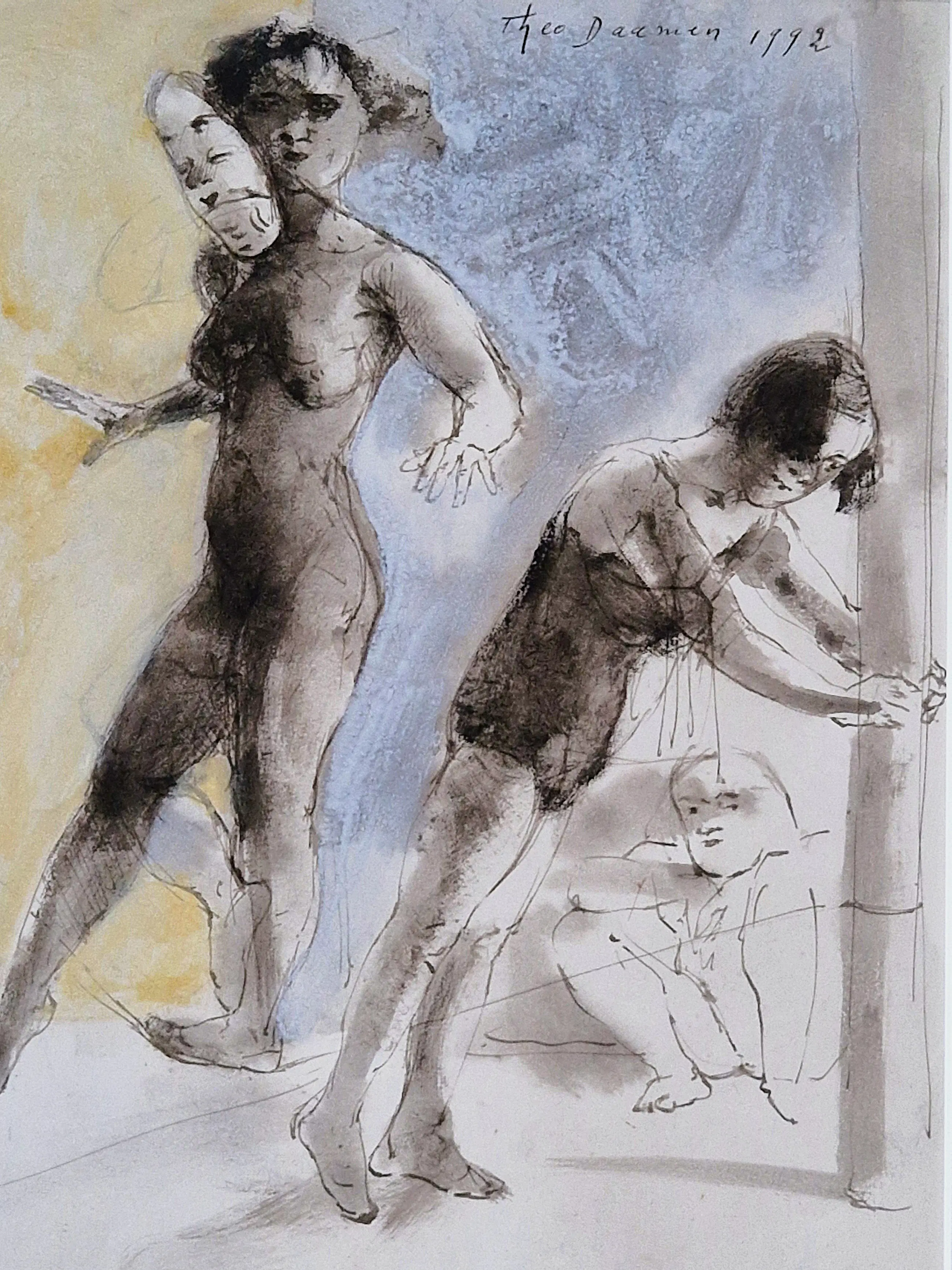 Theo Daamen is naast een goede schilder ook een bedreven graficus. Onderwerpen die herhaaldelijk terug keren in zijn werk zijn figuurvoorstellingen, portretten, en dieren. Theo Daamen, trouwde in 1963 met Heidi Daamen, die de tekenopleiding heeft gevolgd aan de Rijksnormaalschool te Amsterdam.