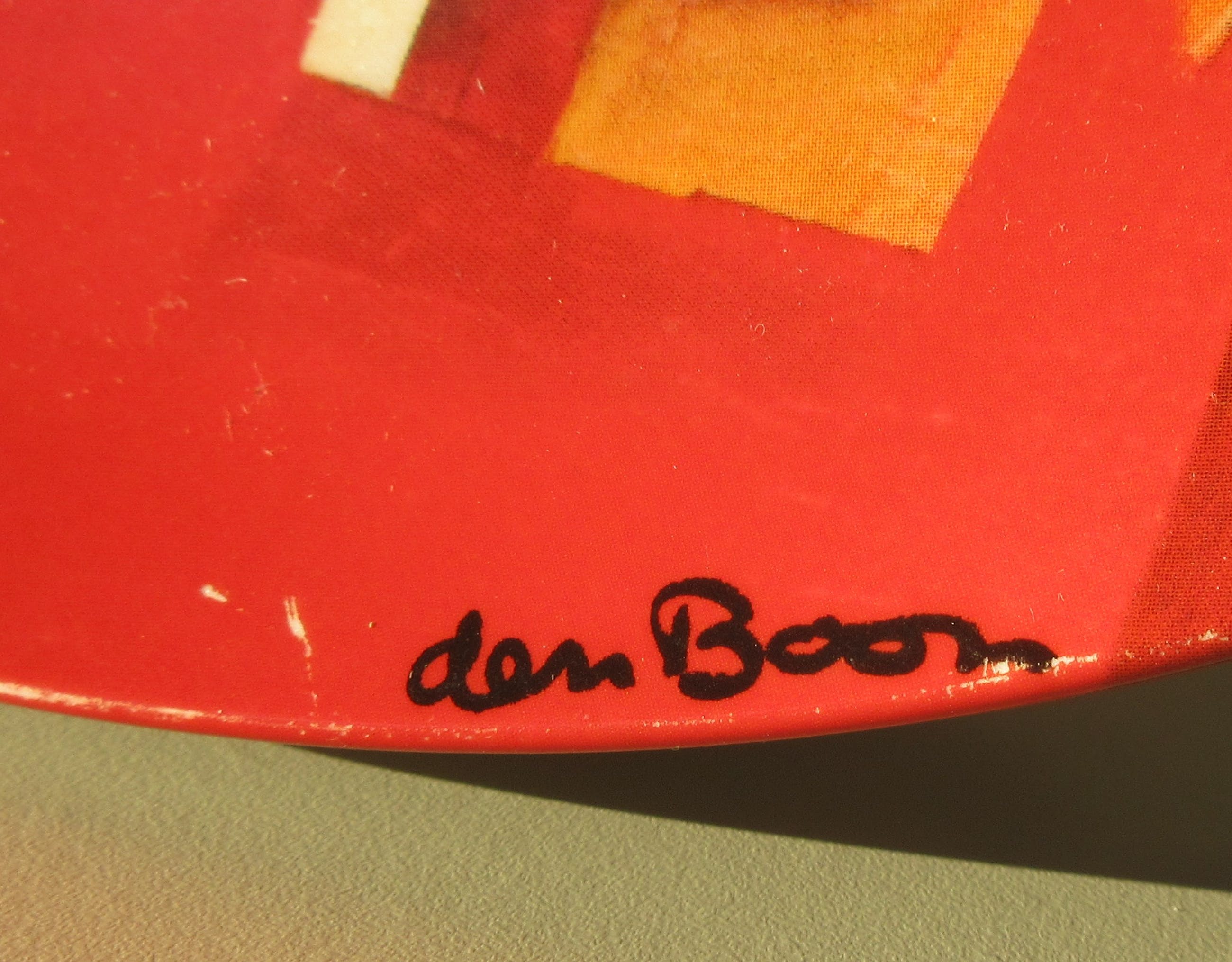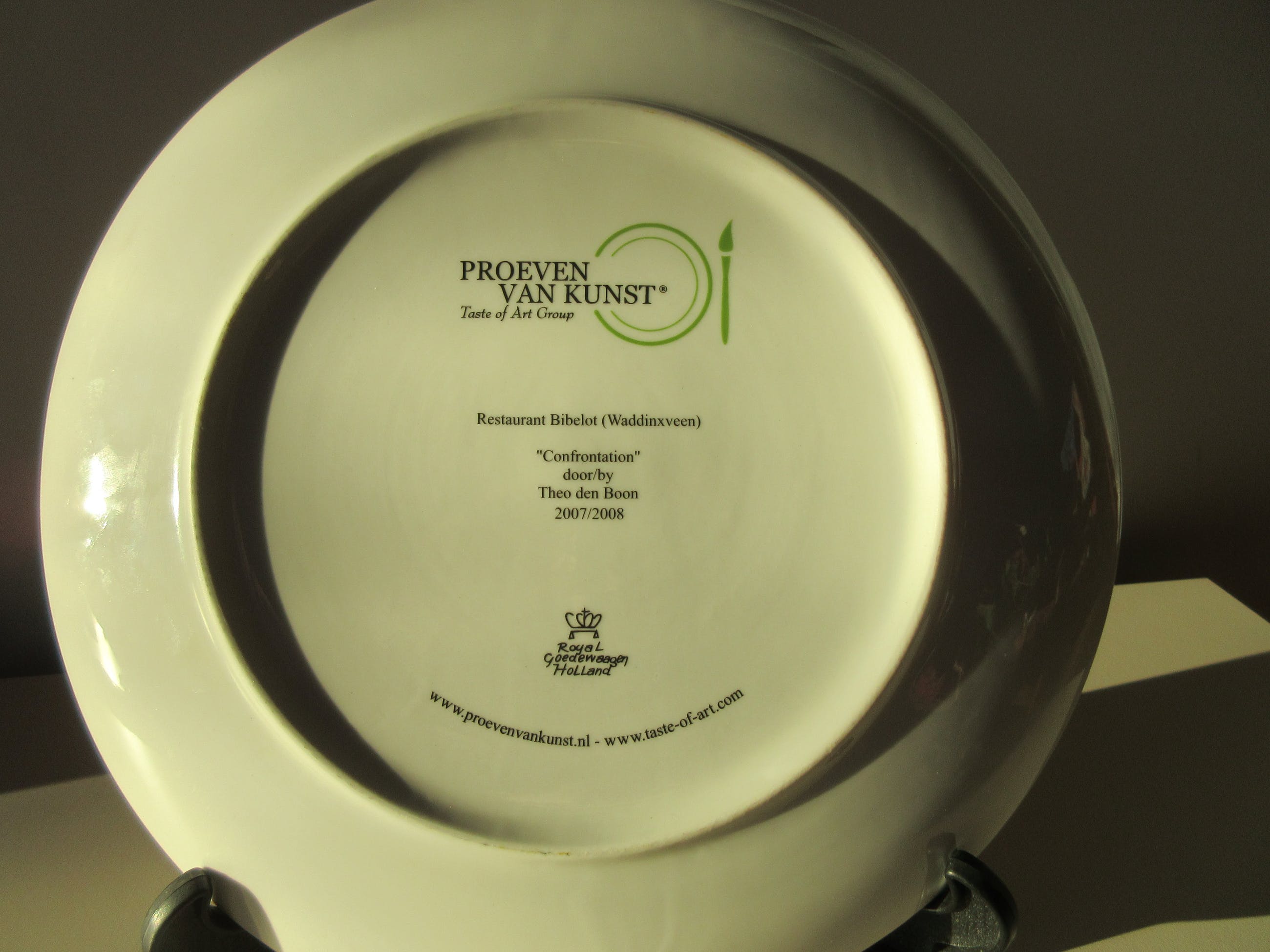 Platelen bord Confrontation - ontworpen door Theo den Boon in 2007-2008 in de serie Proeven van Kunst voor restaurant Bibelot in Waddinxveen. Het bord is uitgevoerd bij de Royal Goedewaagen. Aan de voorzijde is het bord gesigneerd en het is aan de achterzijde gemerkt en voorzien van jaartallen en allerlei tekst.