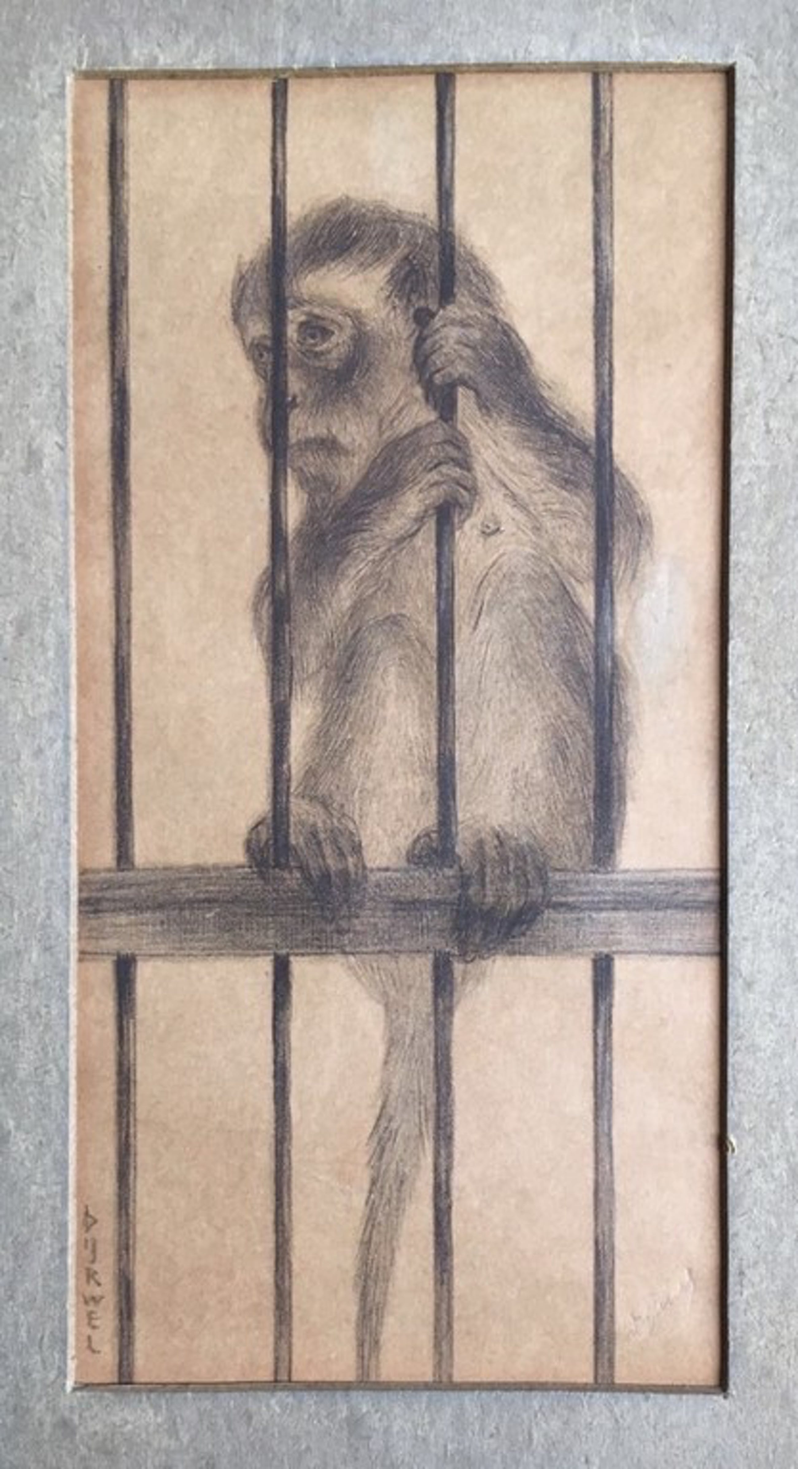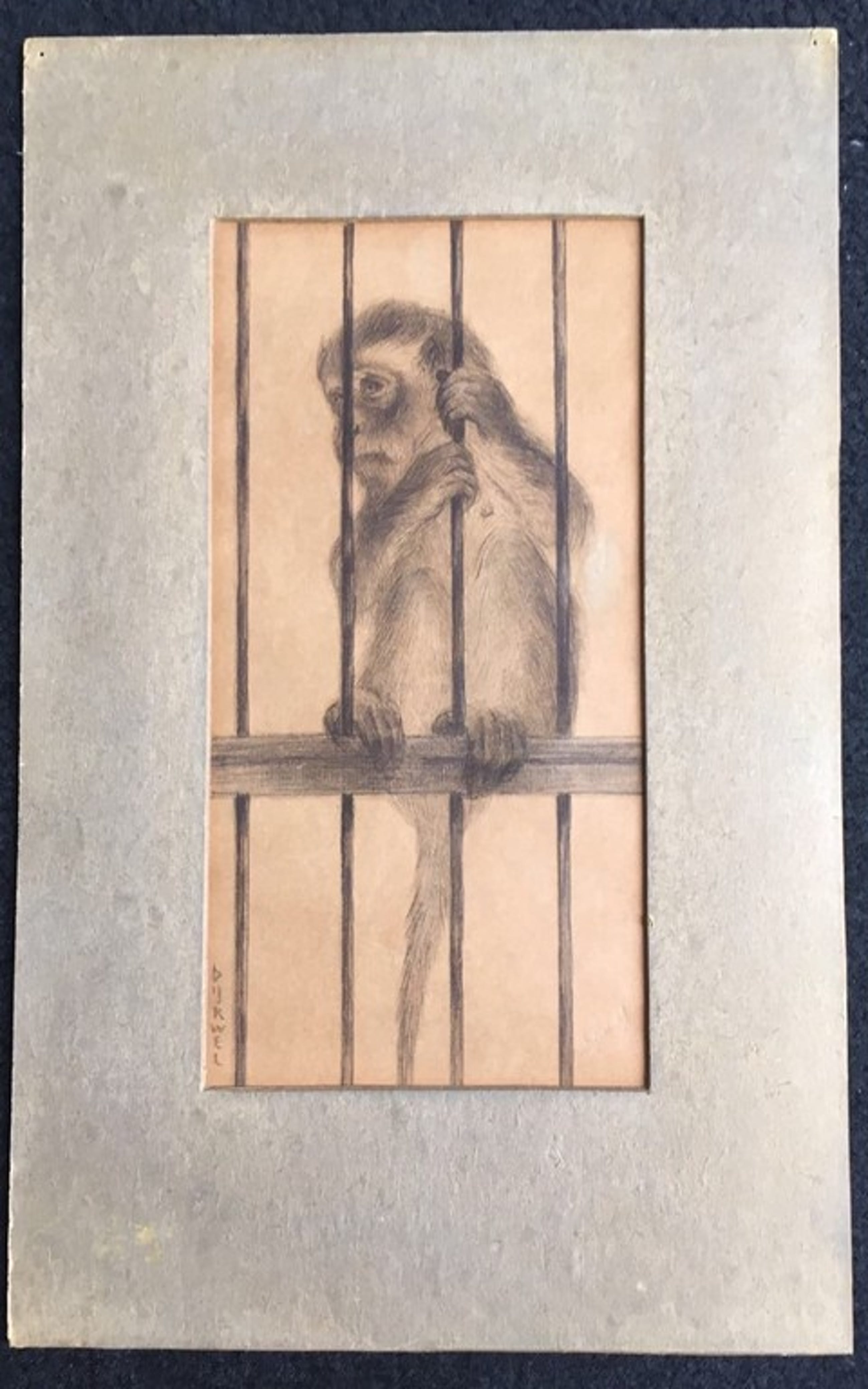 Leuke litho van een aapje. Hoogstwaarschijnlijk gemaakt in Artis. Deze betreffende voorstelling had ik nog niet eerder gezien. Achter een passe-partout geplakt en de litho heeft een schoonmaakbeurtje nodig. Beeldmaat 11,5 cm x 23 cm.