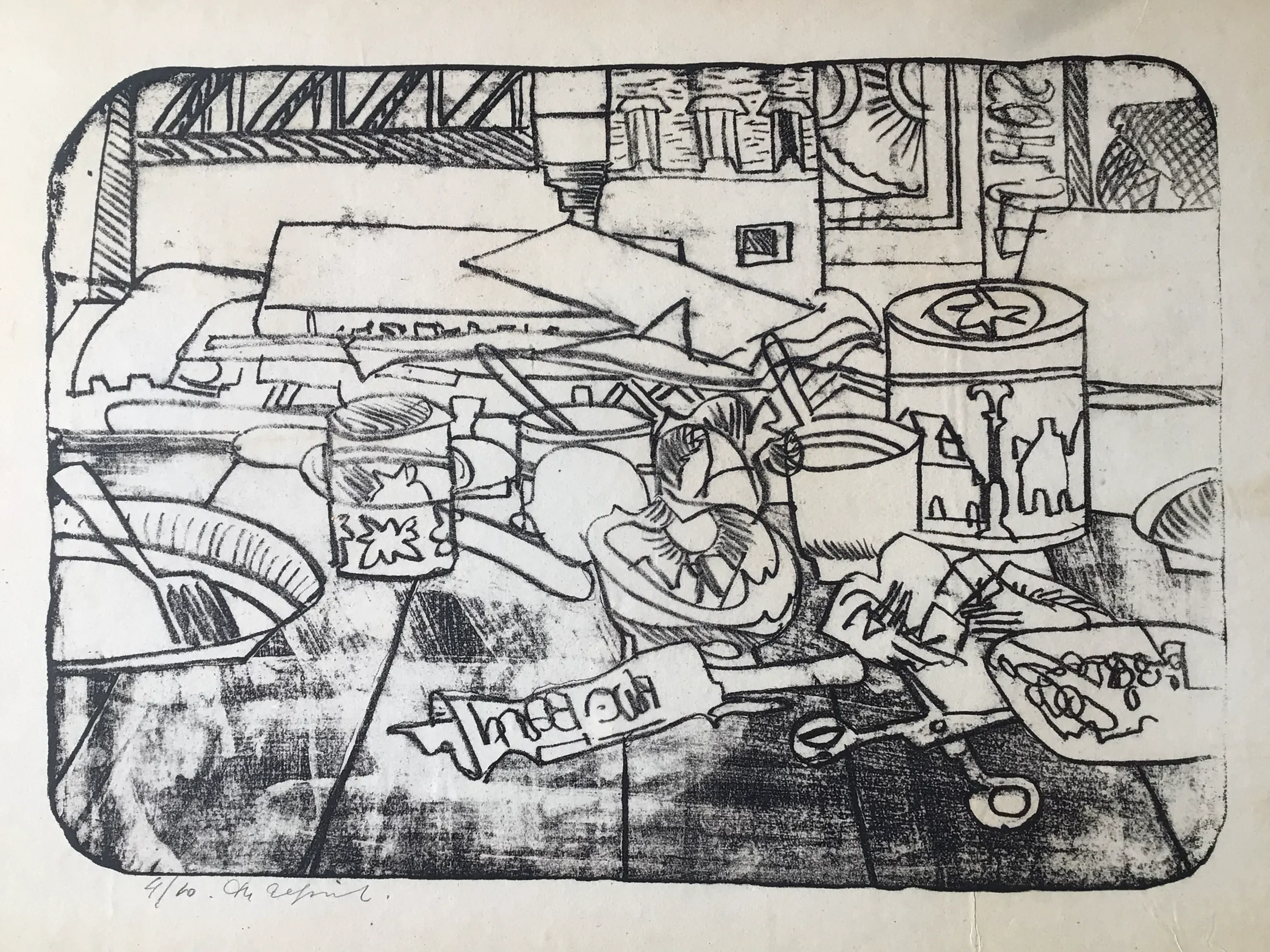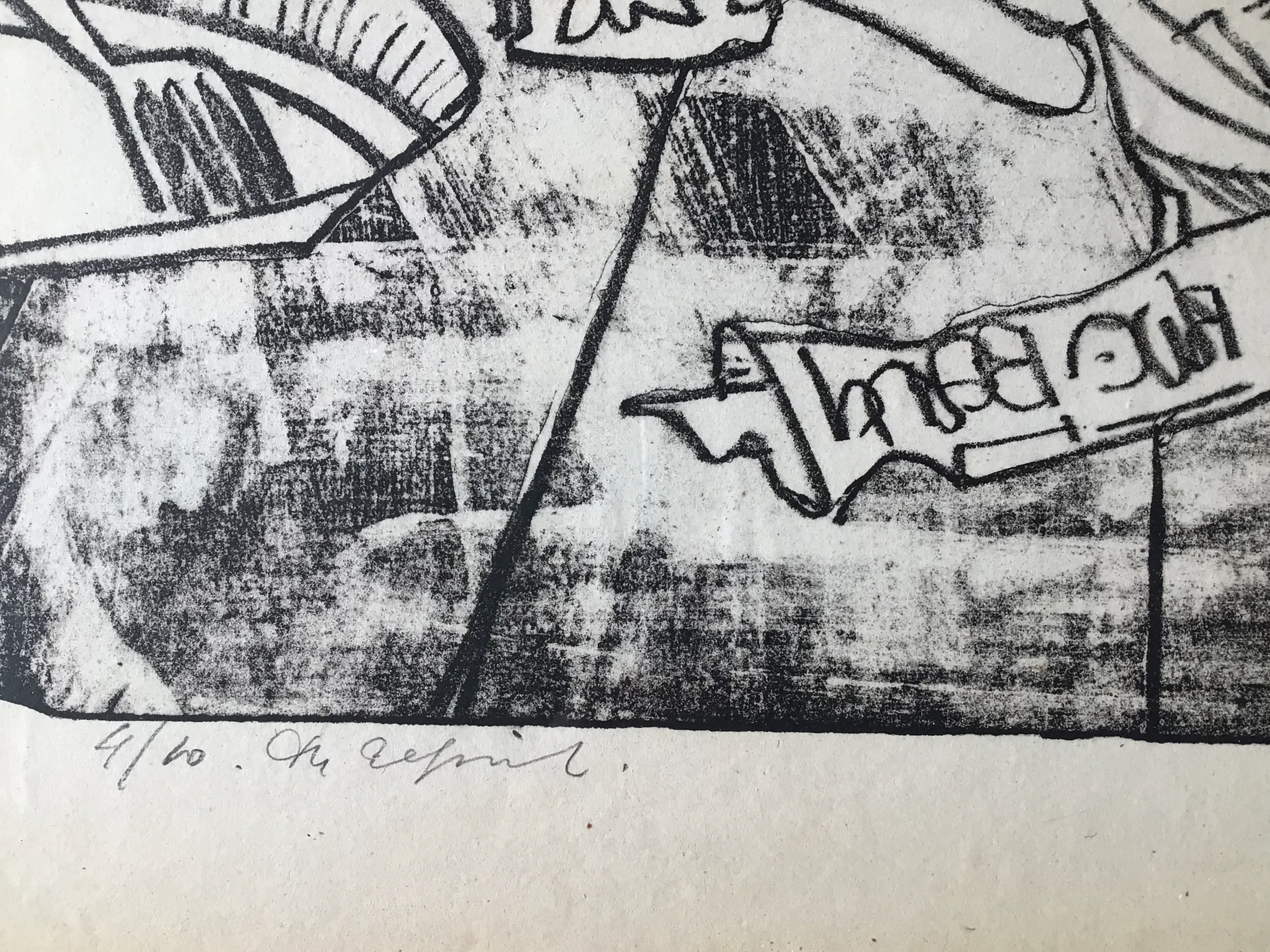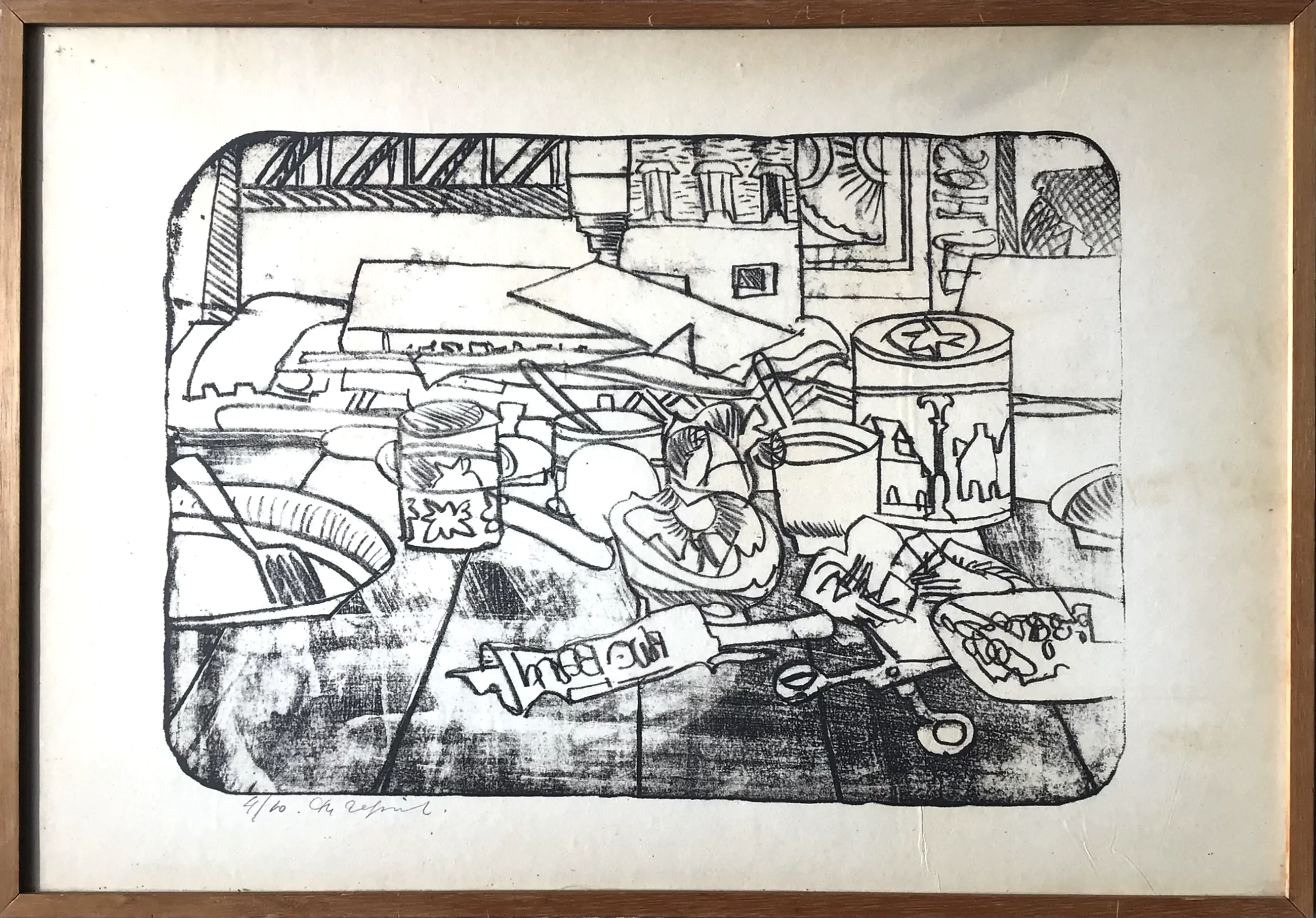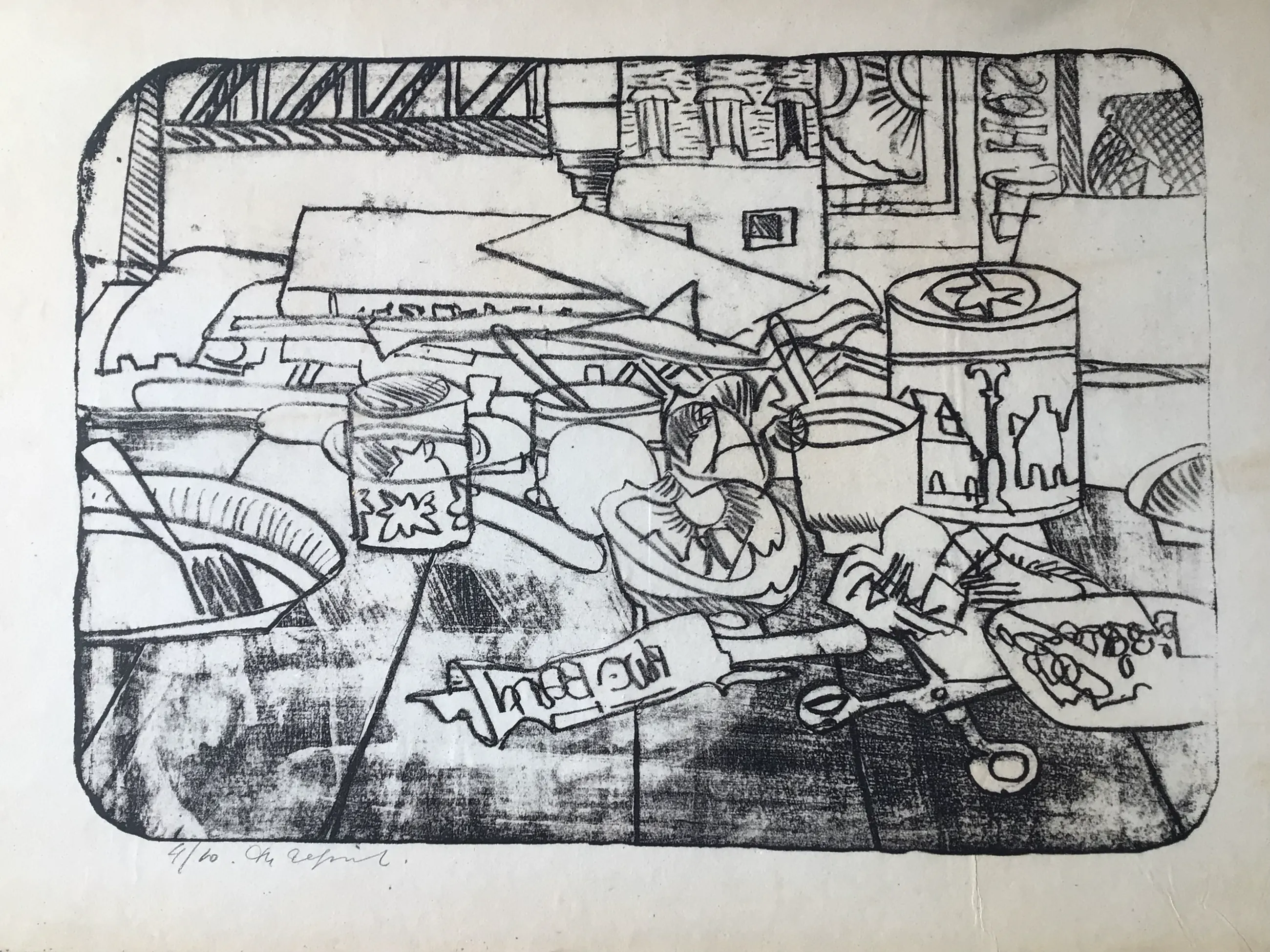 Lithografie Theo Elfrink. Onderwerp: zijn atelier met uitzicht op spoorbrug.
