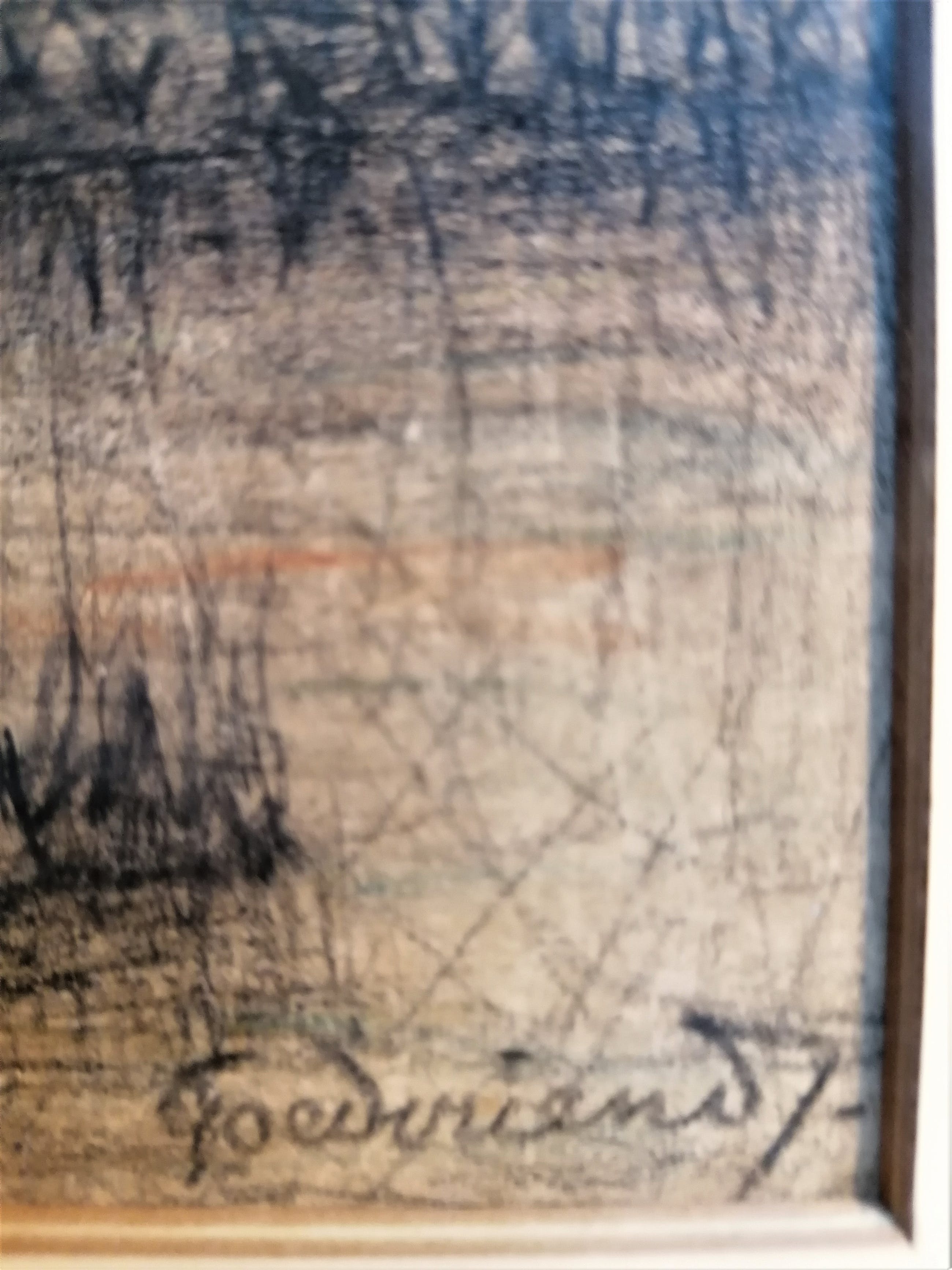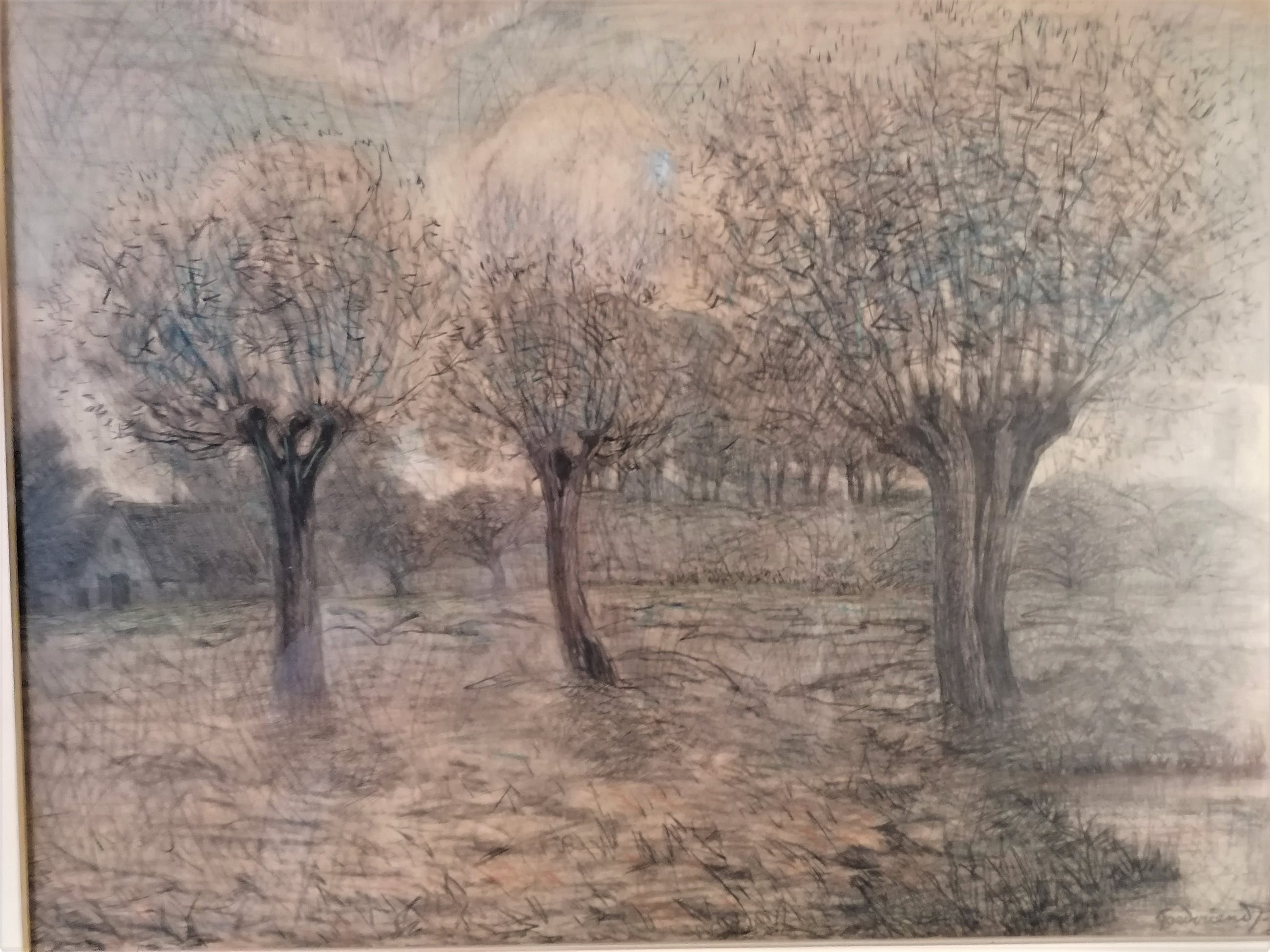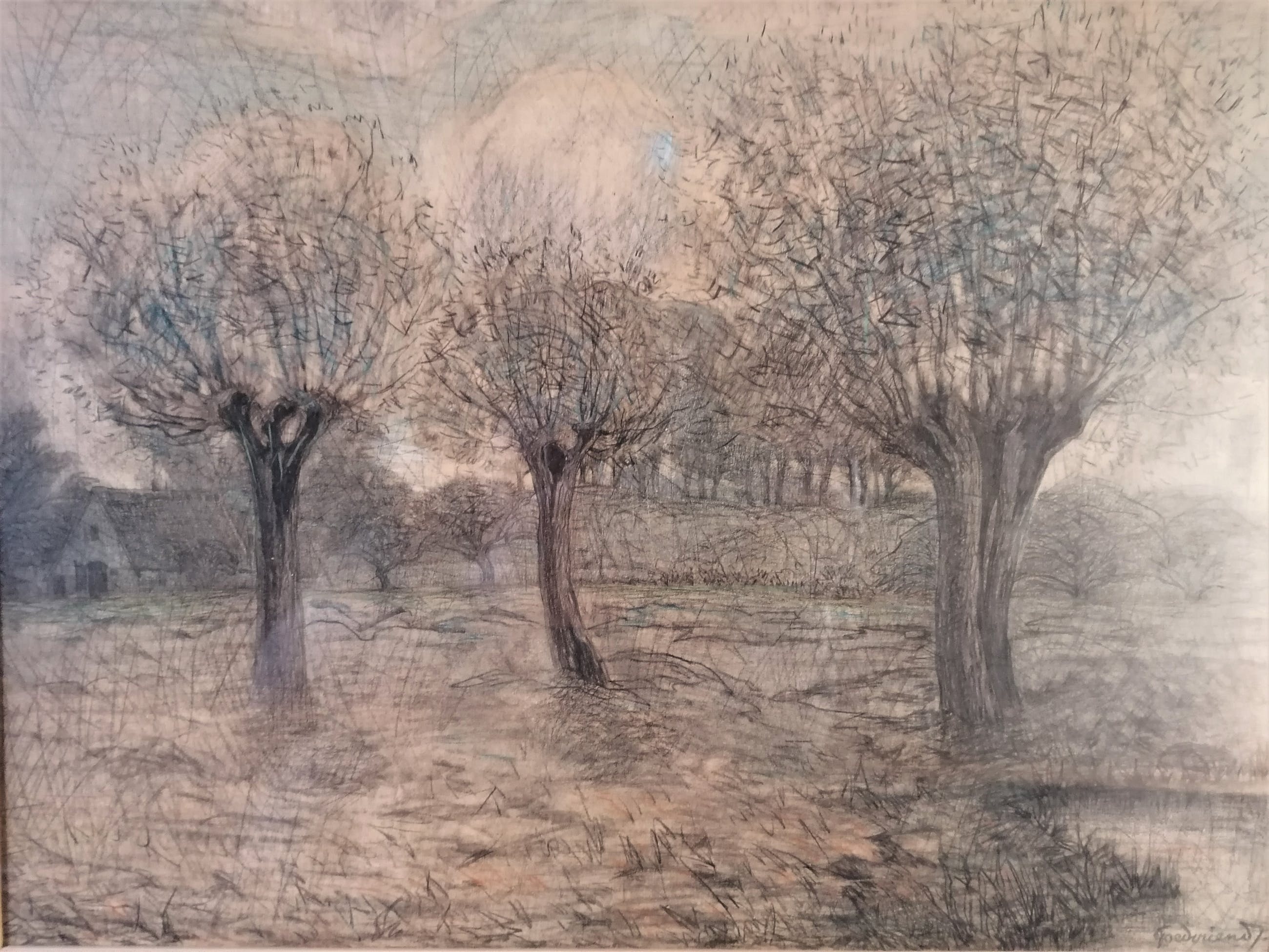 Dit werk betreft een krijttekening. Voorstellende: Knotwilgen in het landschap. Gesigneerd aan de rechter onderzijde. De afmetingen van de krijttekening zijn: 43 cm x 33 cm. De tekening is geplaatst in een passe-partout en deze is vervolgens ingelijst en voorzien van glas. Inclusief de lijst zijn de afmetingen: 61 cm x 51 cm.