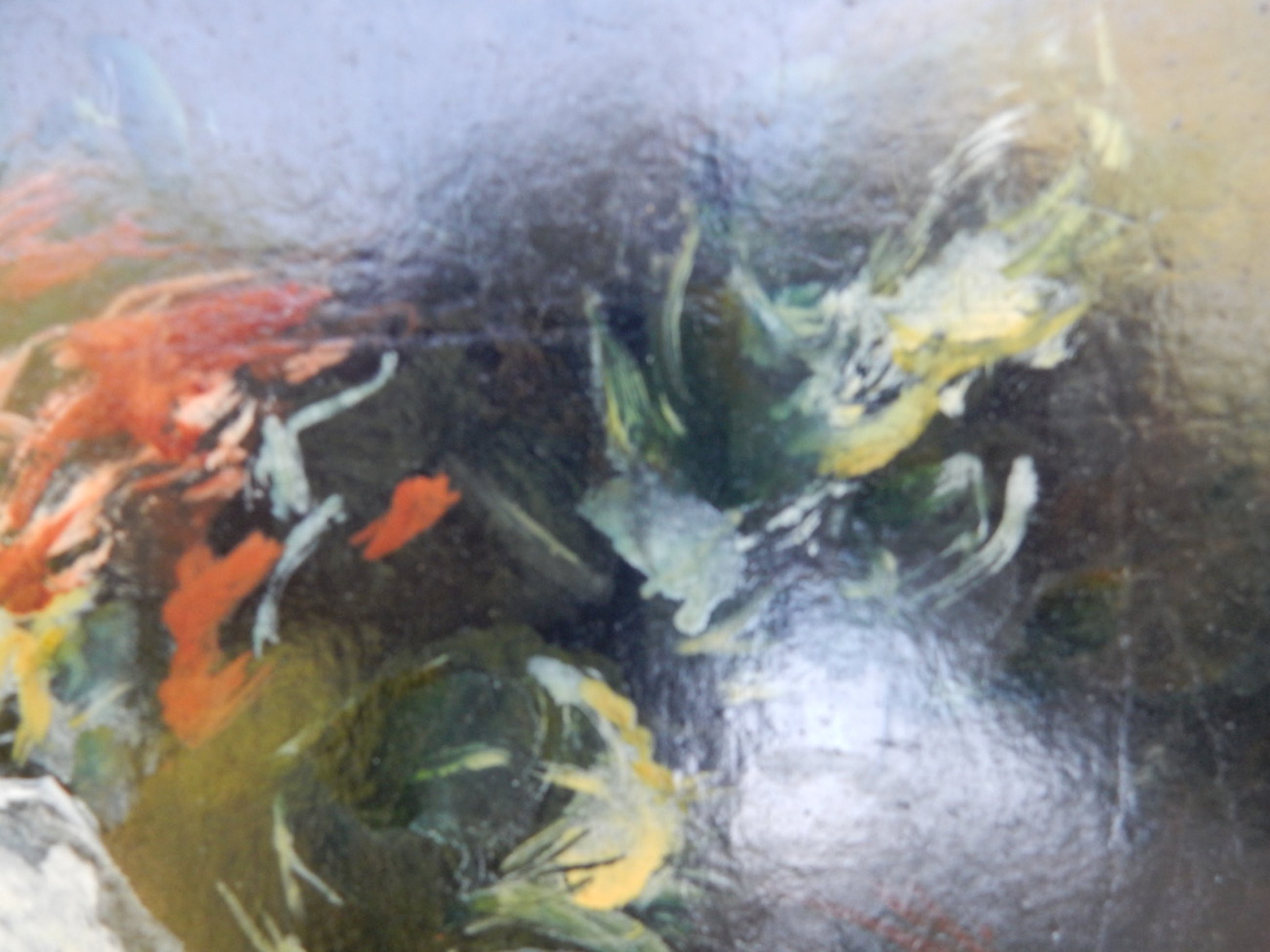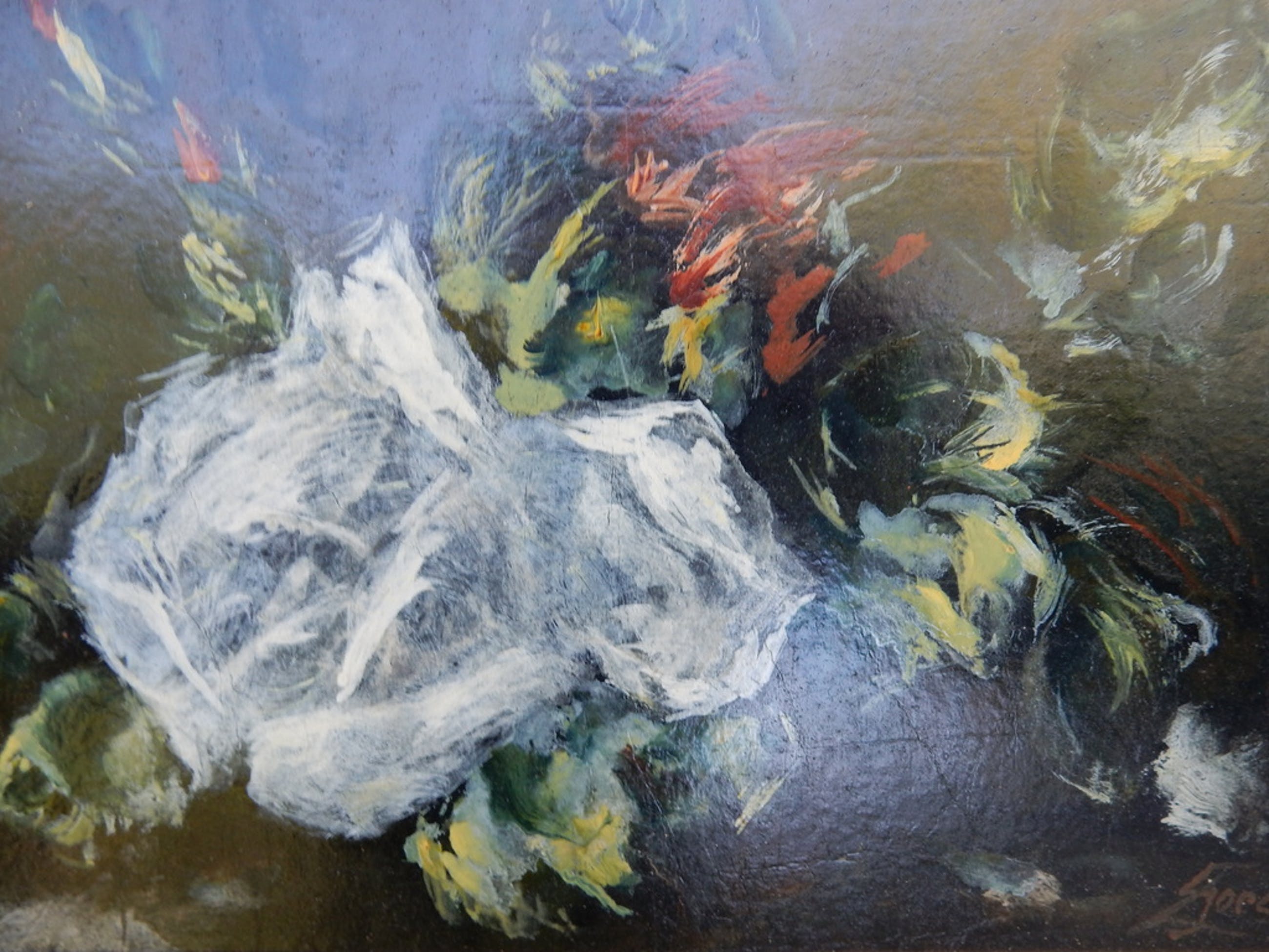 Dit werk: Stilleven met bloemen, olieverf op schilderskarton, r.o. gesigneerd.