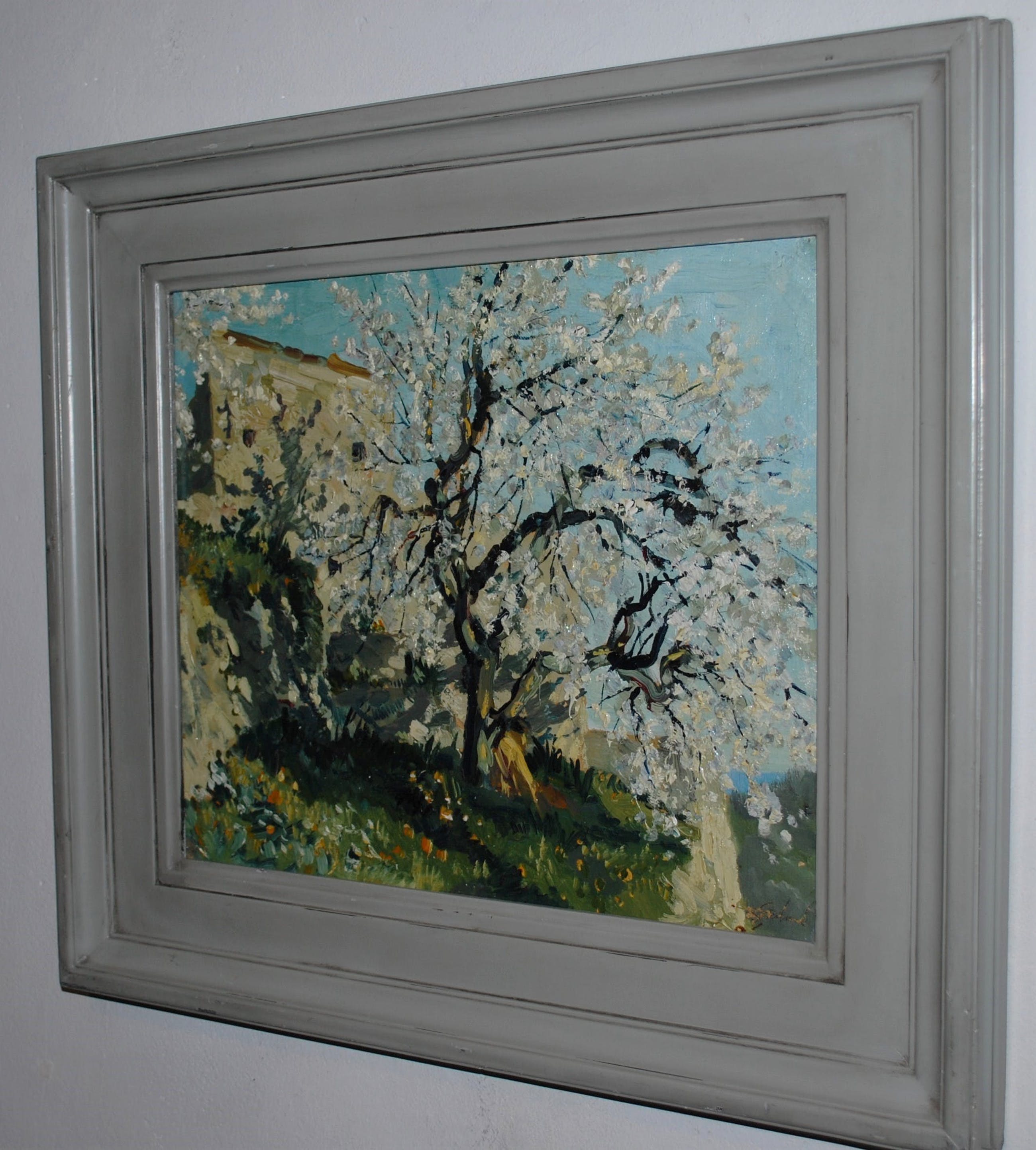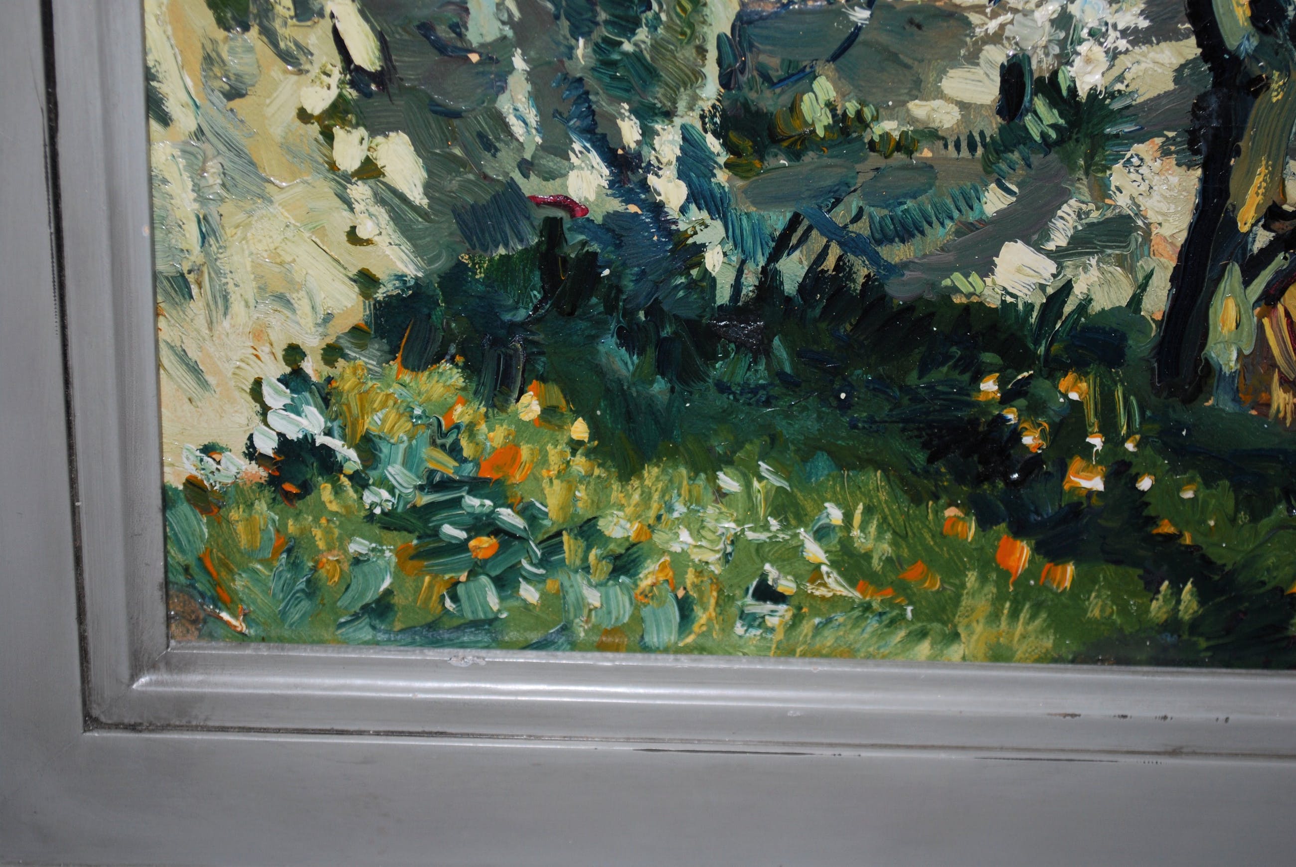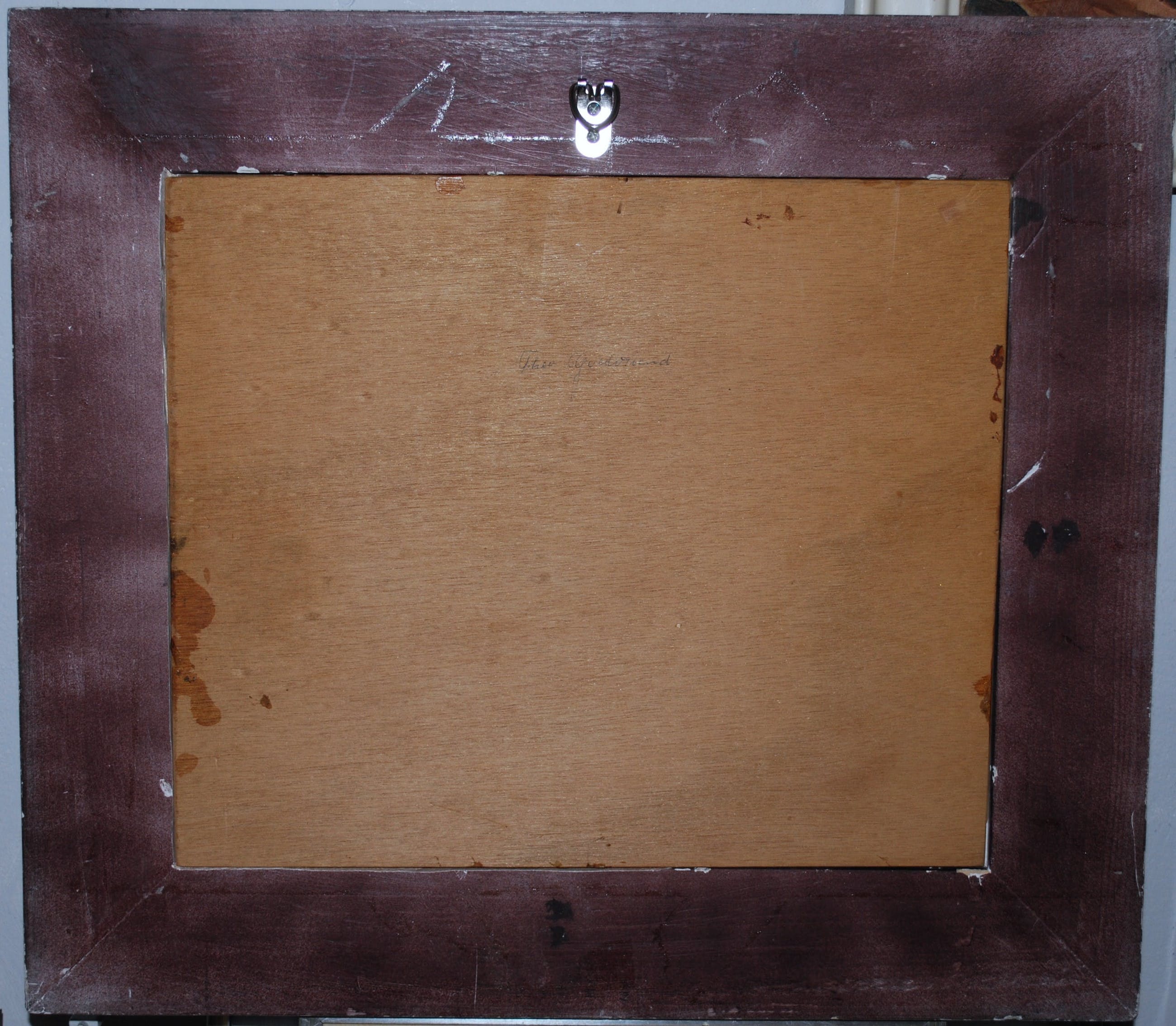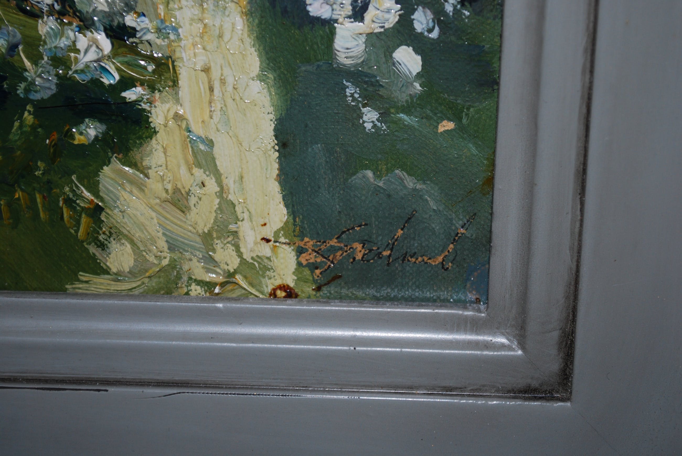 olieverf op olieverfpapier, bevestigd op triplex. Het werk is zeer waarschijnlijk 'plein air' geschilderd, aangezien de hoeken en randen nog de punaisegaatjes hebben. Het werk heeft enkele kleine retouches. De laatste foto toont een vergelijkbaar werk welke te koop staat bij een bekende kunsthandel, de prijs liegt er niet om.