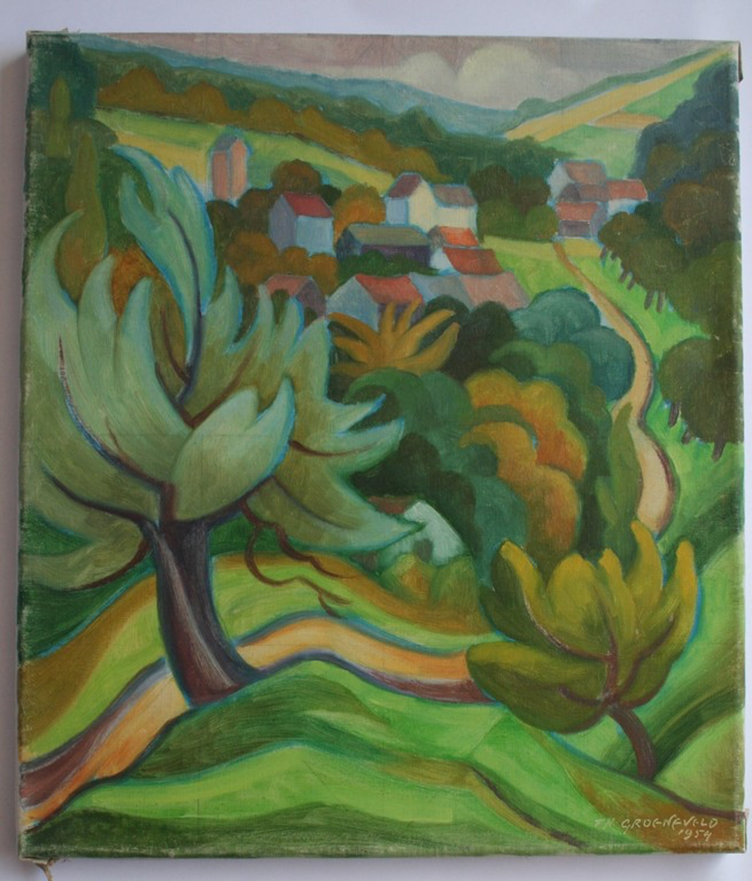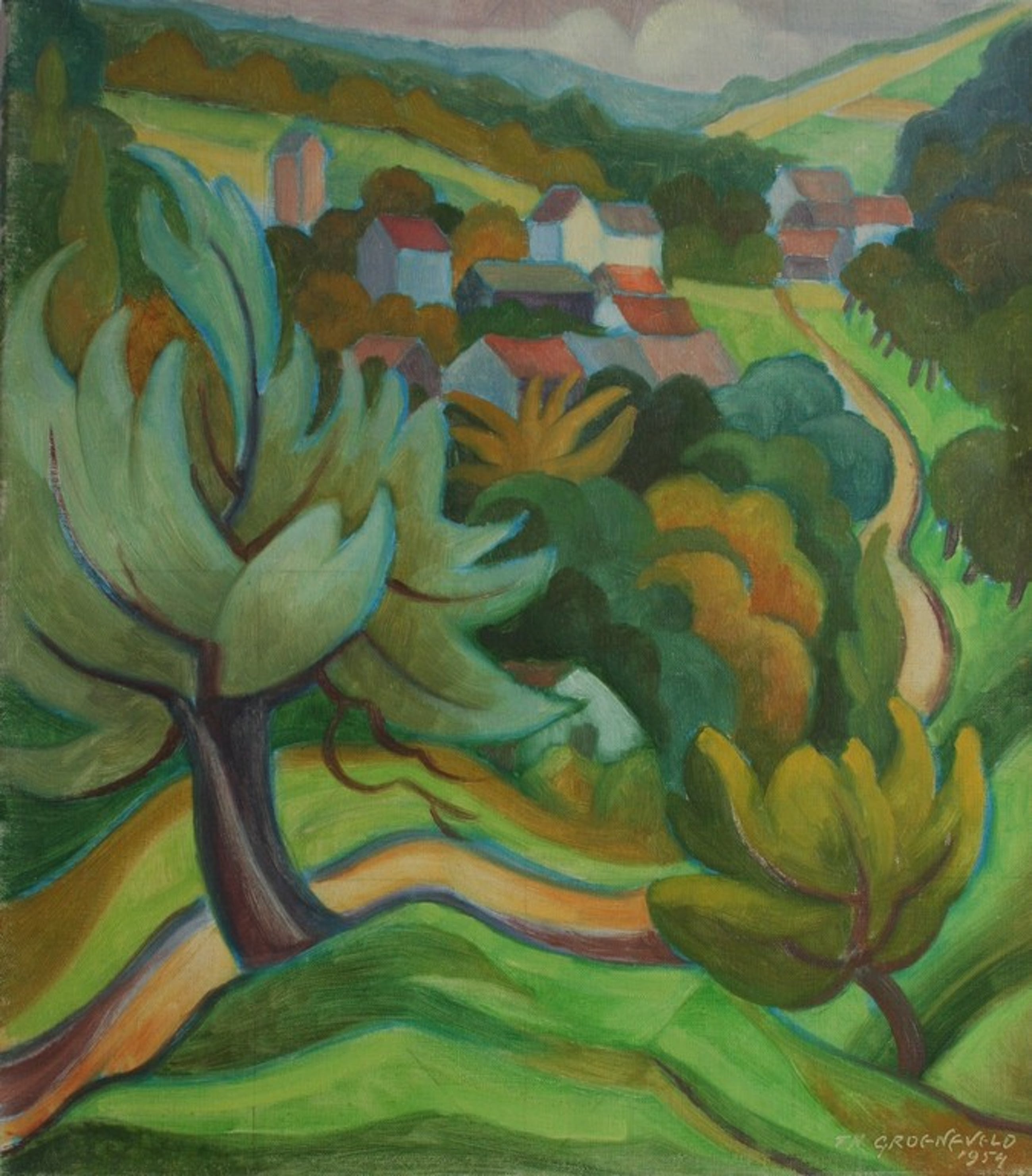 Olieverfschilderij van Theo Groeneveld zonder lijst. Titel Dorp in zuid Limburg (achterzijde). Gesigneerd. 1954.