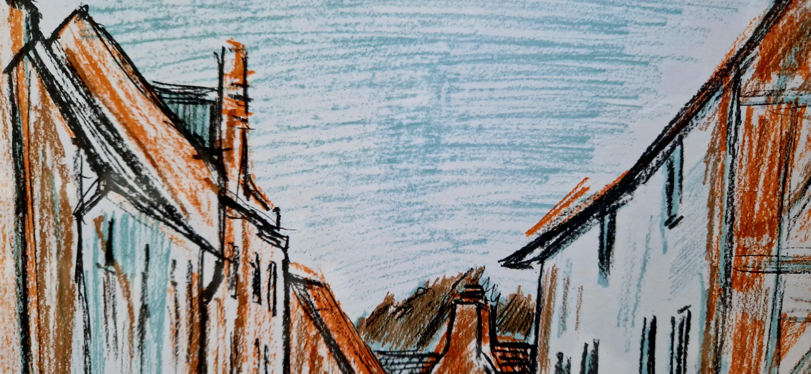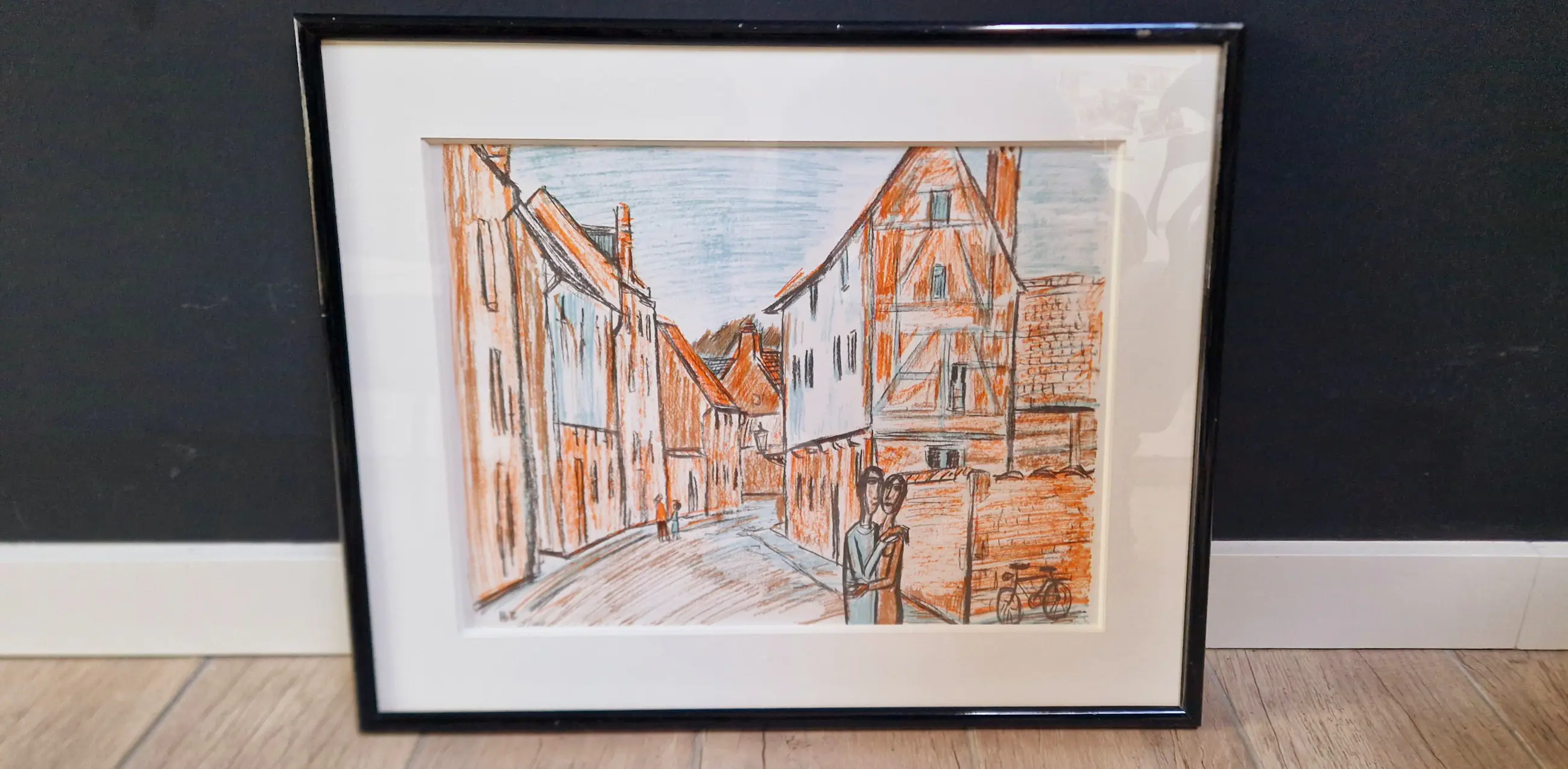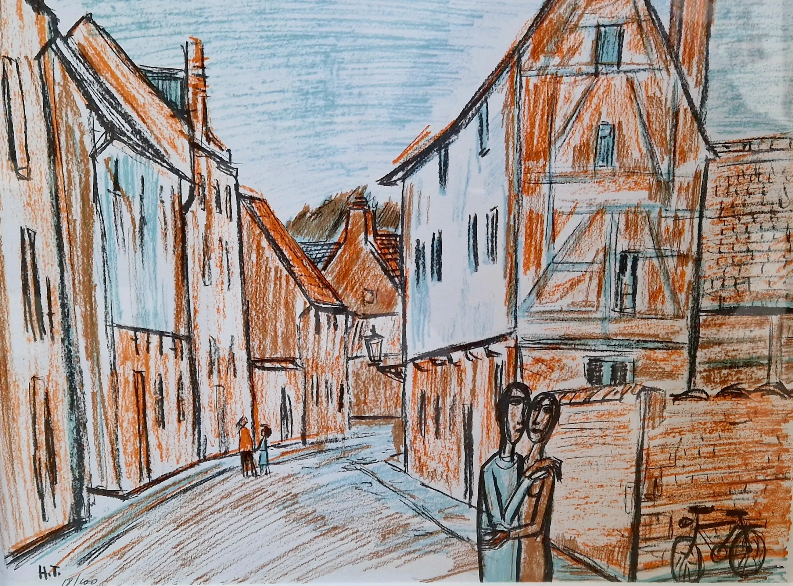 Ingekleurde ets van kunstenaar Theo Humblet, met een scène in wellicht het Groot Begijnhof in Leuven.