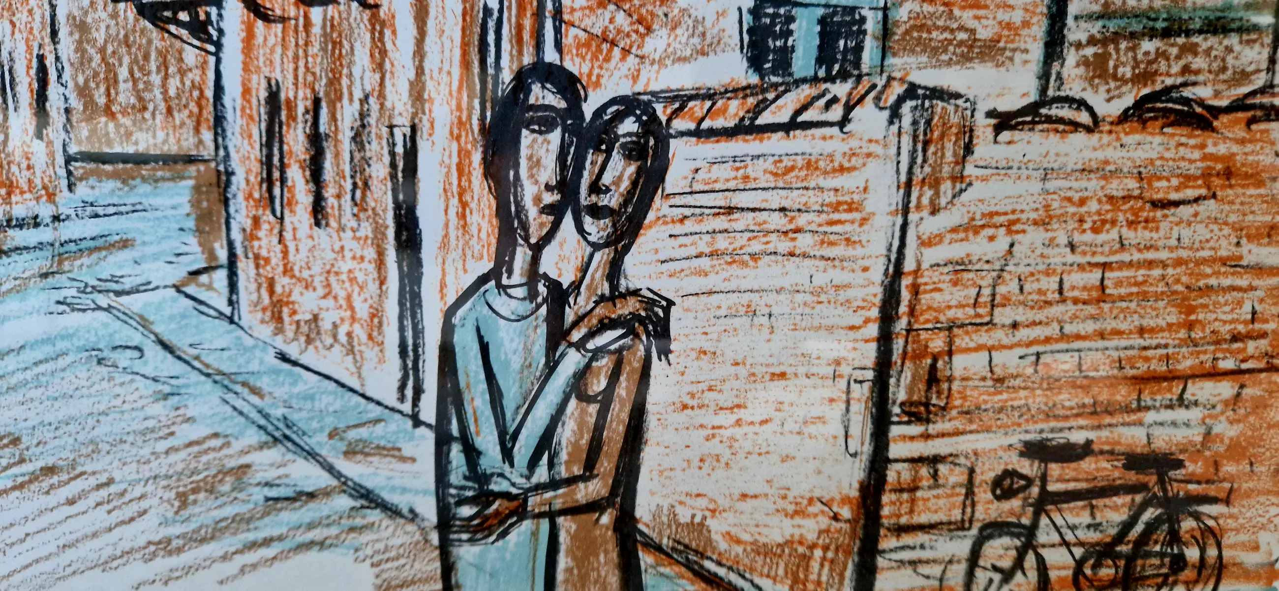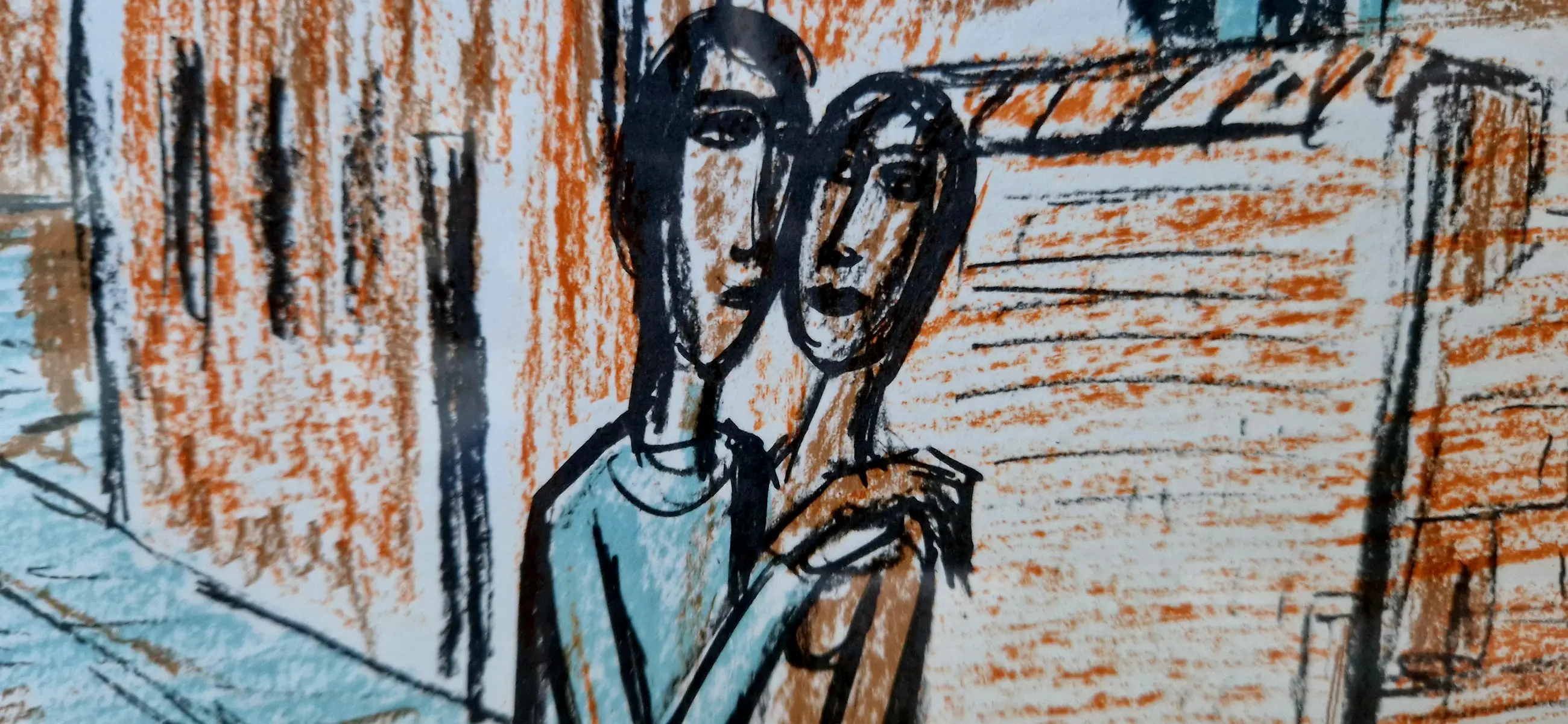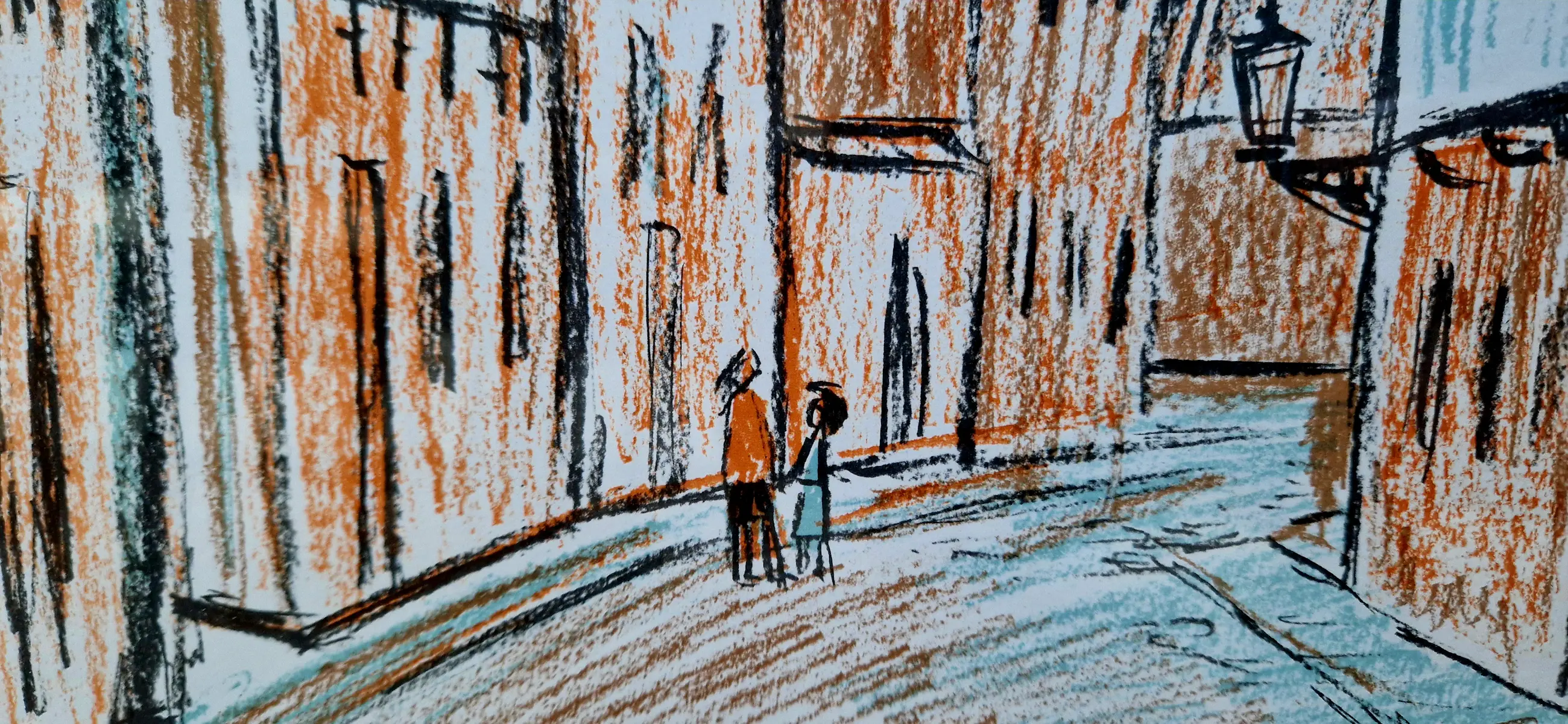 Ingekleurde ets van kunstenaar Theo Humblet, met een scène in wellicht het Groot Begijnhof in Leuven.