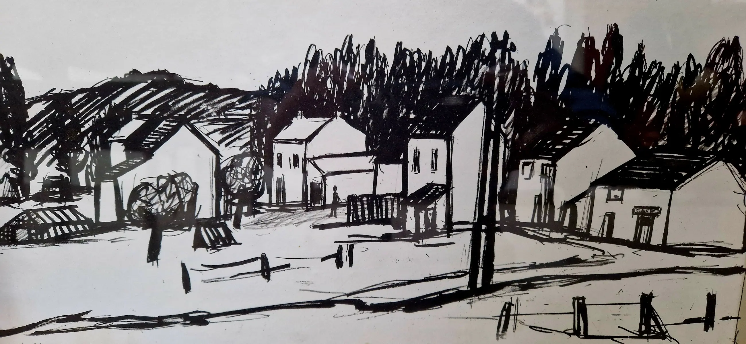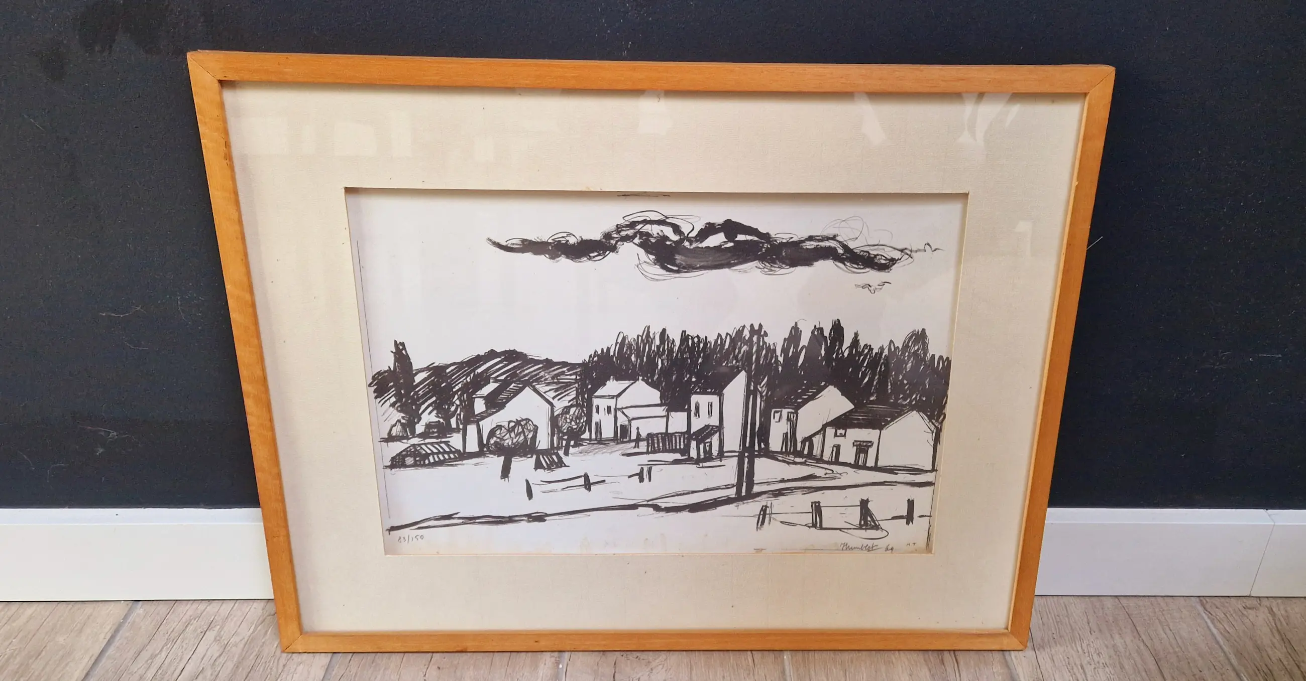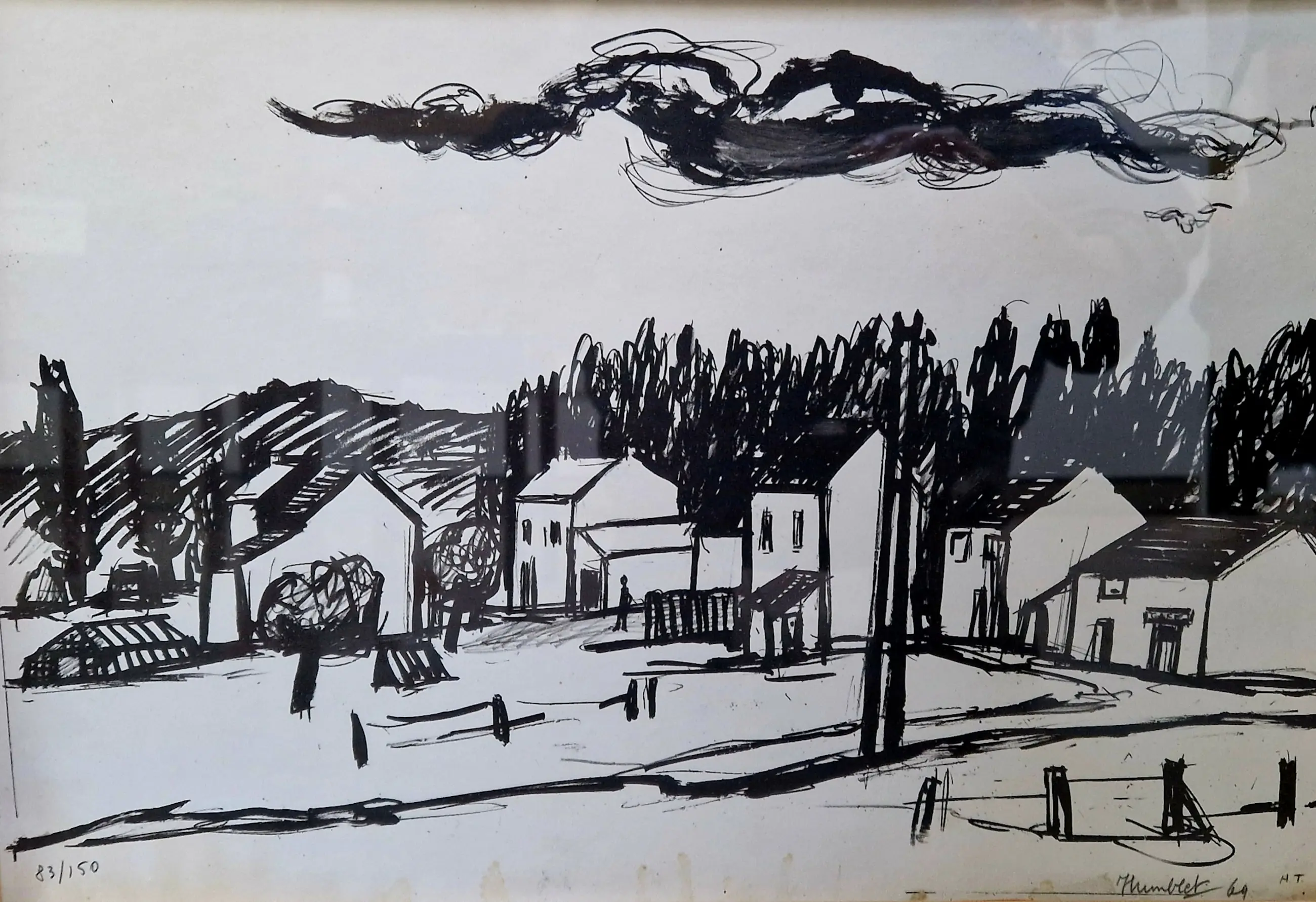Fraaie inktdruk van kunstenaar Theo Humblet uit 1969 van een ruraal landschap, wellicht in zijn geliefd Veltem, Vlaams-Brabant.