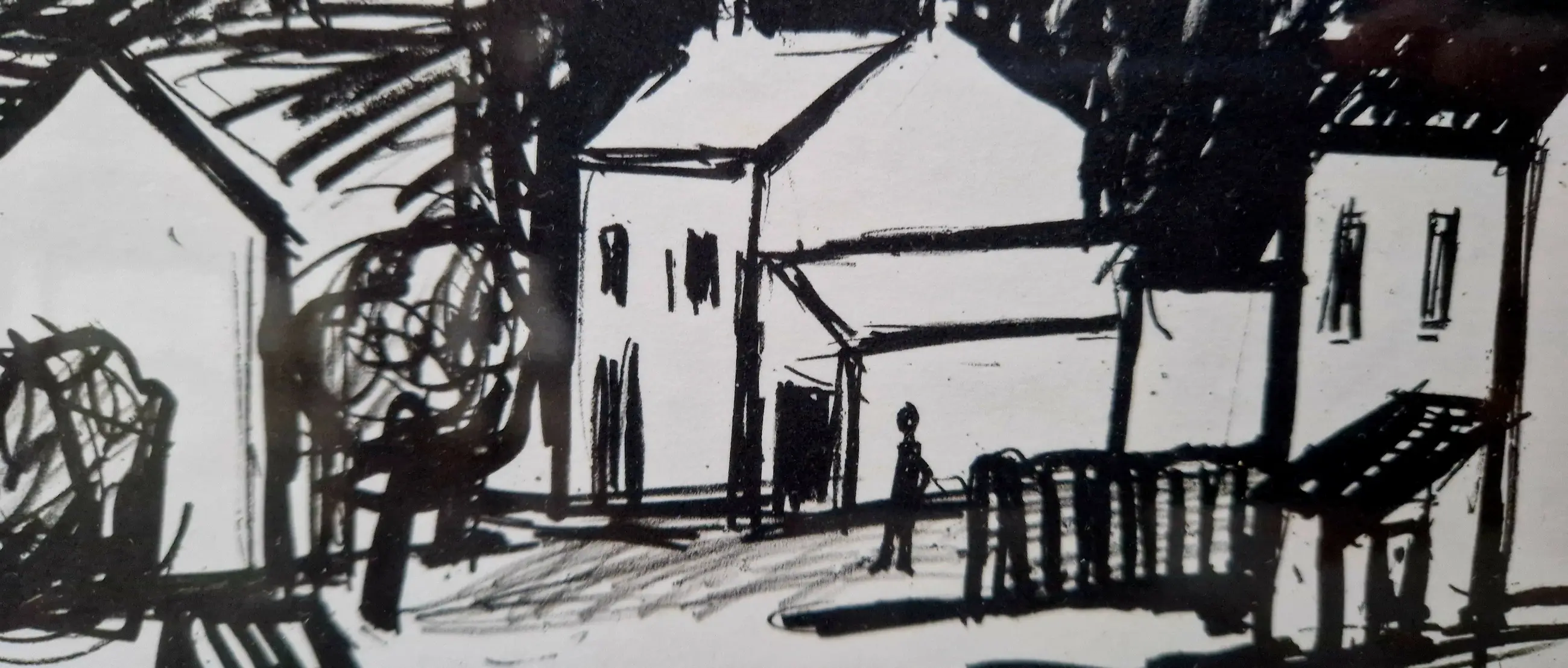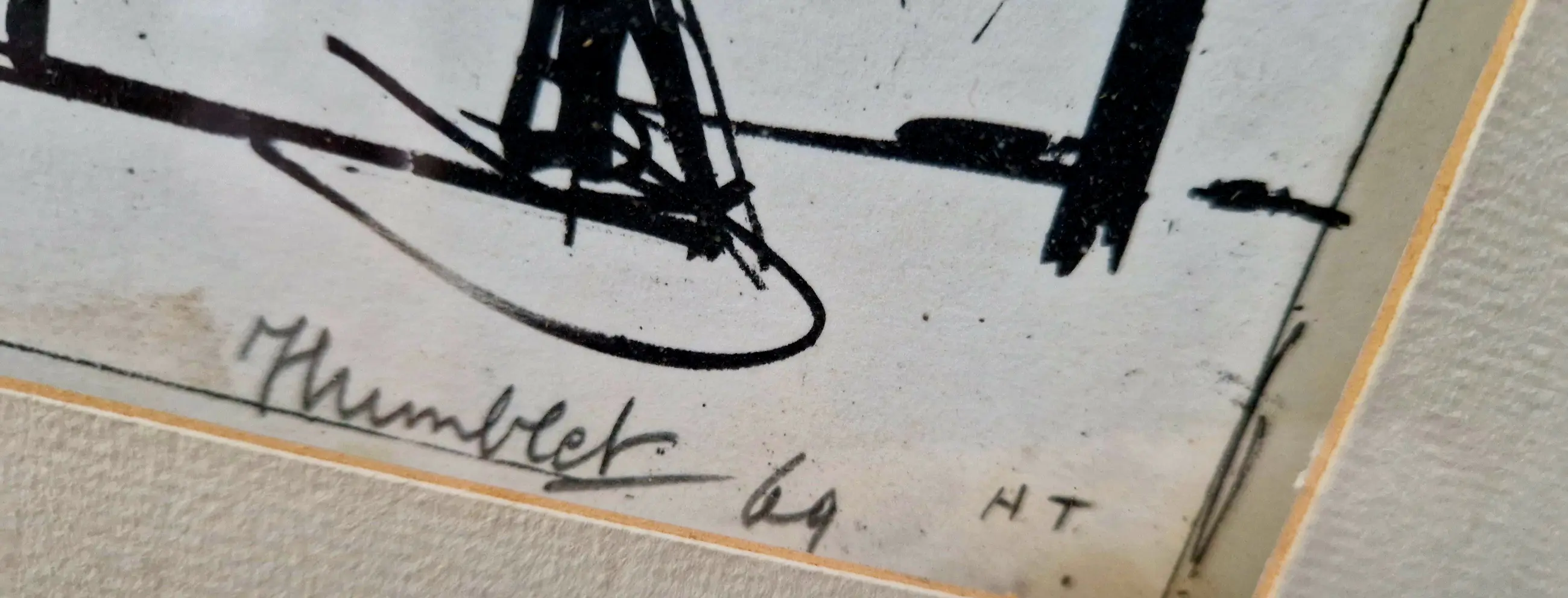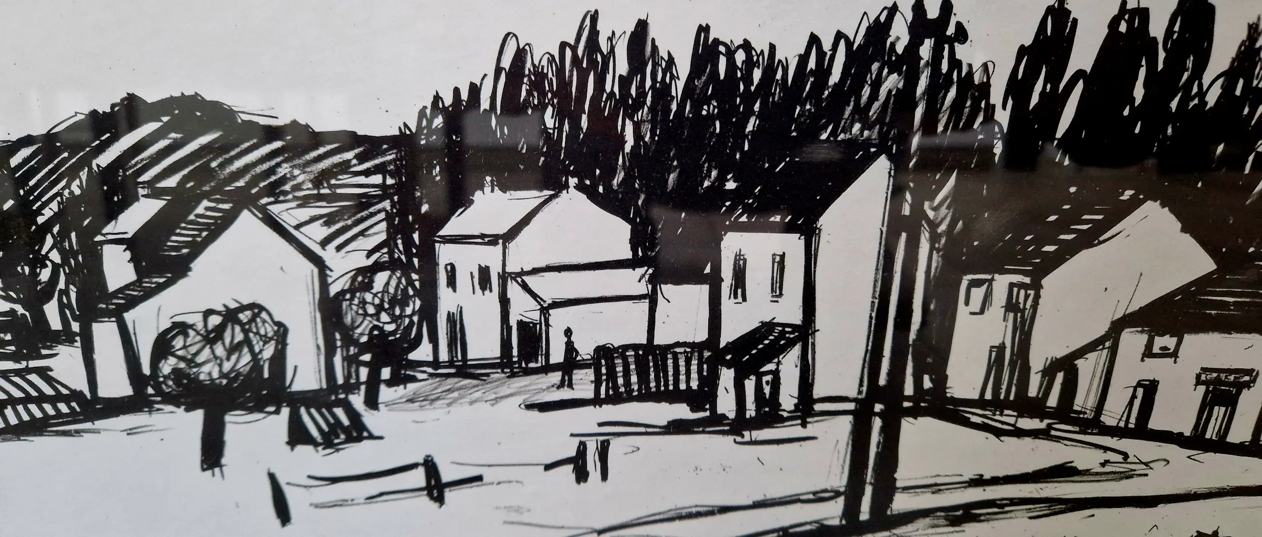 Fraaie inktdruk van kunstenaar Theo Humblet uit 1969 van een ruraal landschap, wellicht in zijn geliefd Veltem, Vlaams-Brabant.