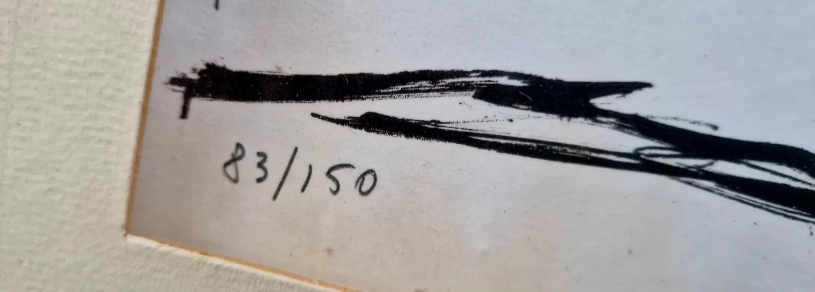 Gesigneerd en genummerd 83/150. In houten lijst met passe-partout achter glas. Lichte vlekjes op de onderkant van het papier. Afmetingen 56x43, 40x27.