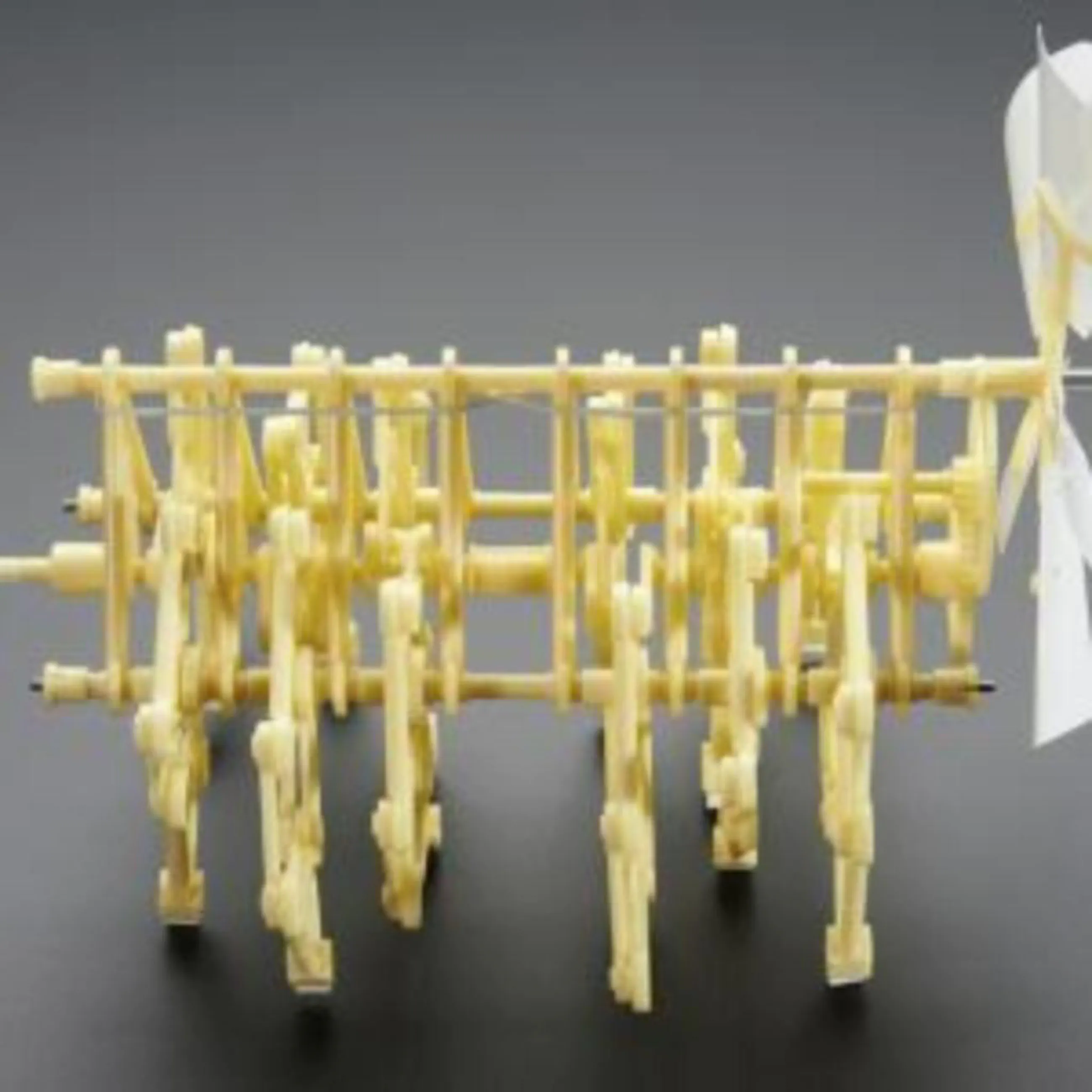 Theo Jansen is bekend van zijn wandelende kinetische sculpturen die hij een nieuwe levensvorm noemt. Zijn Strandbeesten zijn ondertussen wereldberoemd. Deze miniversie van de Animaris Ordis Parvus zet je zelf in elkaar. Eenmaal klaar loopt hij op de wind. De 117 onderdelen zet je in anderhalf uur in elkaar.