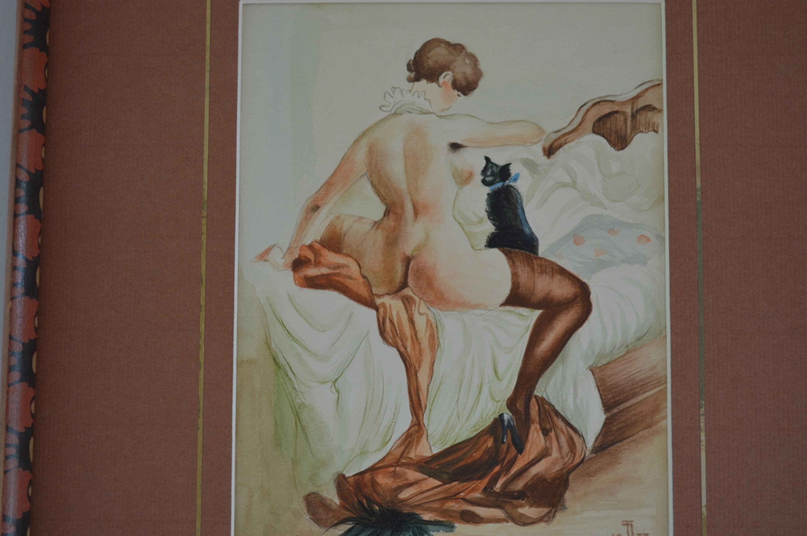 Erotische aquarel formaat 25 x 30 ( met lijst 35 x 50 ) 'poes ' uit 1977, gesigneerd met de letters TJ, zoals Theo gewoon was te doen.