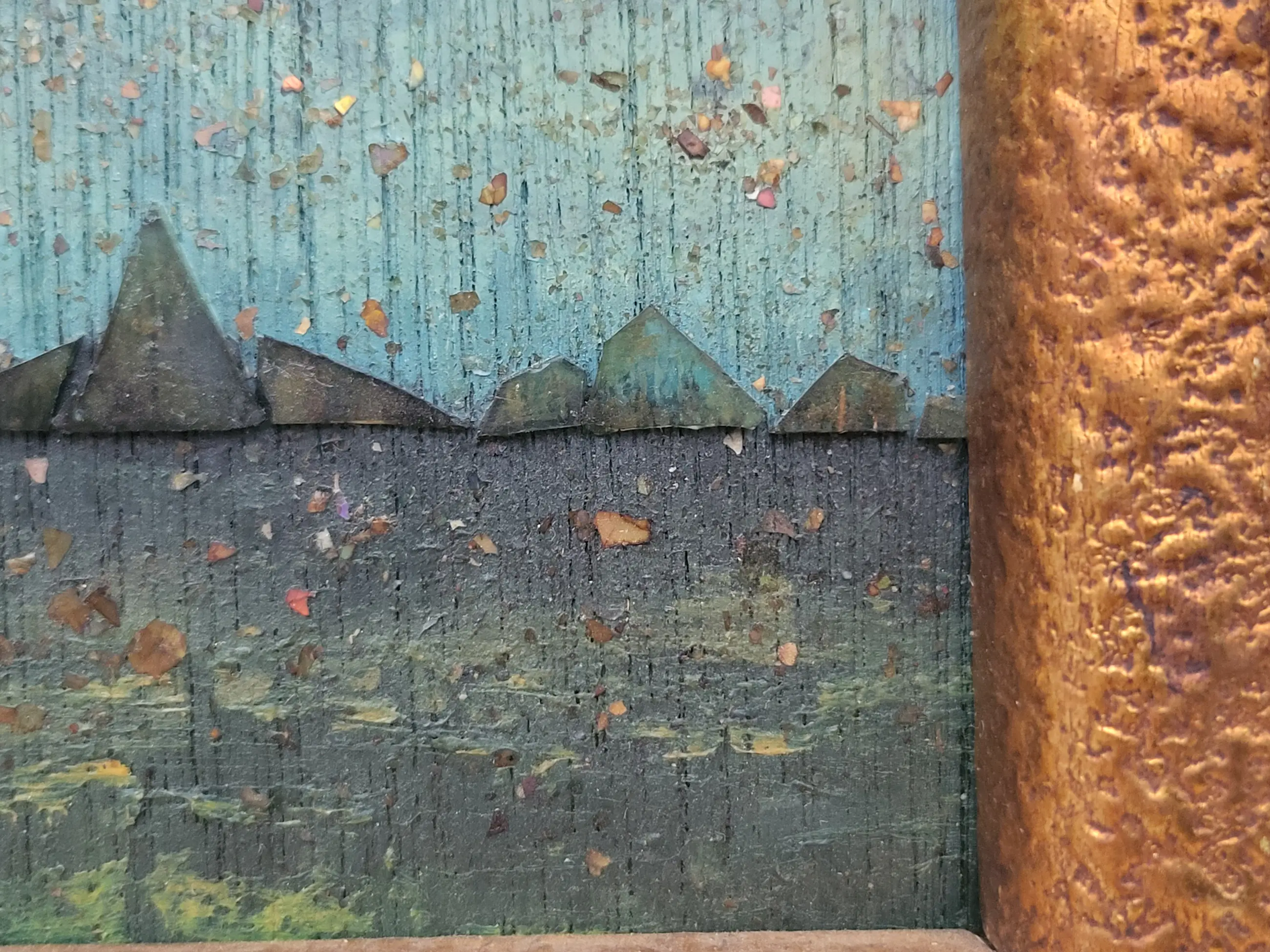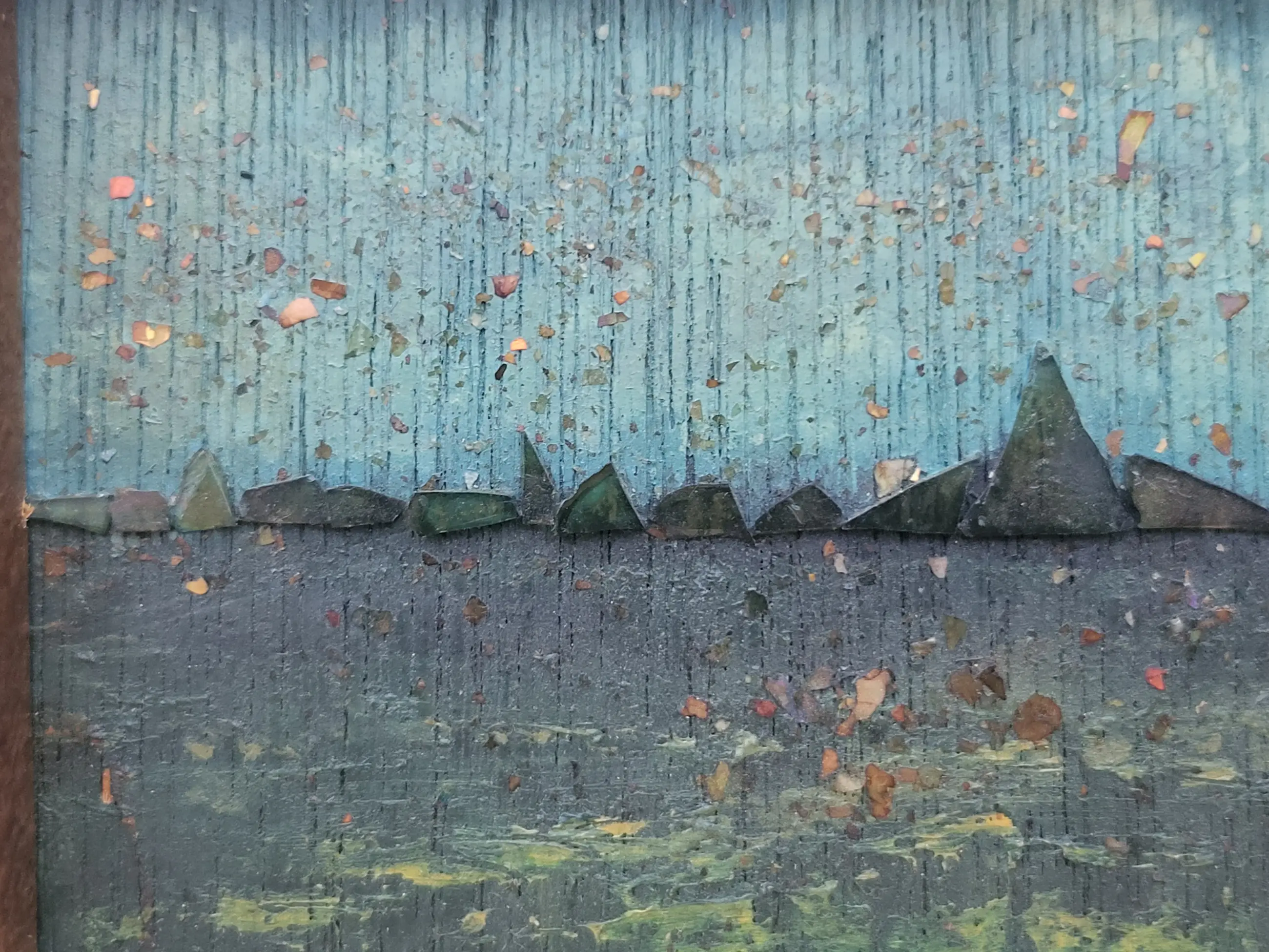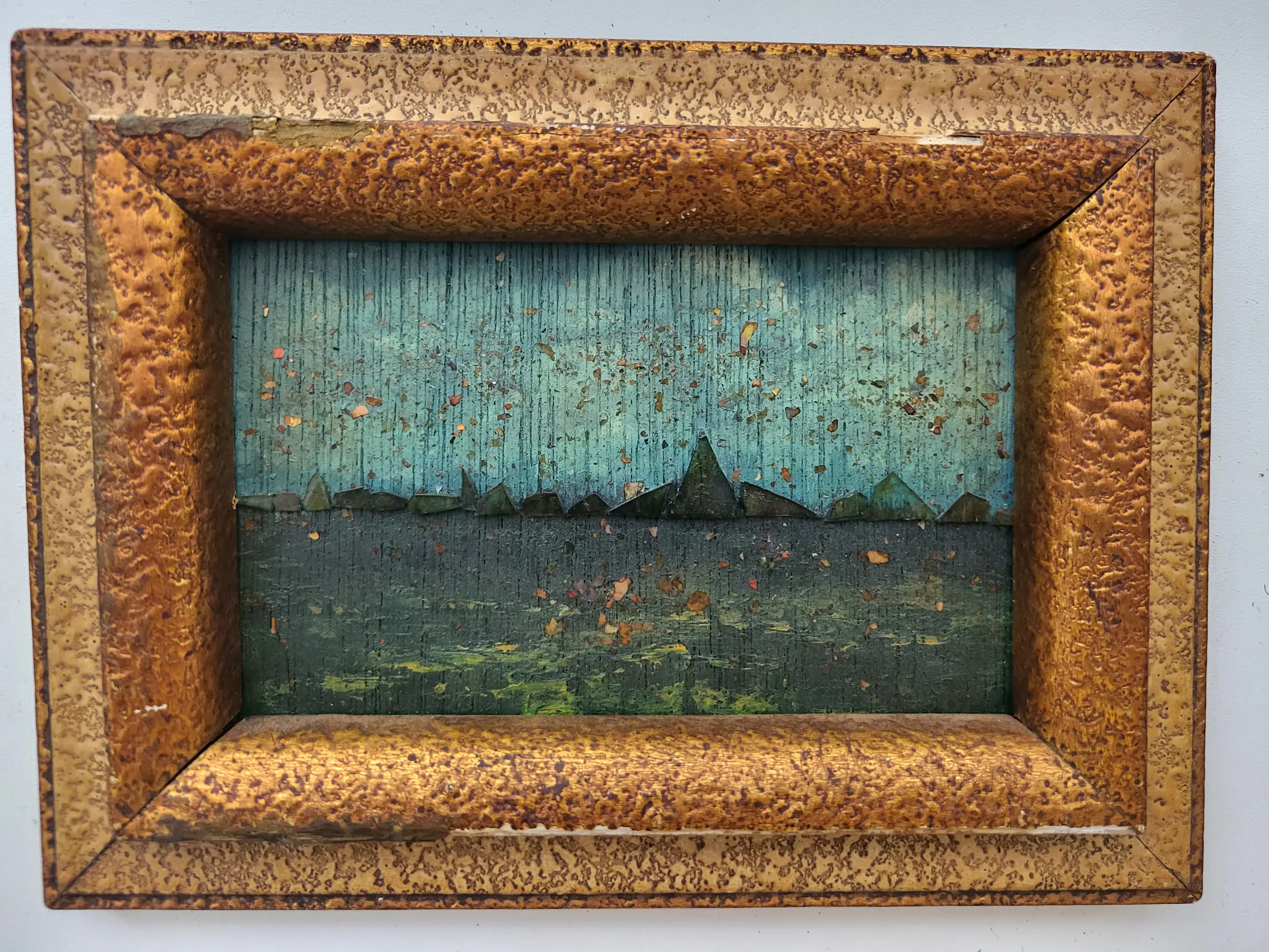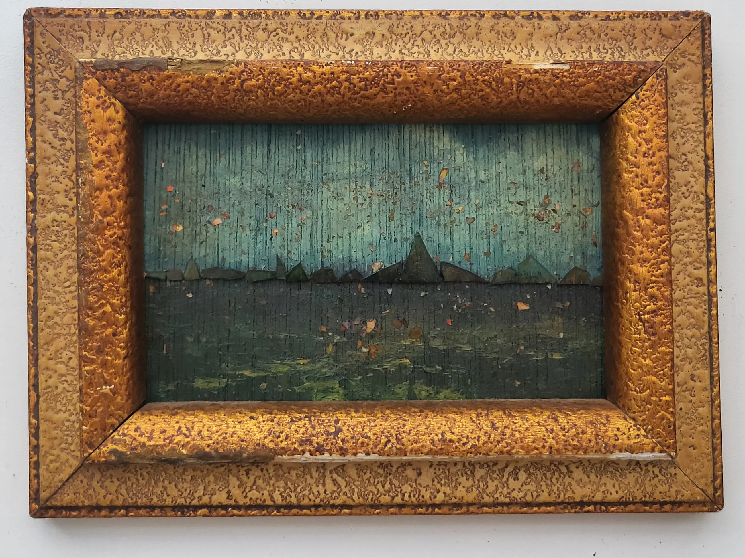 Sfeervol klein werk van Theo Kortekaas. Gemengde techniek: Olieverf op paneel met groene stukjes glas en glitters.