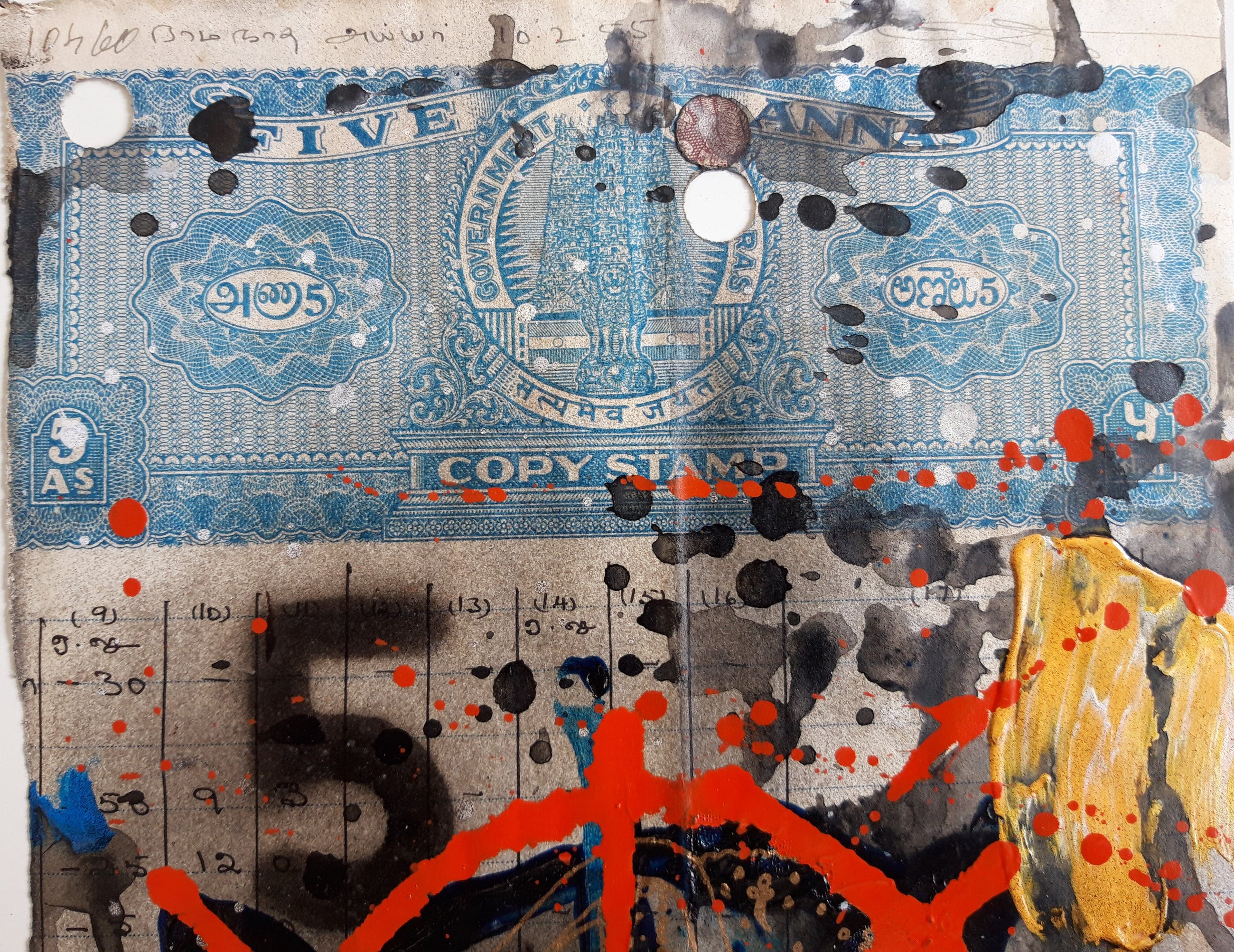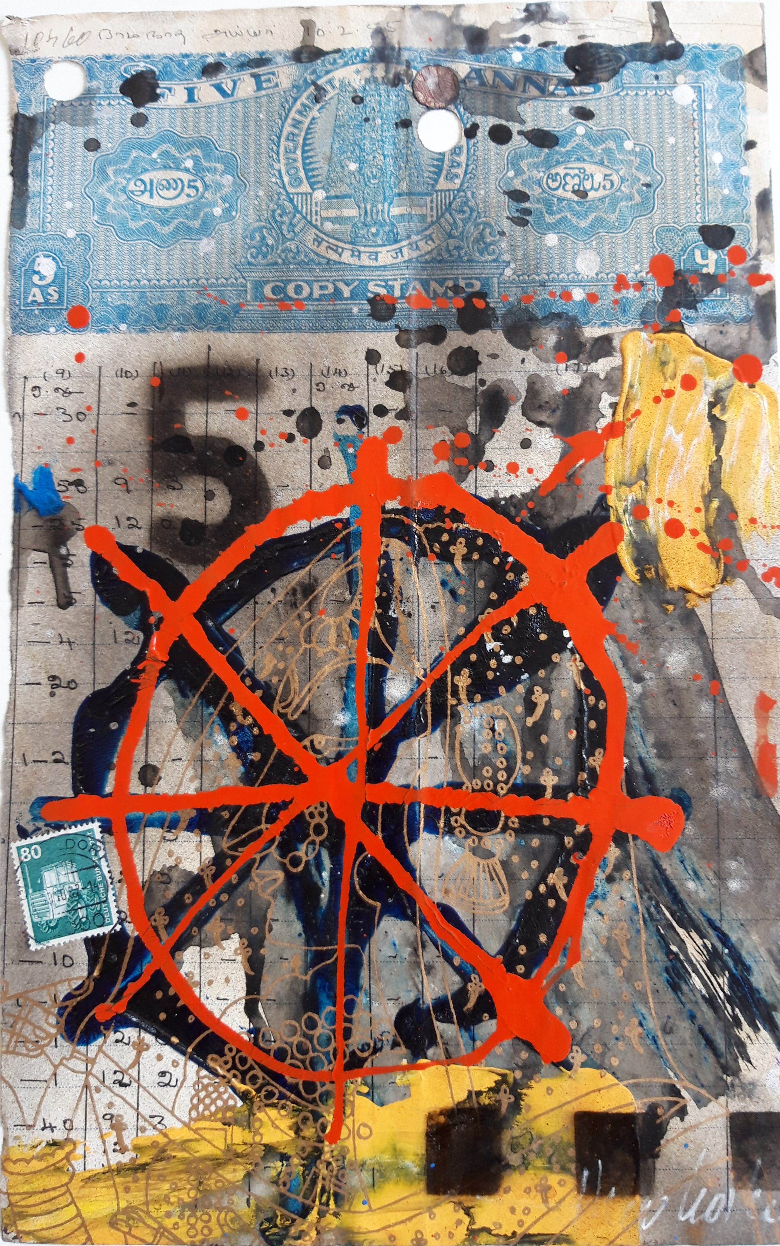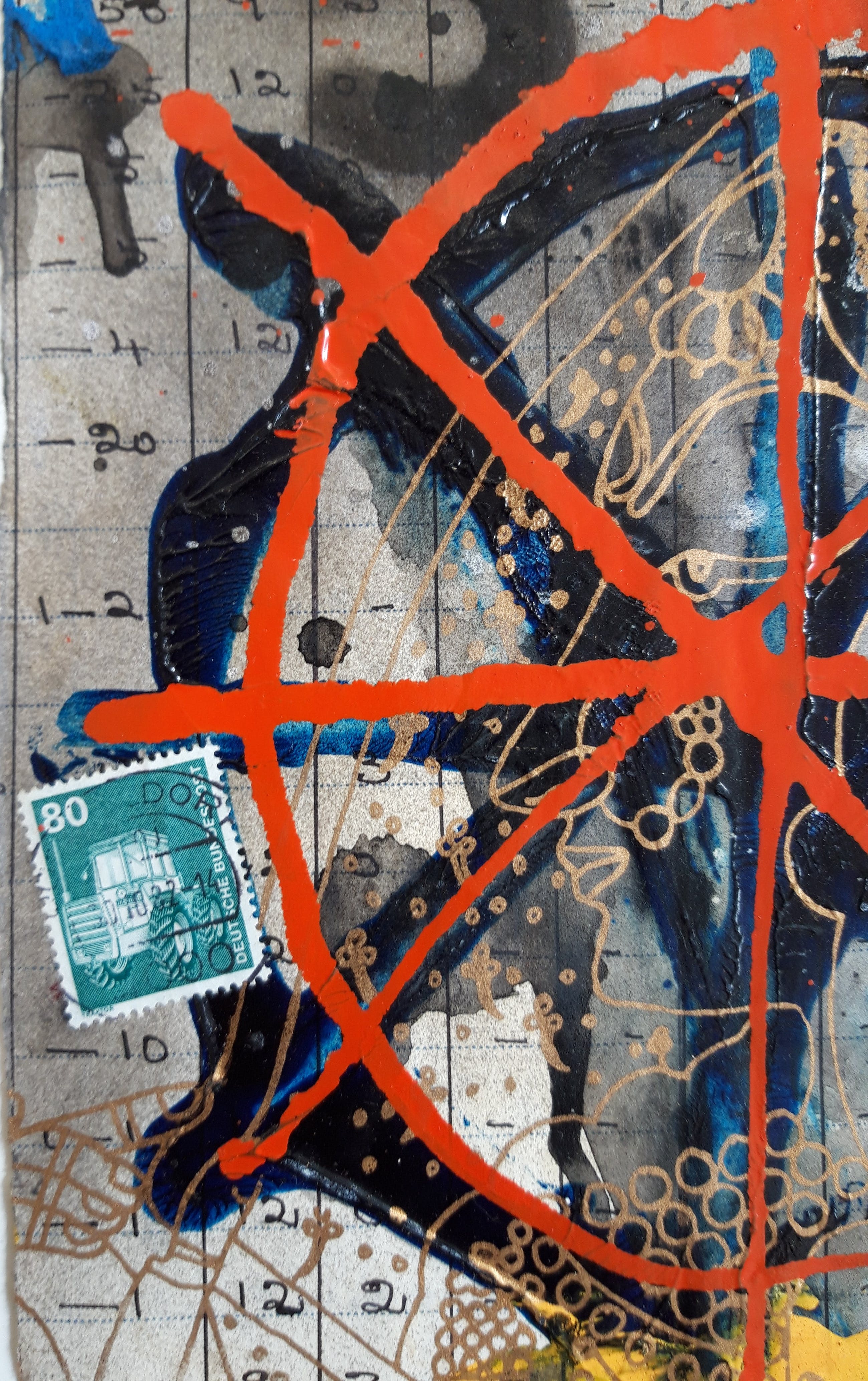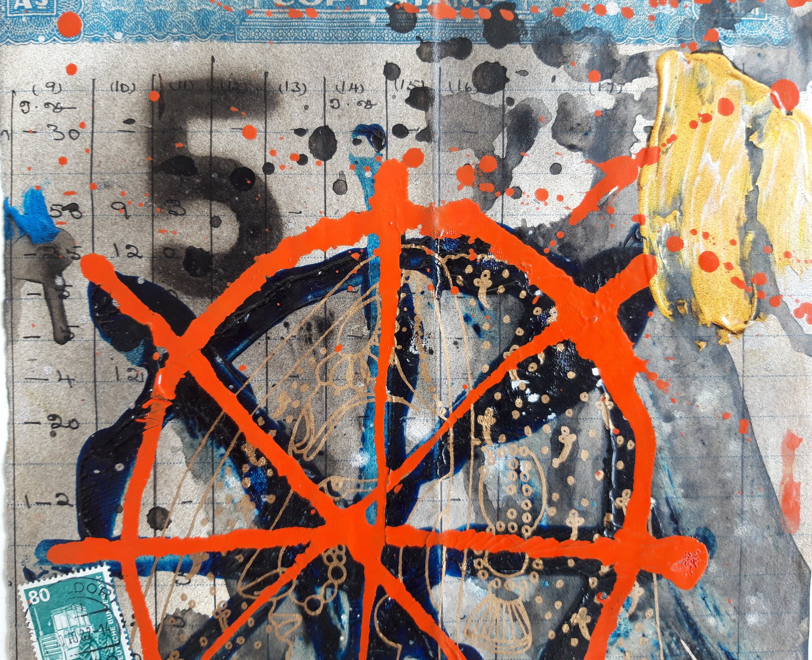 Theo Koster (Emmeloord 1952) gebruikt grafische en schilderkunstige elementen. Hij werkt met allerlei soorten verf en verwerkt symbolen, cijfers, stukjes bedrukt papier en postzegels. Het wordt zo een mysterieuze wereld van kleur en vorm. Dit aandeel is uniek, de ondergrond is dun papier waarom Thaise letter gedrukt zijn.