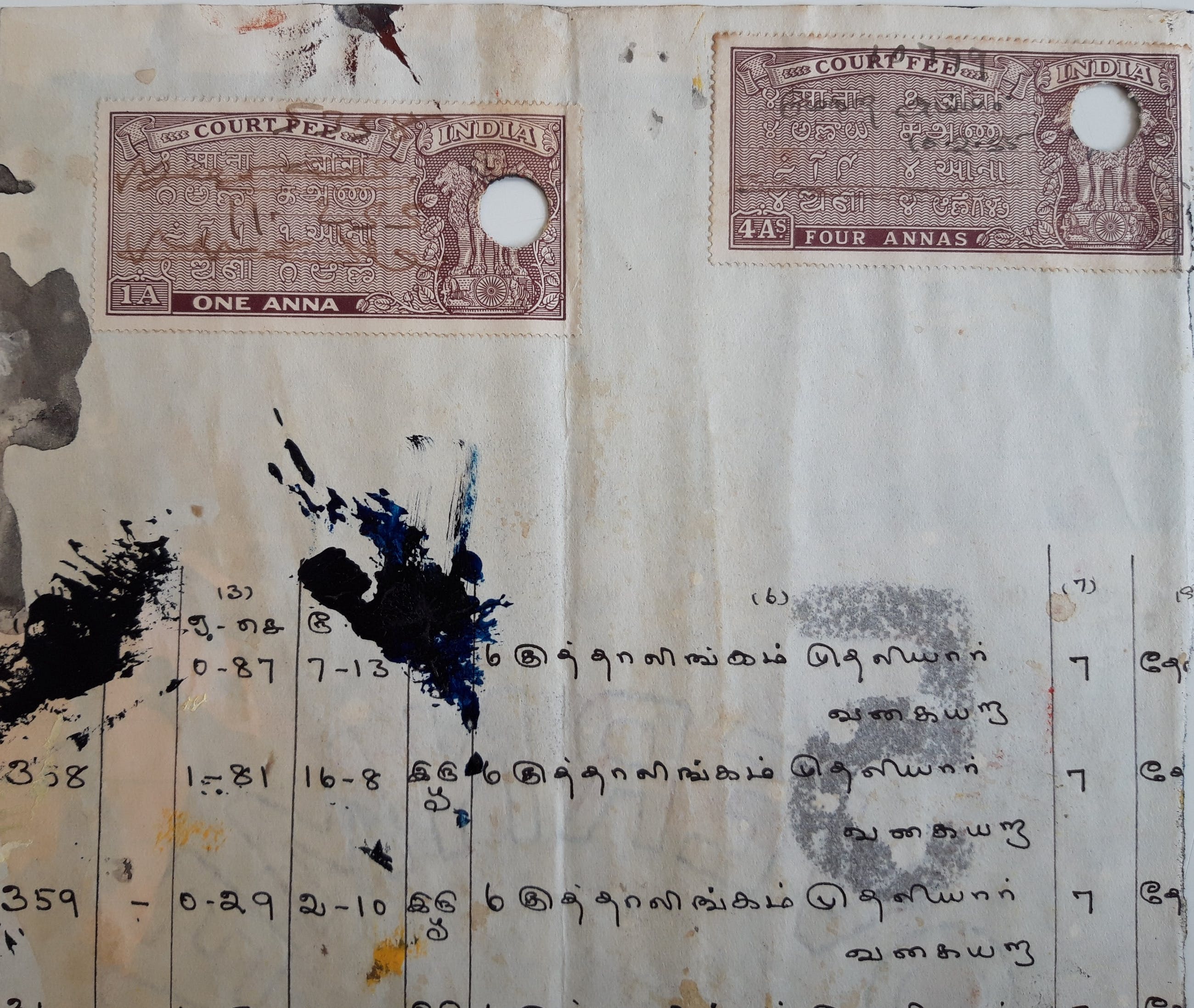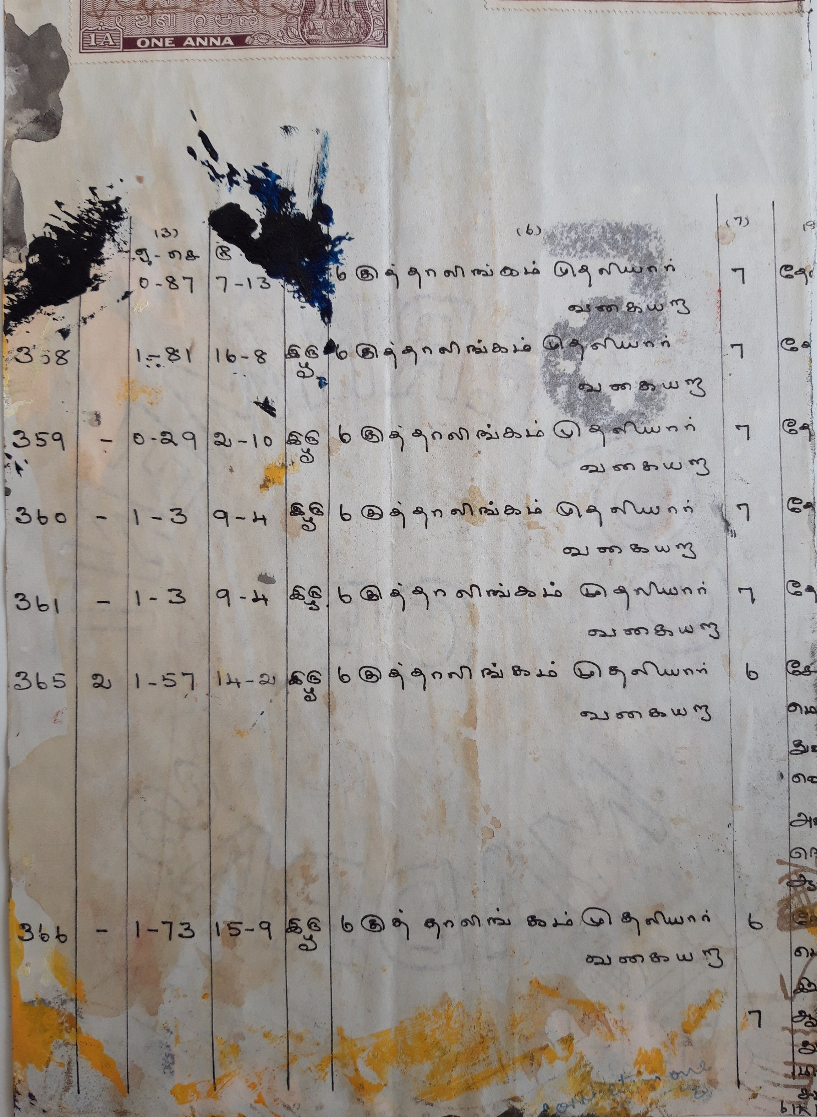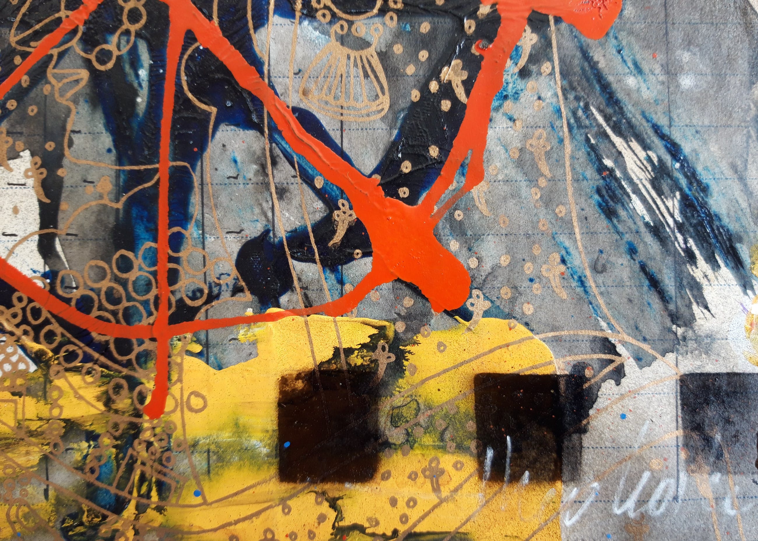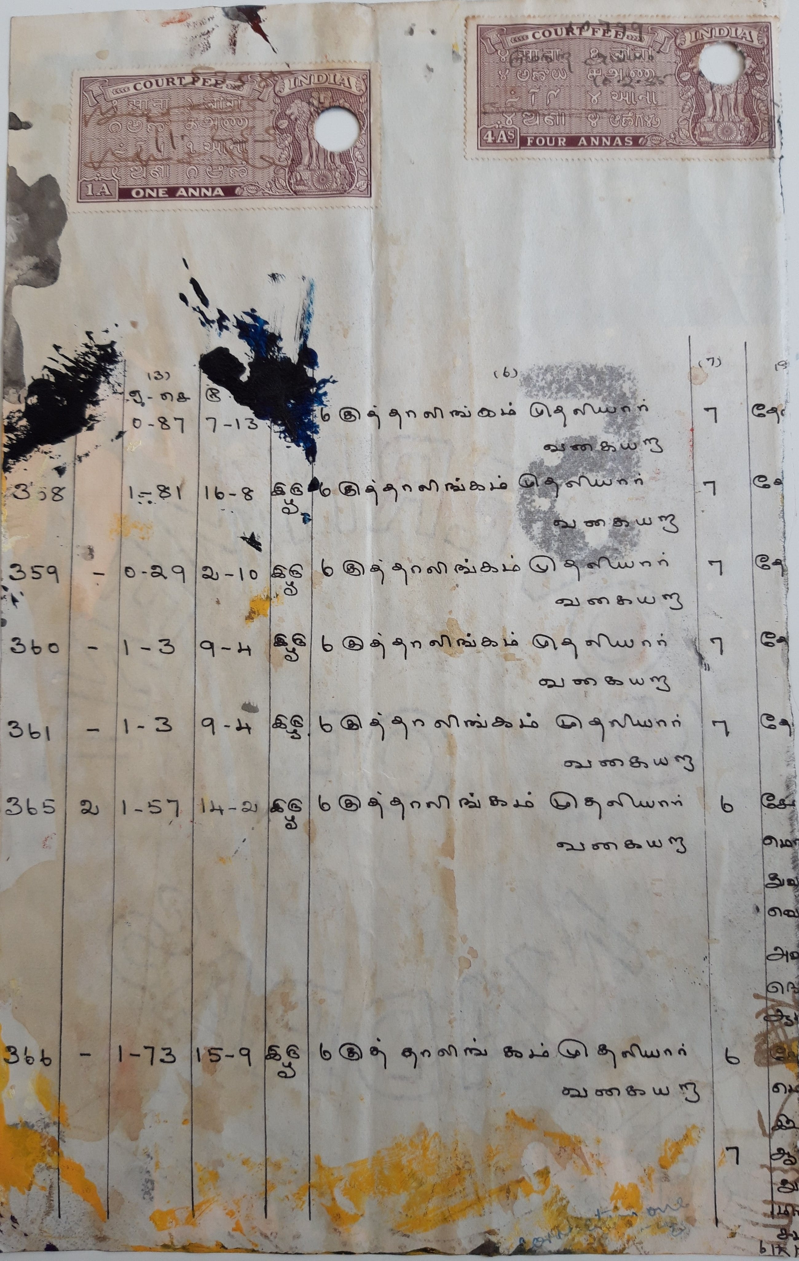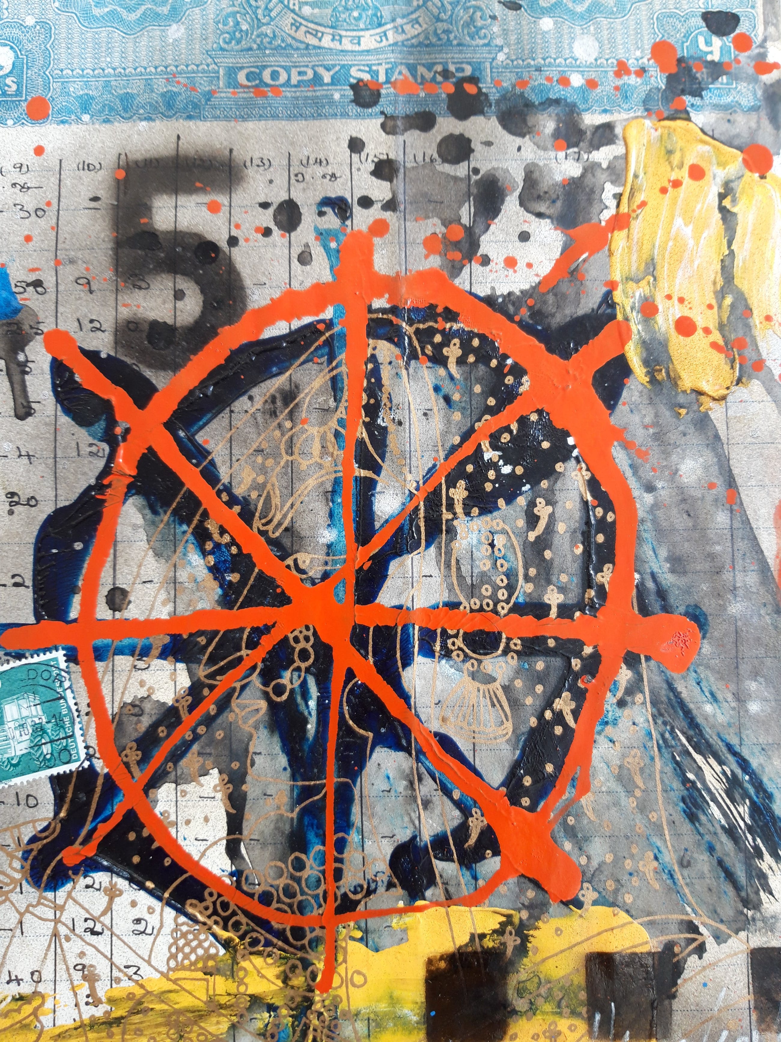 Theo Koster (Emmeloord 1952) gebruikt grafische en schilderkunstige elementen. Hij werkt met allerlei soorten verf en verwerkt symbolen, cijfers, stukjes bedrukt papier en postzegels. Het wordt zo een mysterieuze wereld van kleur en vorm. Dit aandeel is uniek, de ondergrond is dun papier waarom Thaise letter gedrukt zijn.