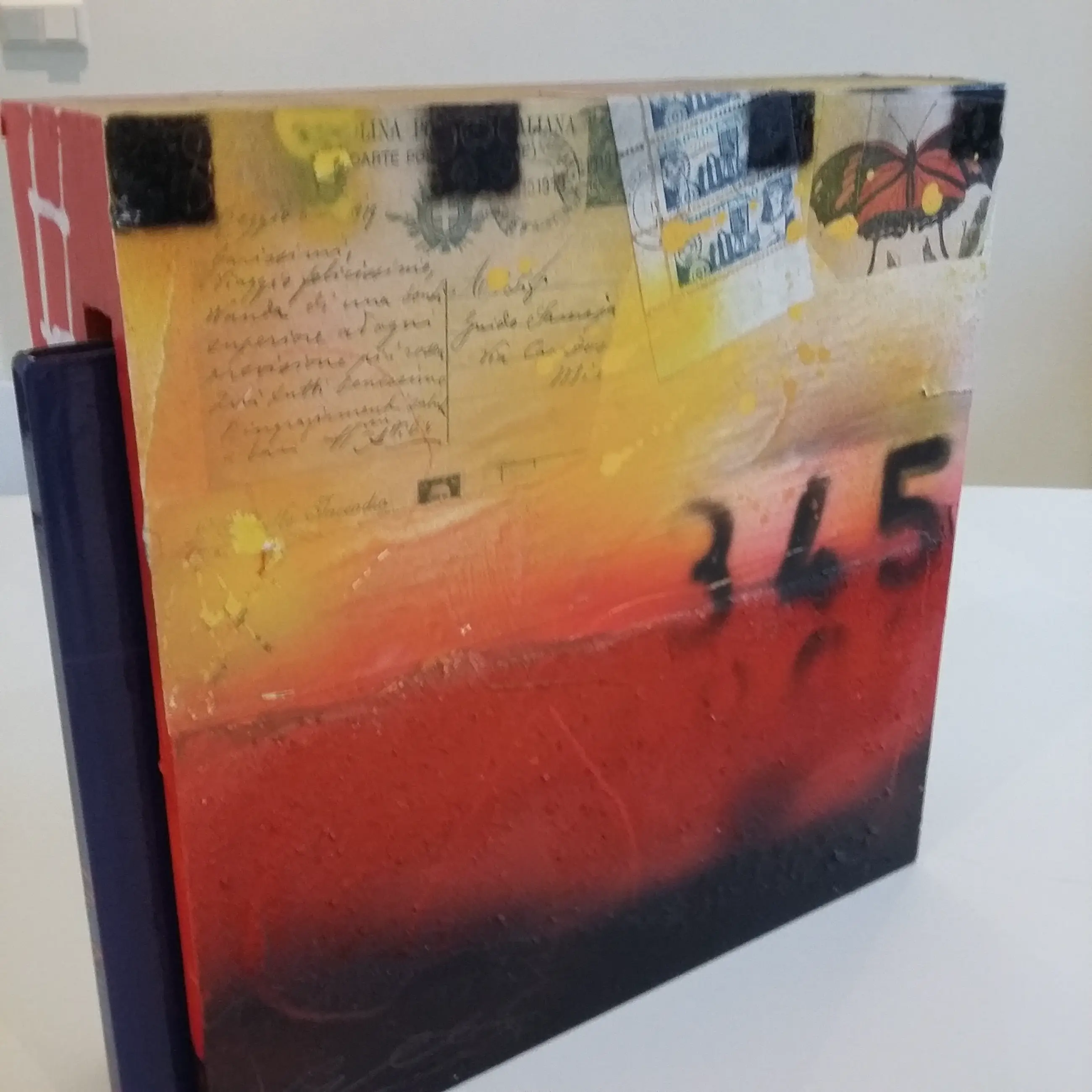 Boekbakje; houten beschilderde bak (gemengde techniek) met boek over werken van Theo Koster Afmeting 30*30*8 cm.