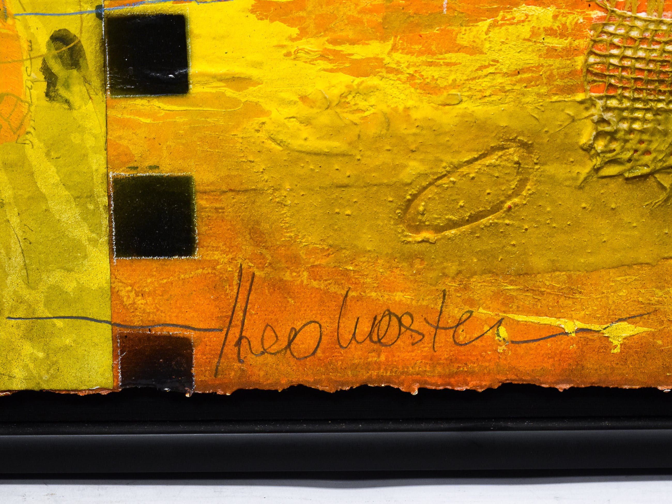 Op de doeken van Theo Koster zijn landschappen vol grafische en schilderkunstige elementen te ontwaren. Door het gebruik van allerlei soorten verf en het verwerken van verschillende materialen als stukjes bedrukt papier, wordt men een mysterieuze wereld van kleur en vorm binnengeleid. Deze technieken weet hij ook perfect te bevatten in zijn zeefdrukken, waarmee hij het doel heeft kunst toegankelijker te maken.