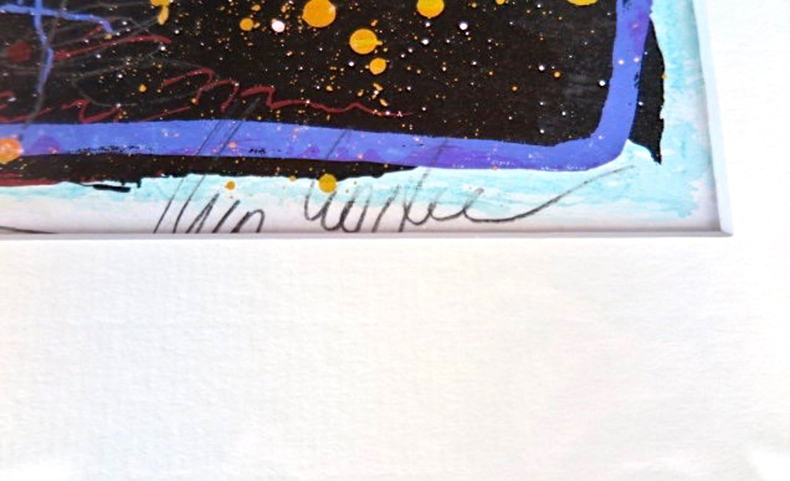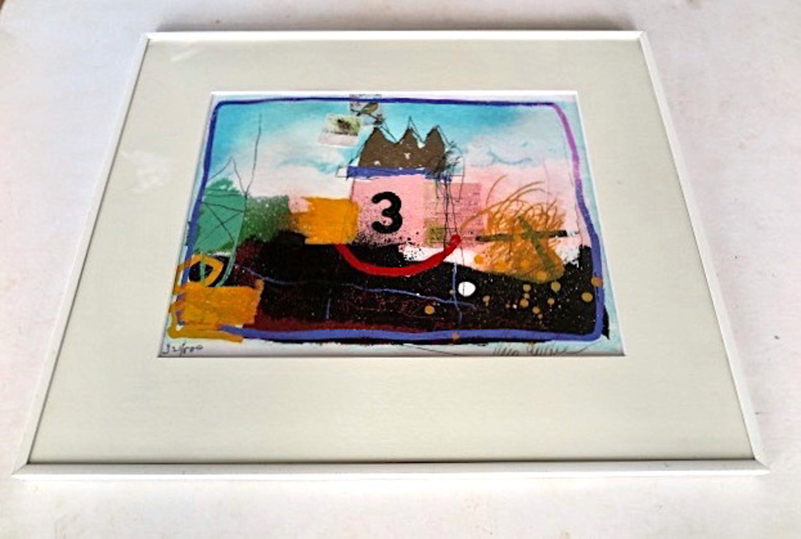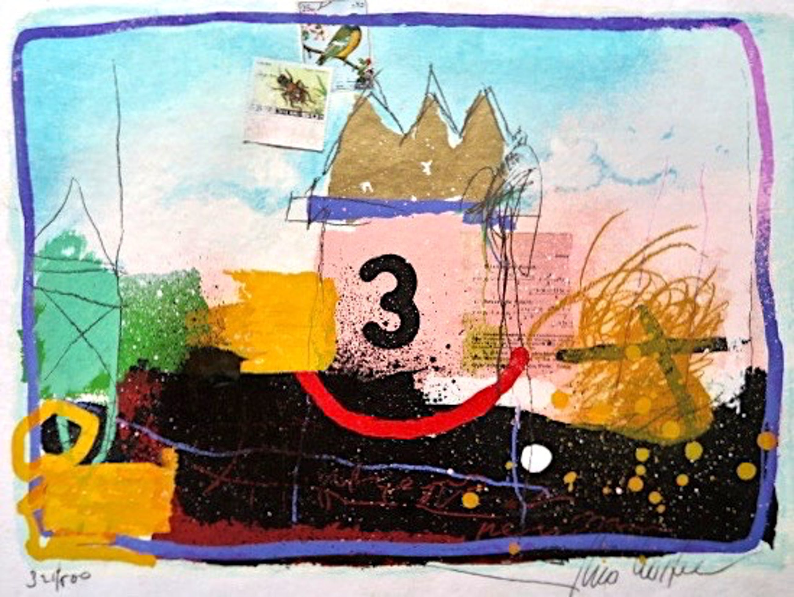 Gemengde techniek met o.a. acryl, gauche en collages, op onderliggend een zeefdruk (321/500)Op geschept zeer dik cotton papier