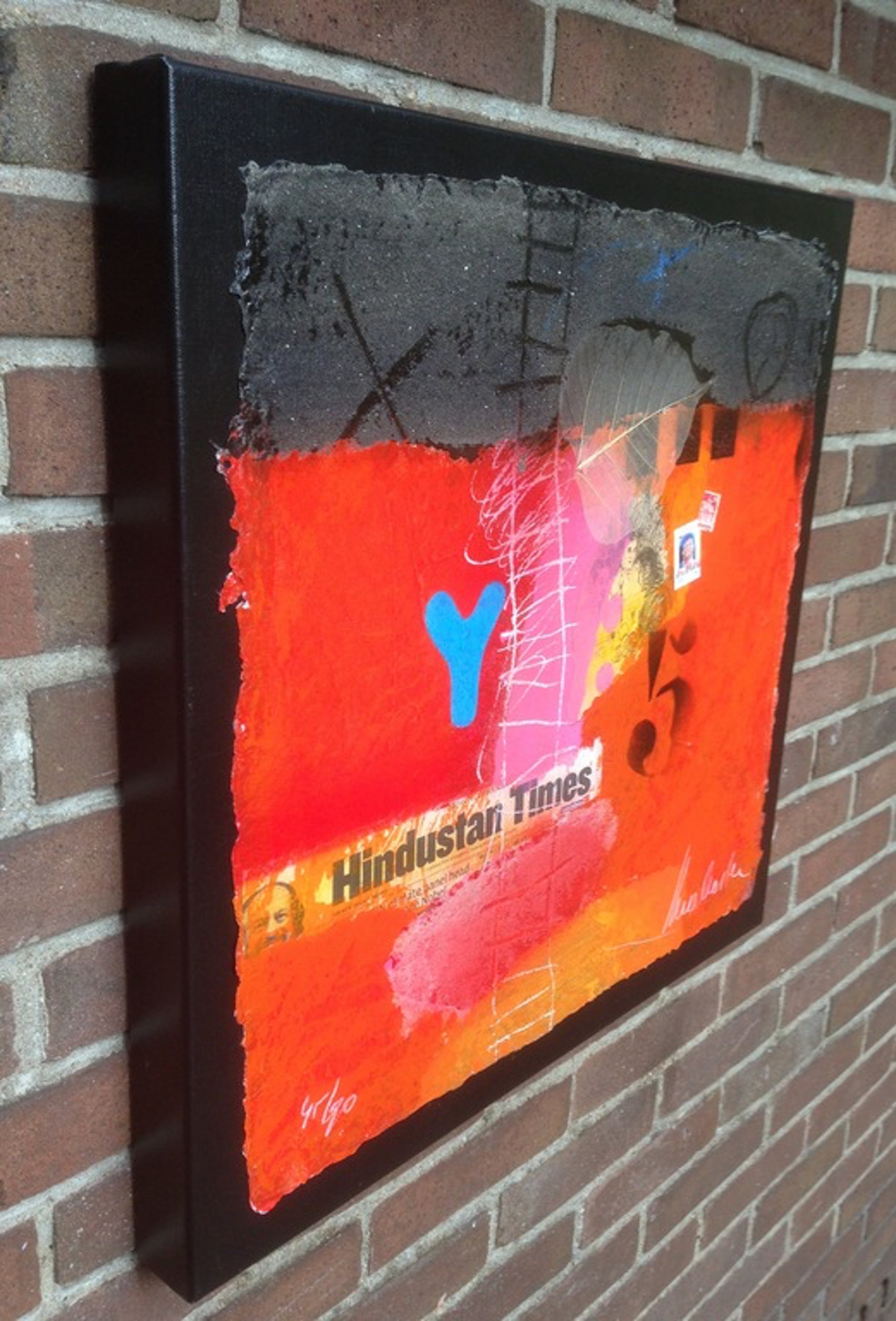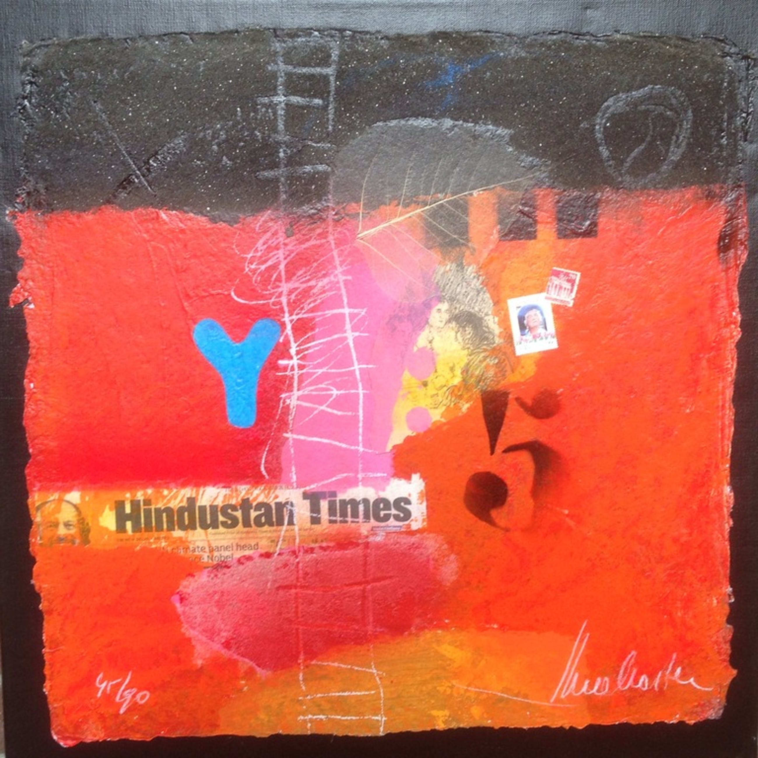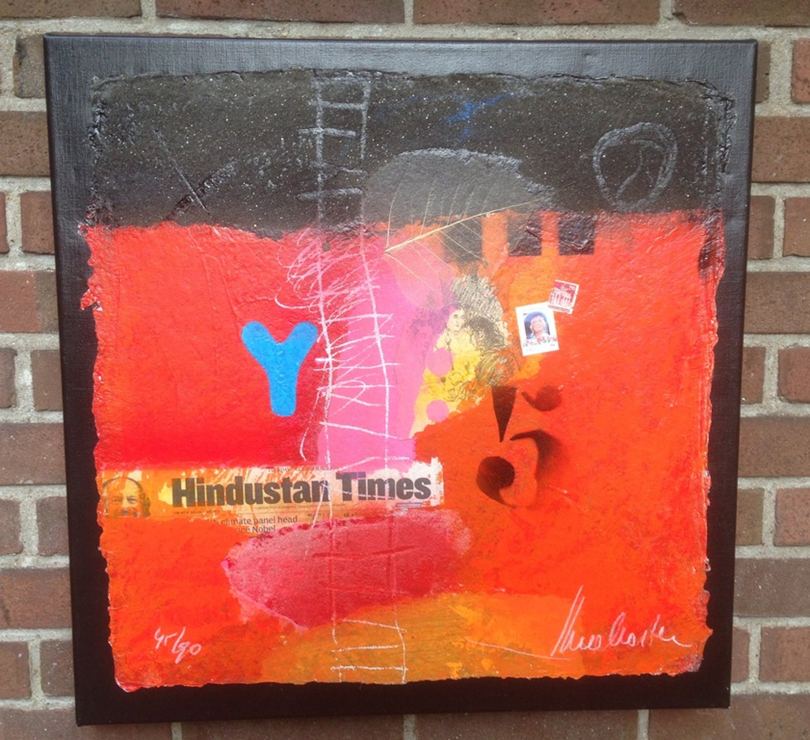 Gemengde techniek in oplage gemaakt van de kunstenaar theo koster , zeefdruk met collage , zand en andere marerialen bijzonder werk afmetingen 55x55cm titel hindustan times gemaakt in de india periode Staat ook afgebeeld in het boek "theo koster traces of india "