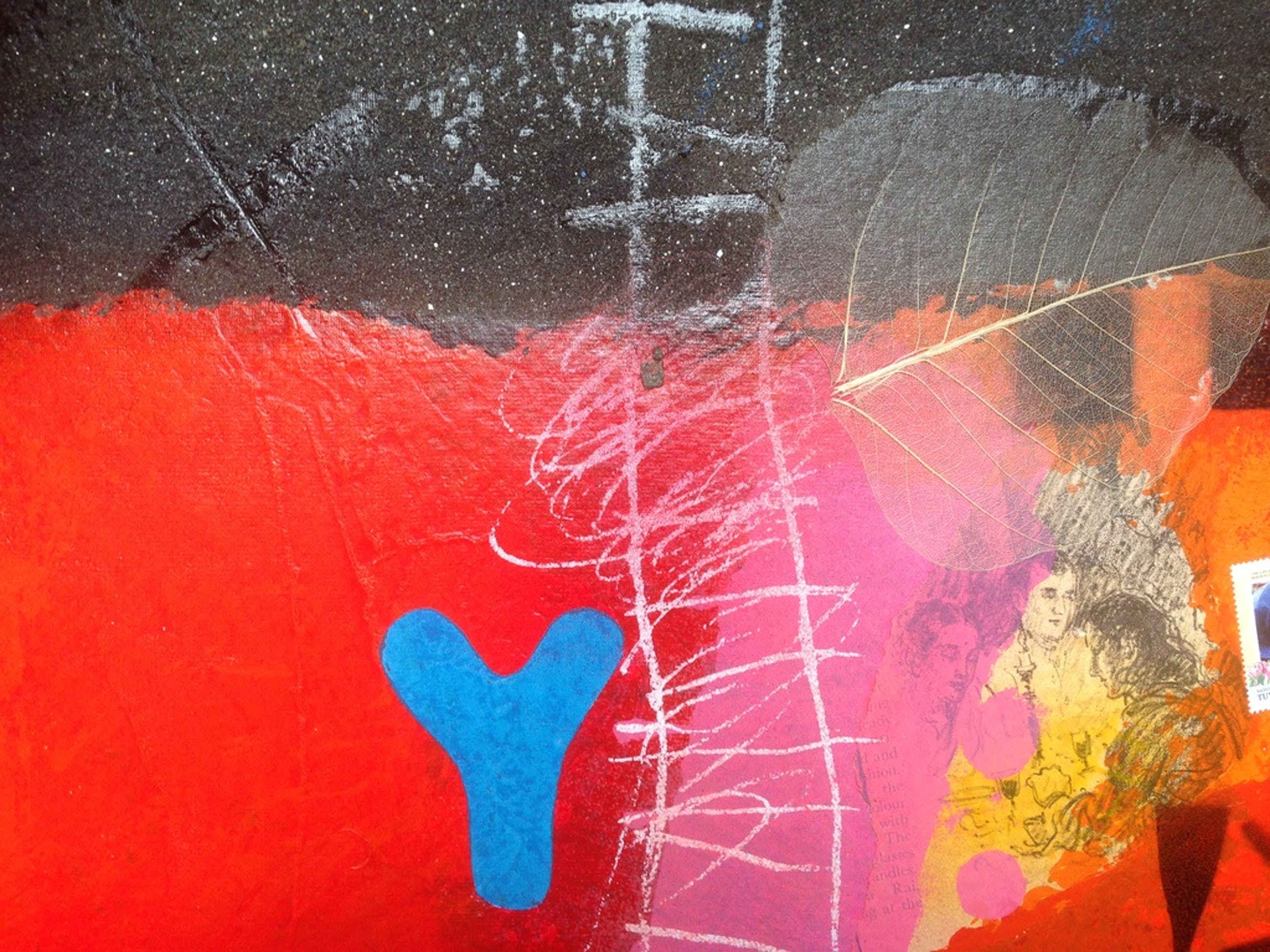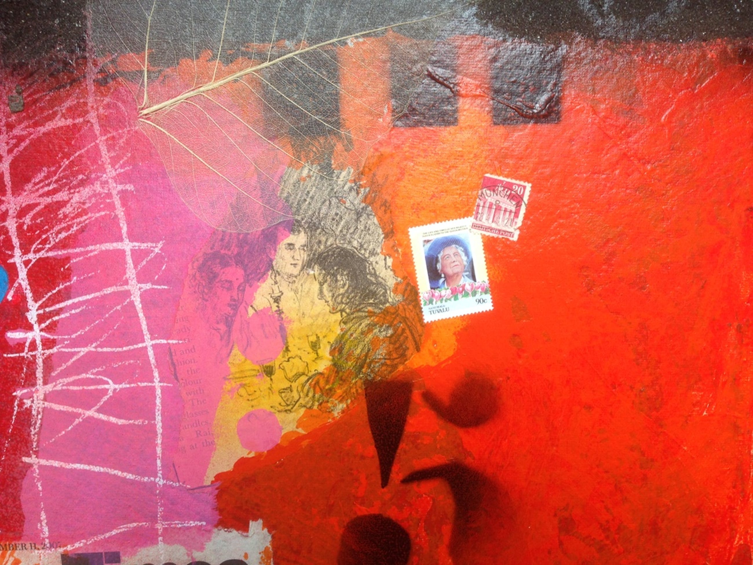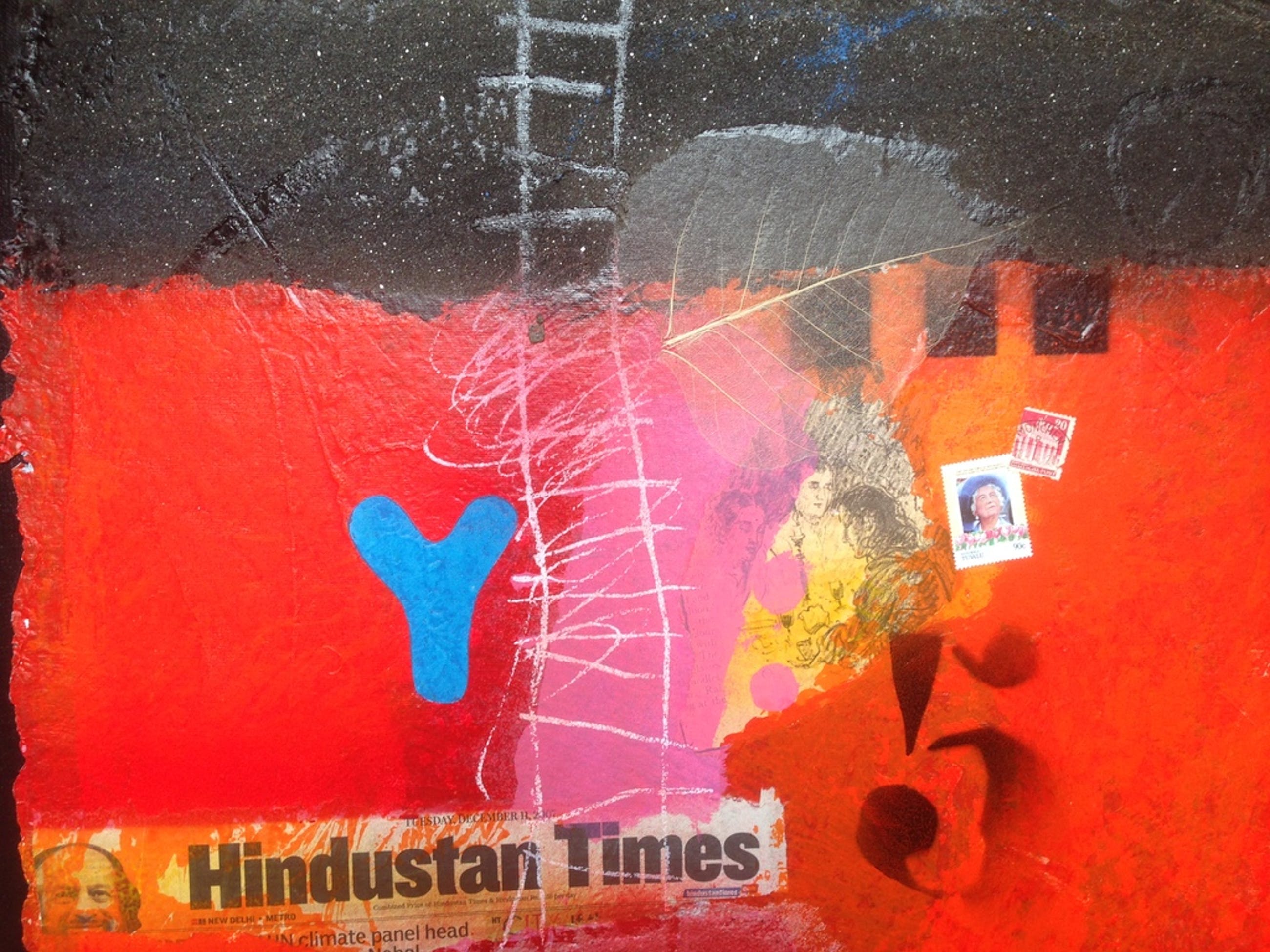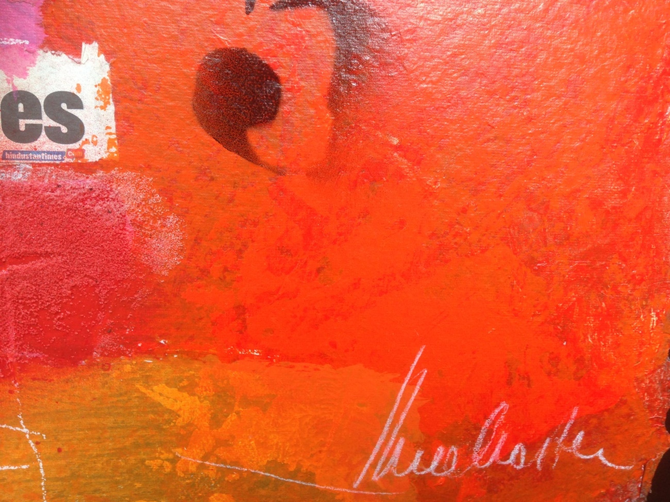 Gemengde techniek in oplage gemaakt van de kunstenaar theo koster , zeefdruk met collage , zand en andere marerialen bijzonder werk afmetingen 55x55cm titel hindustan times gemaakt in de india periode Staat ook afgebeeld in het boek "theo koster traces of india "