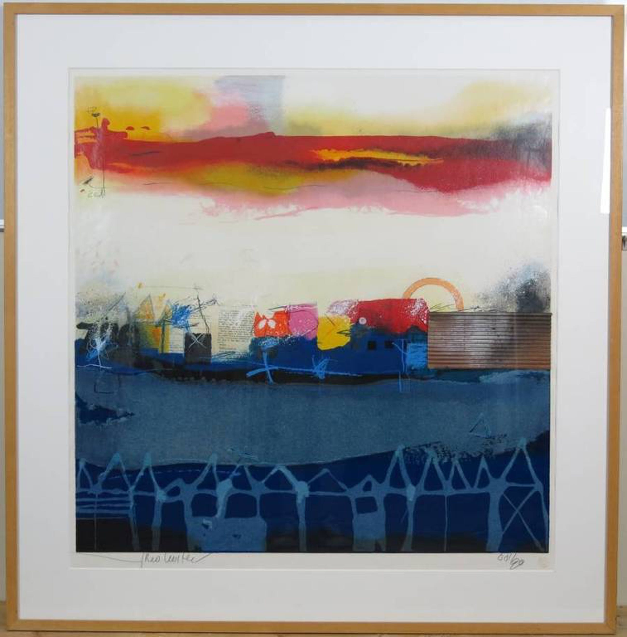 Groot werk van Theo Koster (ca 1x1m incl lijst) in zijn bekende stijl: grafisch werk met extra toegevoegde elementen, waardoor het toch een uniek werk wordt. Handgesigneerd, in houten lijst. Titel onb. In uitstekende staat, kleine gebruikssporen op de lijst. Oorspr galerieprijs € 875,-.