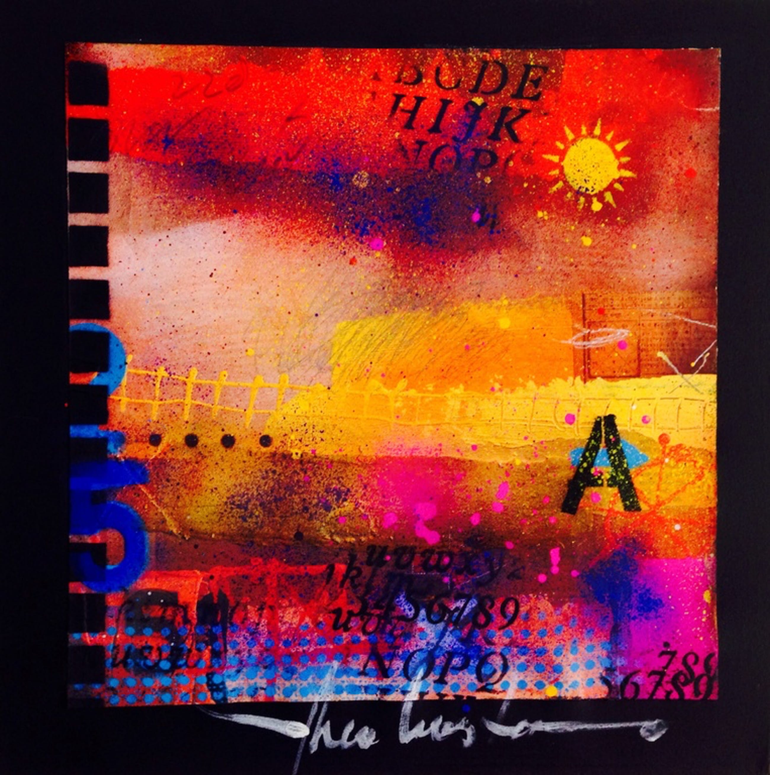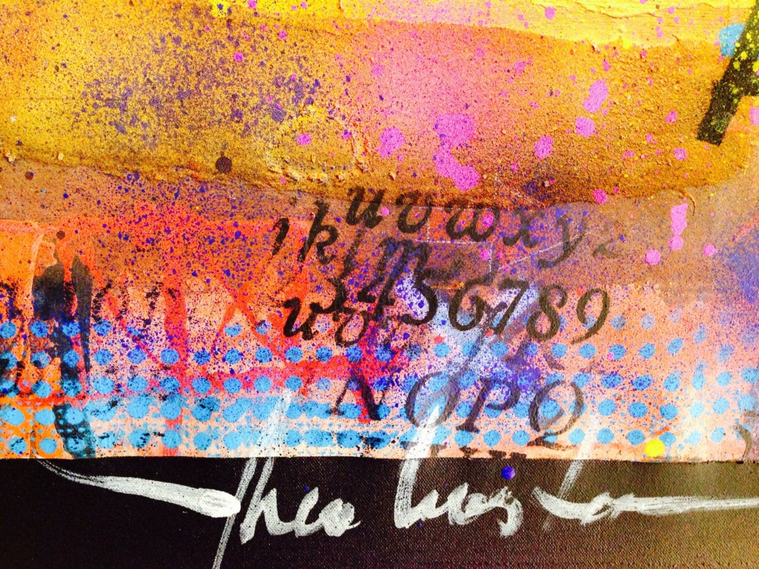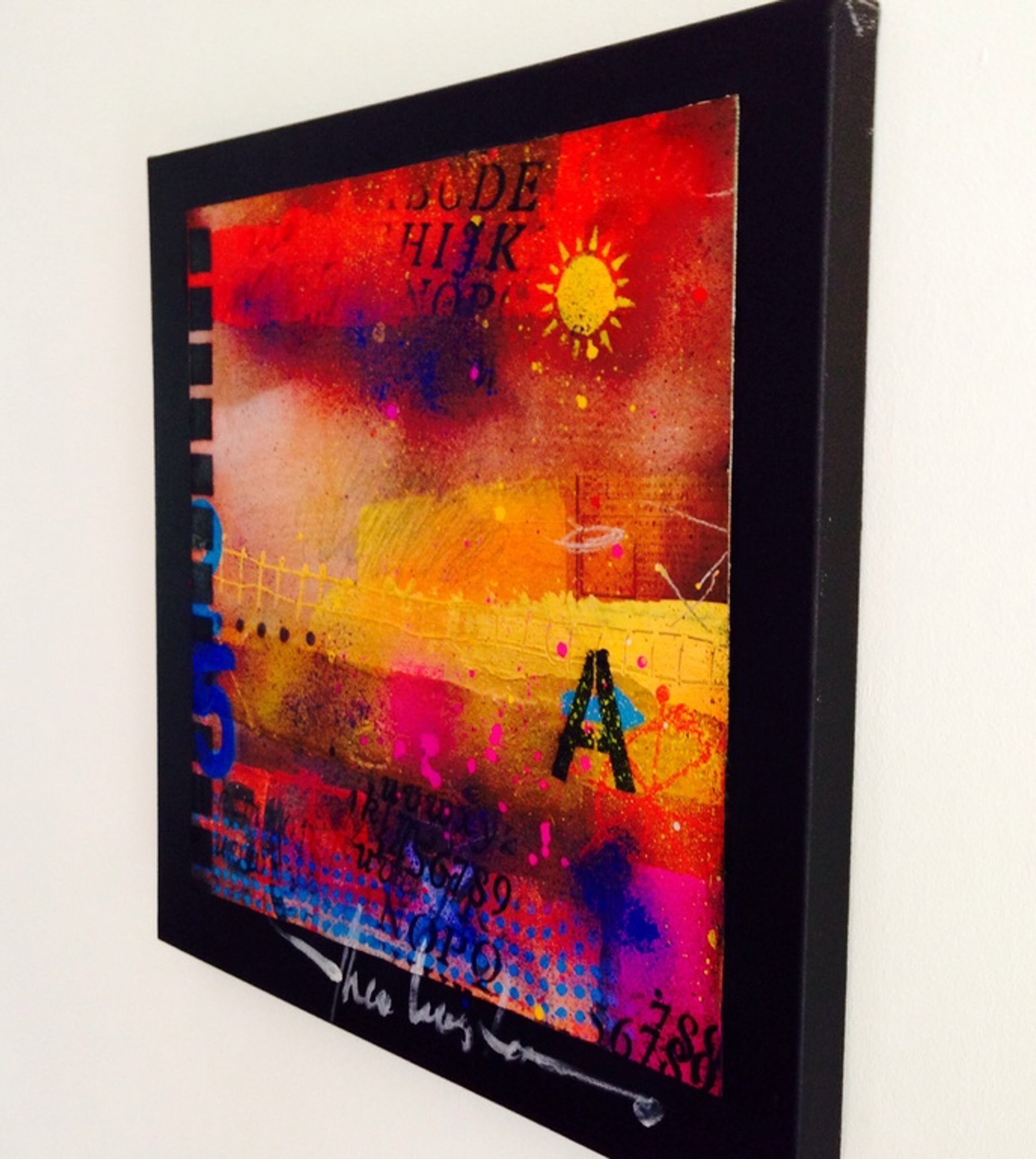 Origineel schilderij in gemengde techniek , handgesigneerd en in zeer goede staat van de kunstenaar theo koster , afmetingen 60x60x4 cm , titel: neverland galerie verkoopwaarde €1500,-