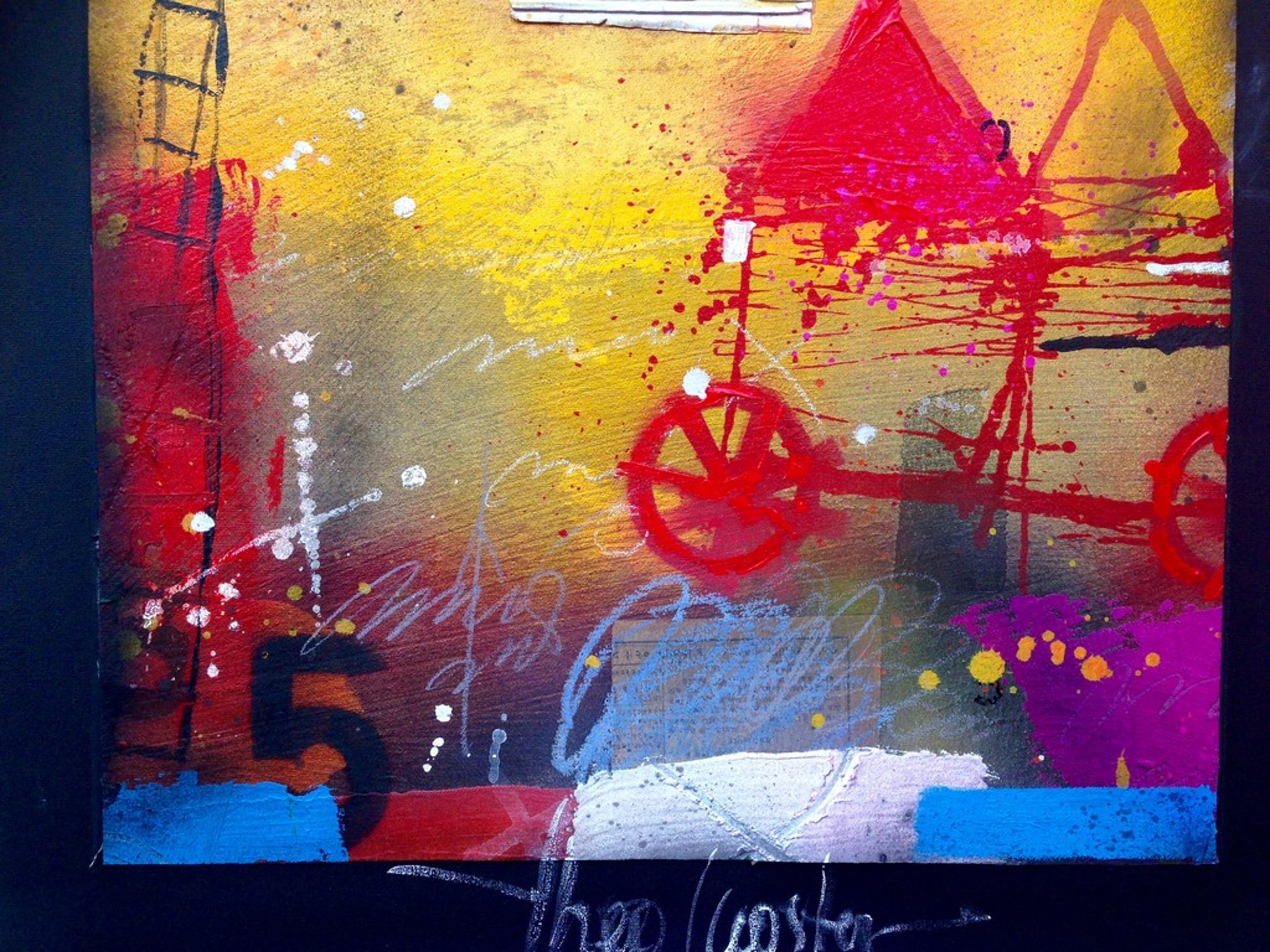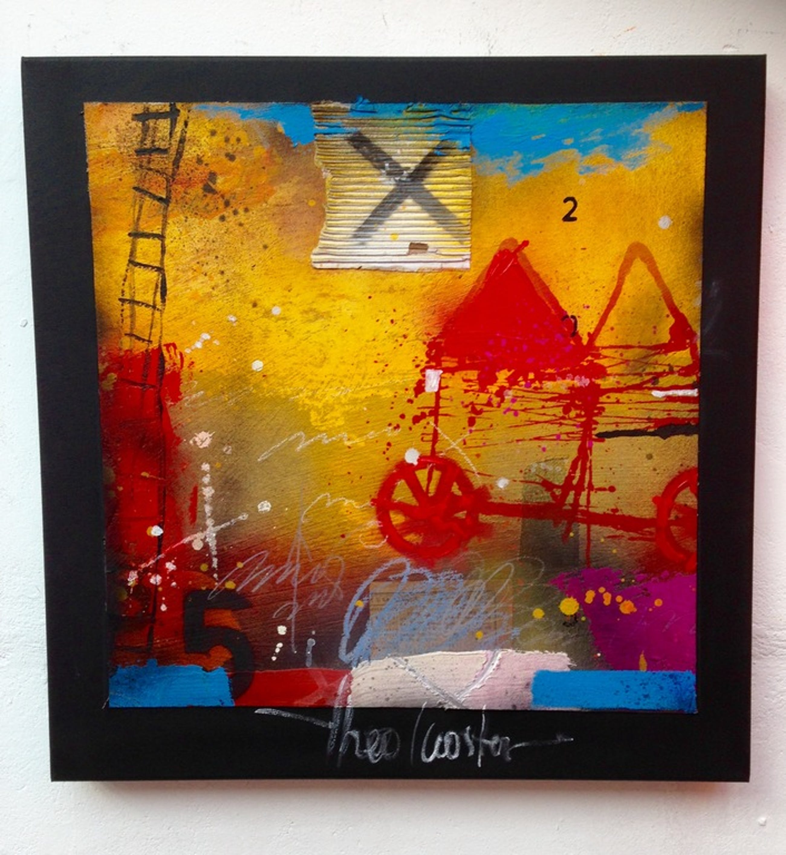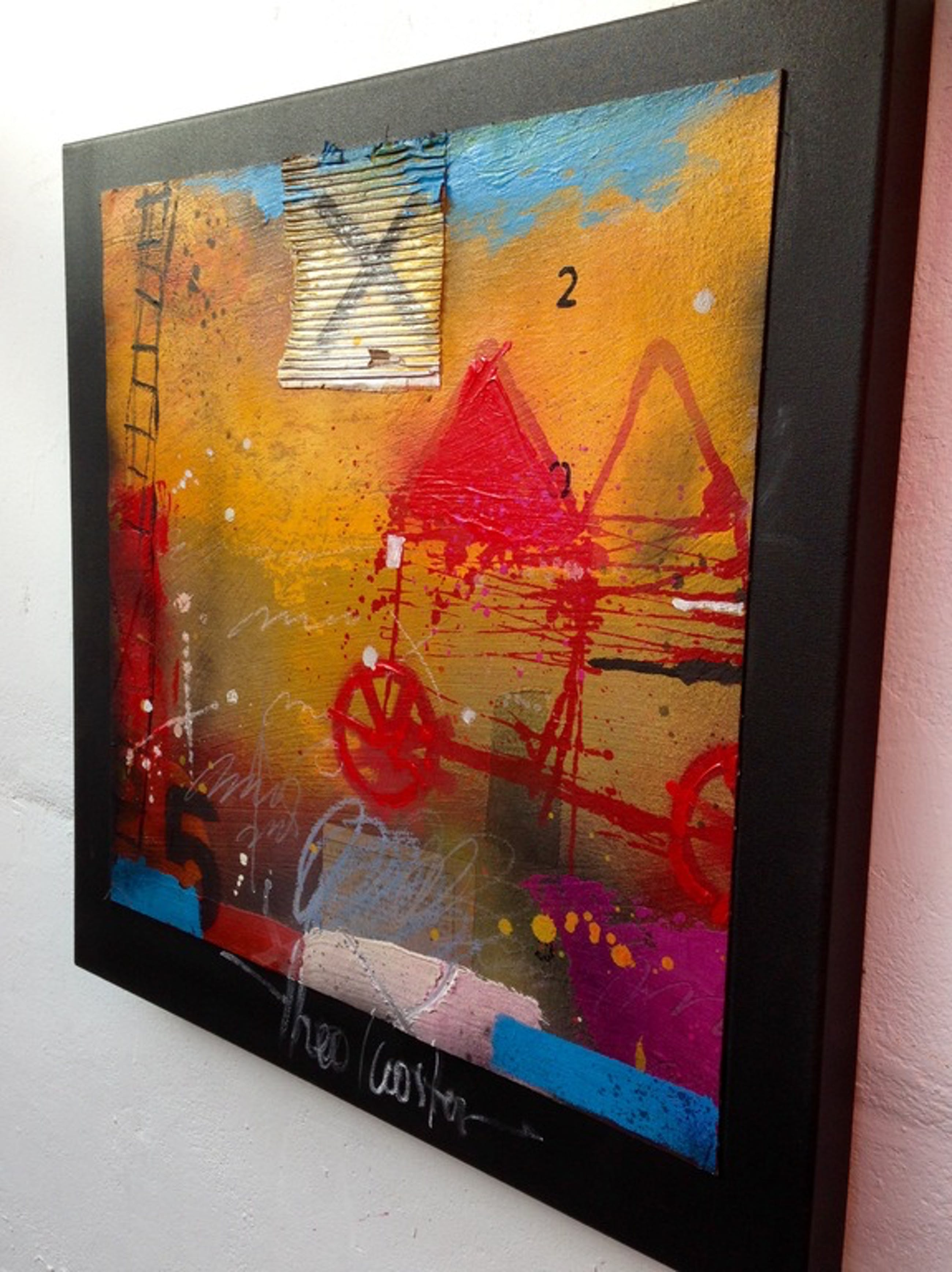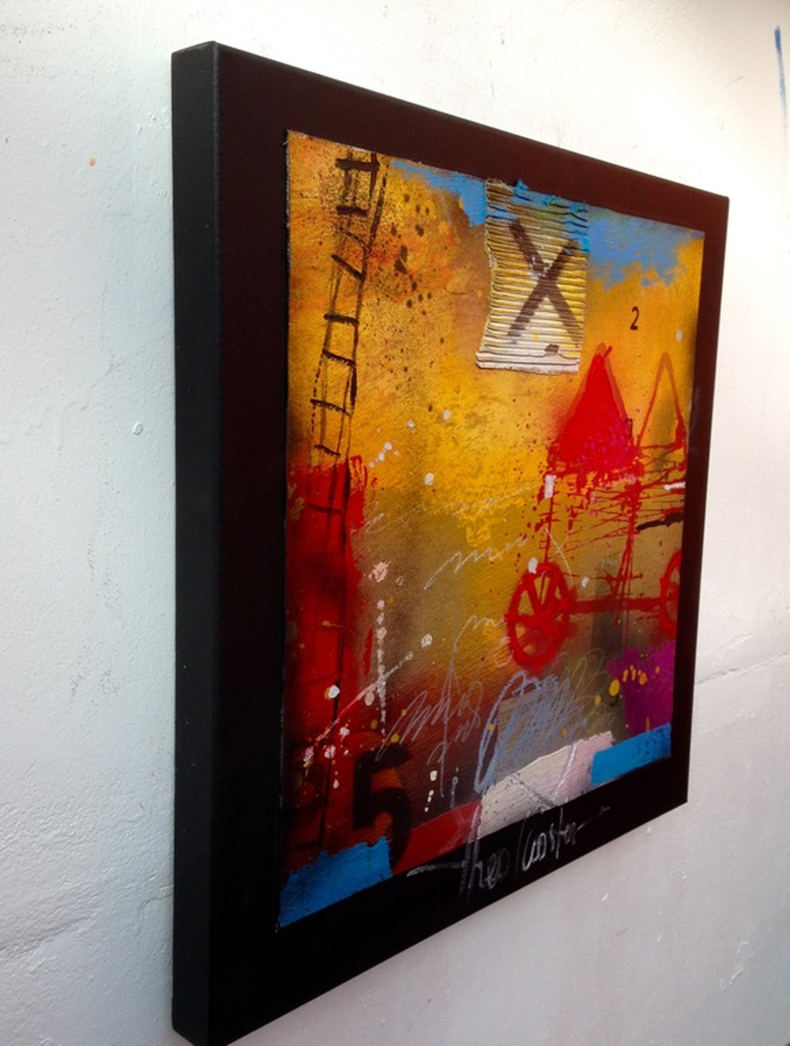 Origineel schilderij in gemengde techniek van de kunstenaar theo koster, afmetingen 60x60x5 cm , titel "on the move" hand gesigneerd , in goede staat , galerie verkoopwaarde 1750,- euro