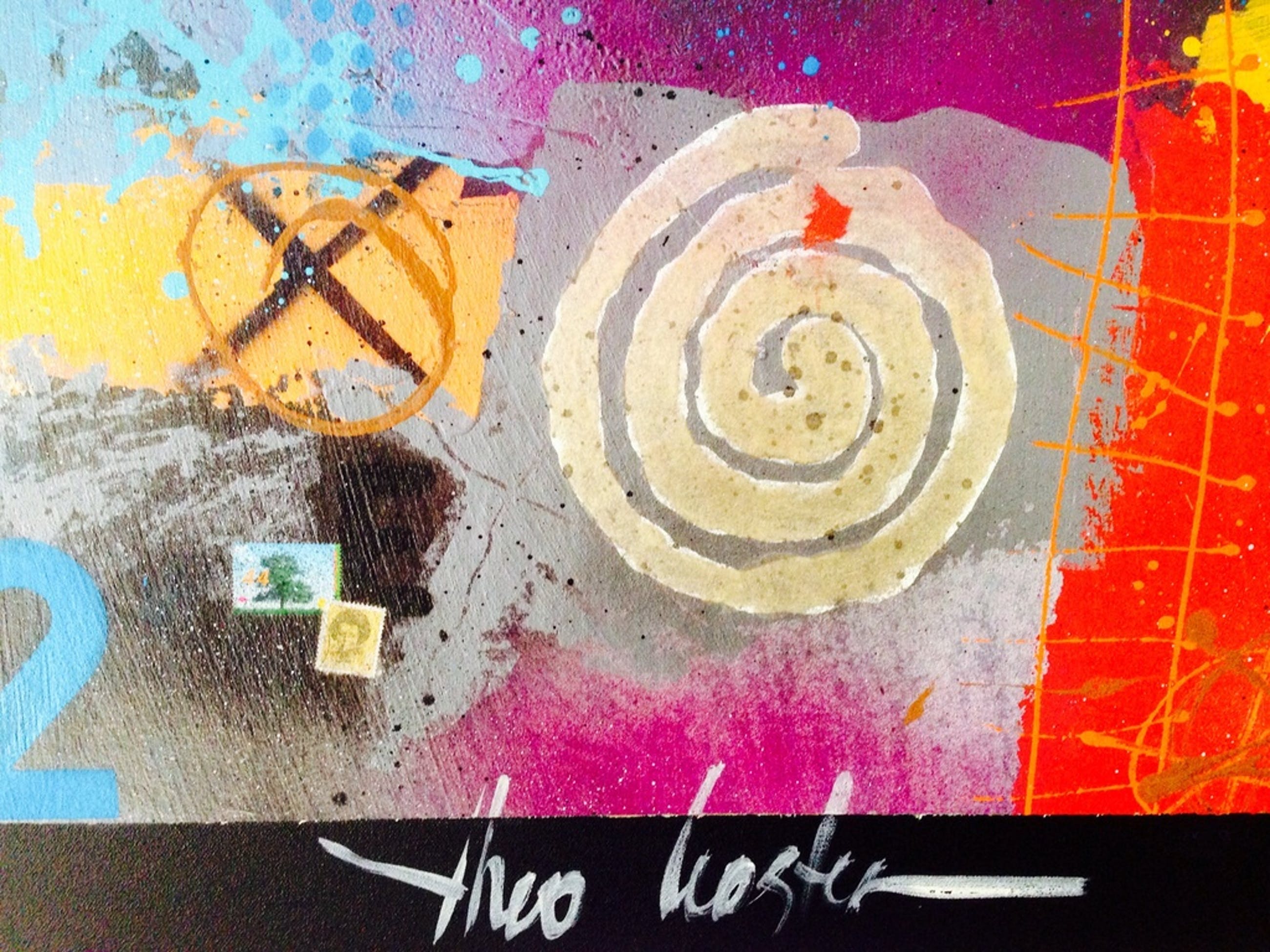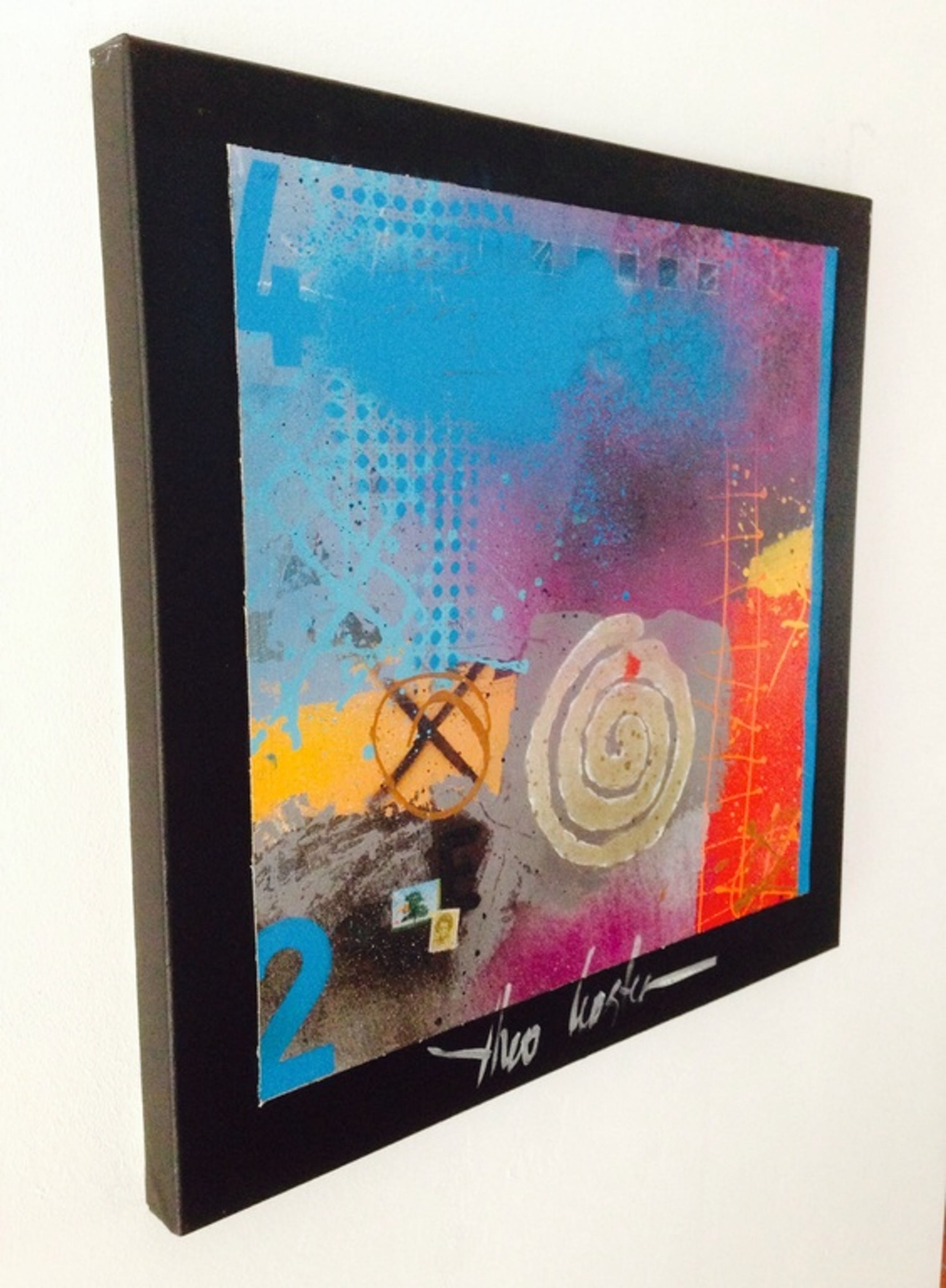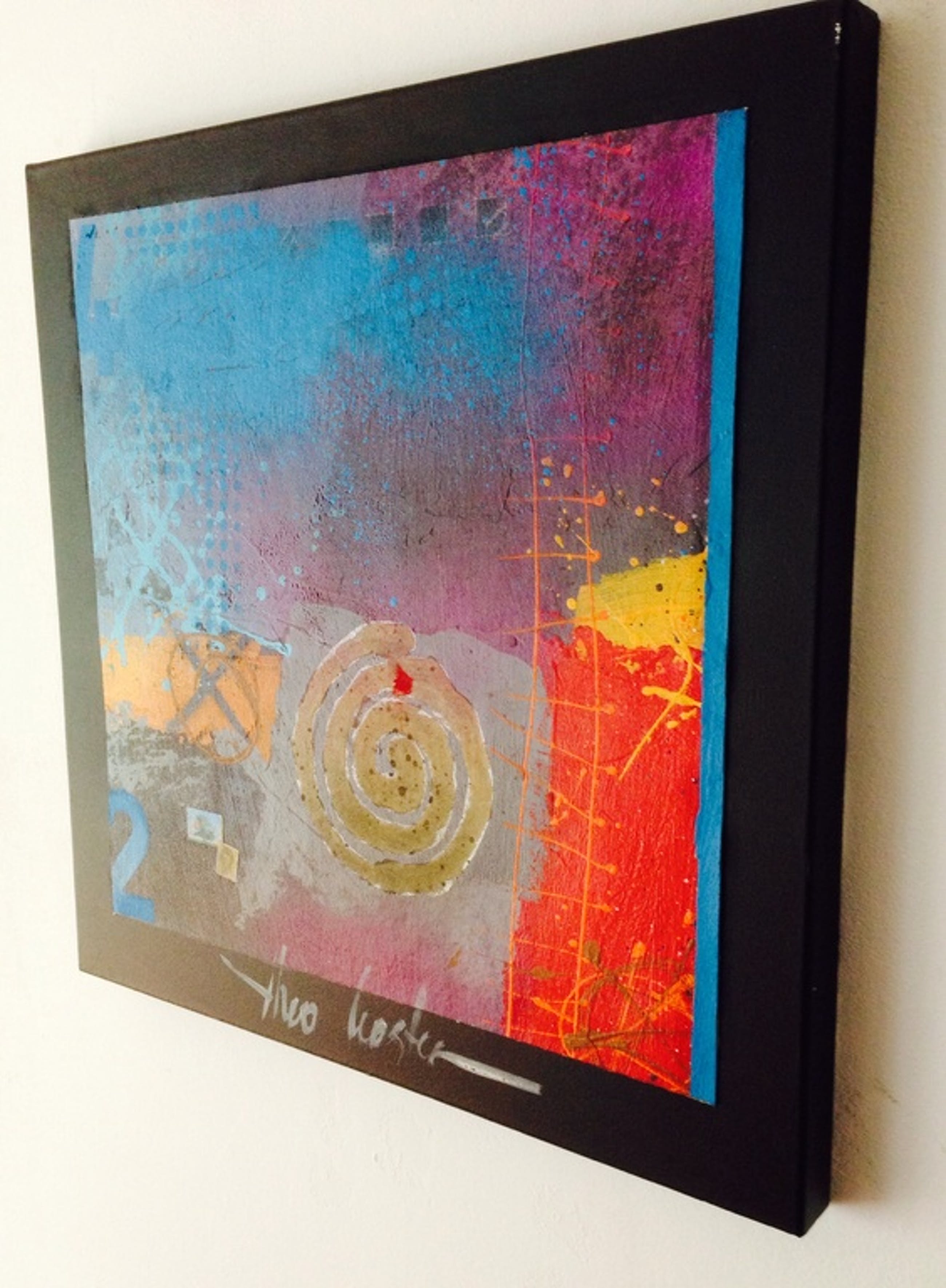 Origineel schilderij in gemengde techniek van de kunstenaar theo koster, handgesigneerd, afmetingen 60x60x4 cm titel: "spin me around " galerie verkoopwaarde € 1500,-