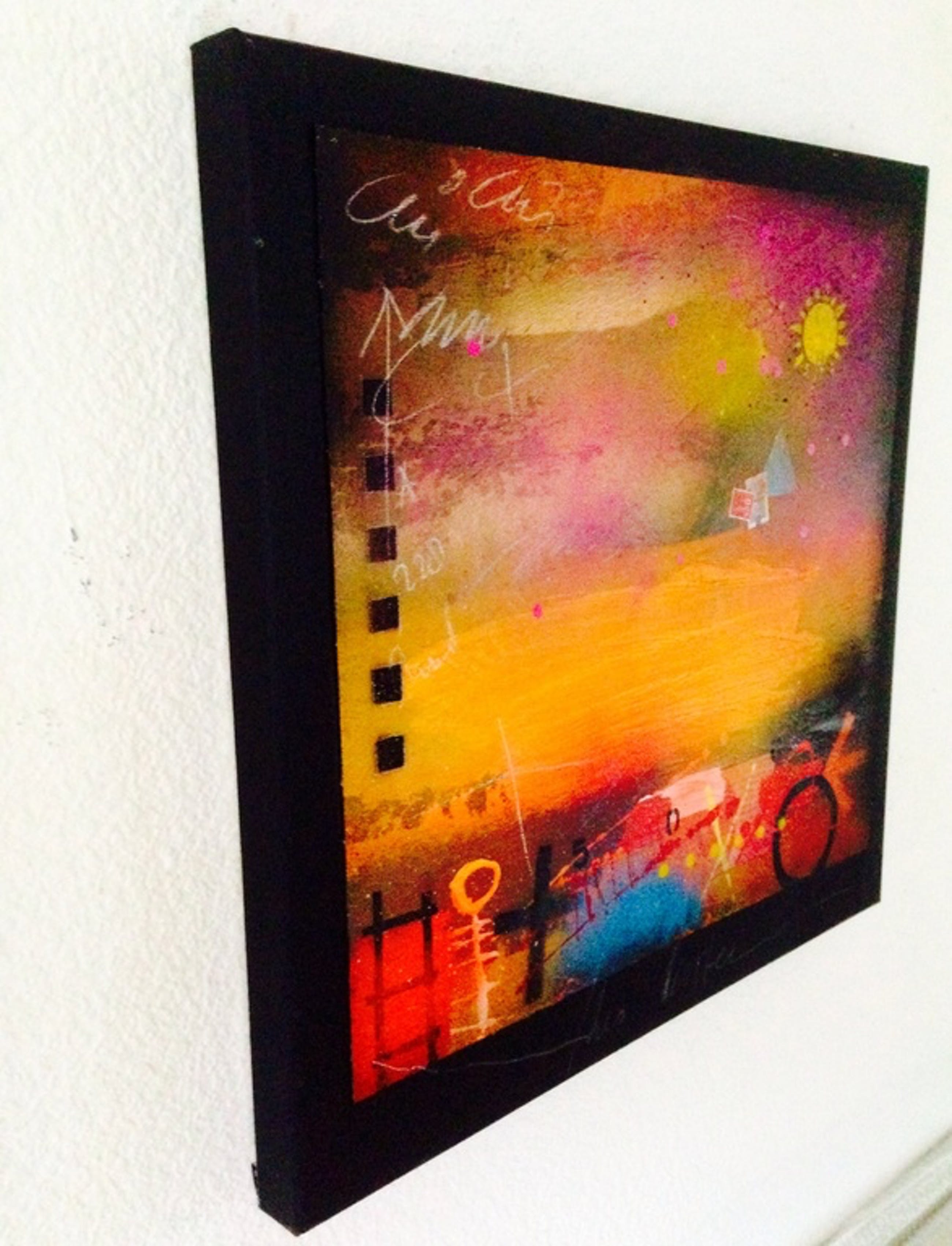 Origineel schilderij in gemengde techniek , van de kunstenaar theo koster, afmetingen 60x60x4,5 cm handgesigneerd in goede staat titel: sunset boulevard galerie verkoopwaarde 1500 €