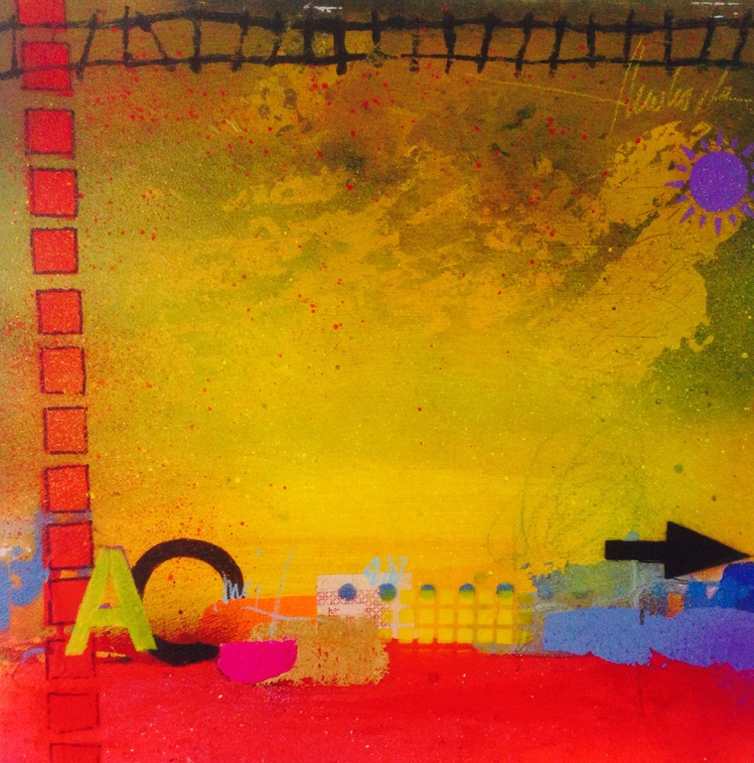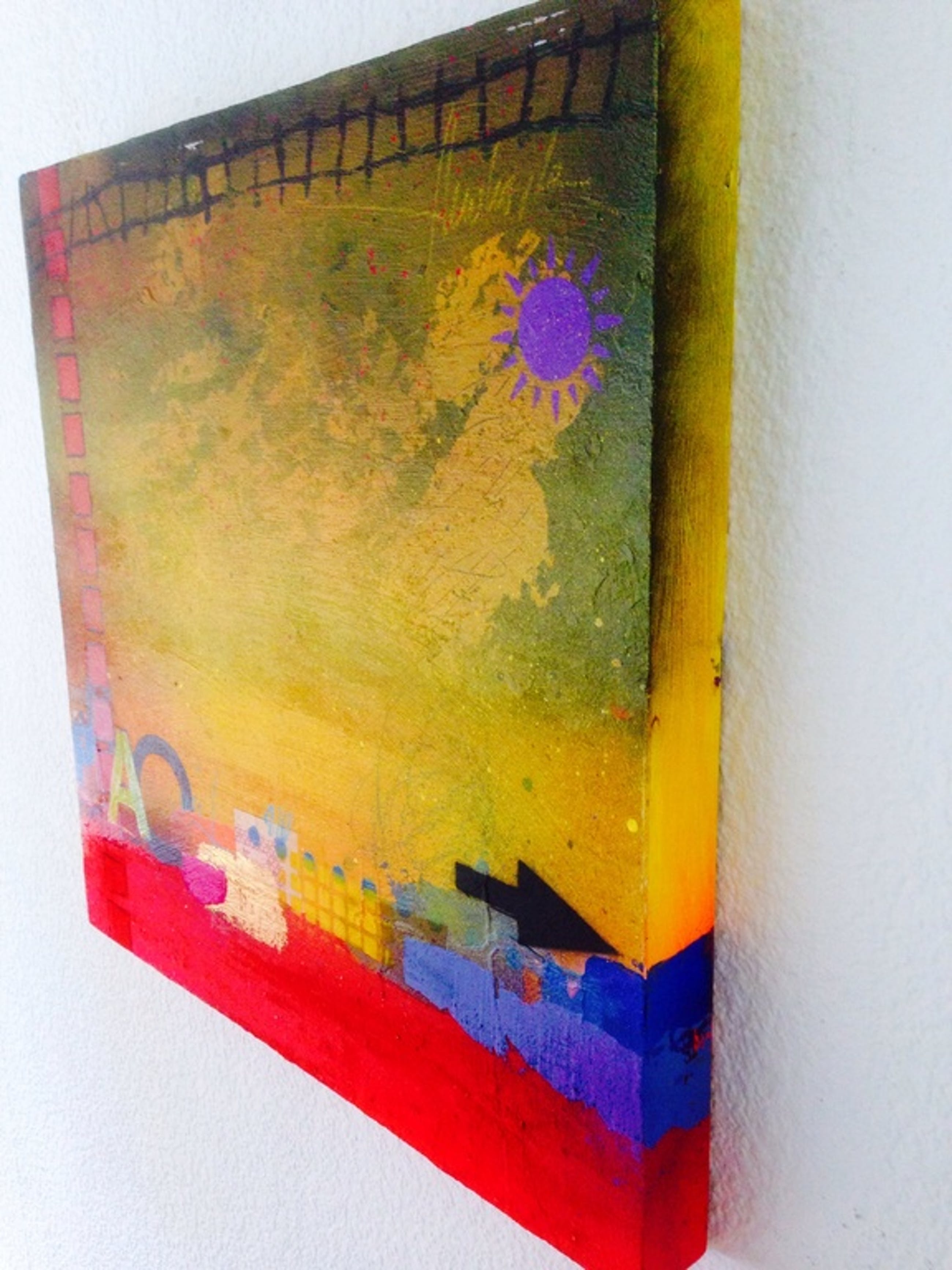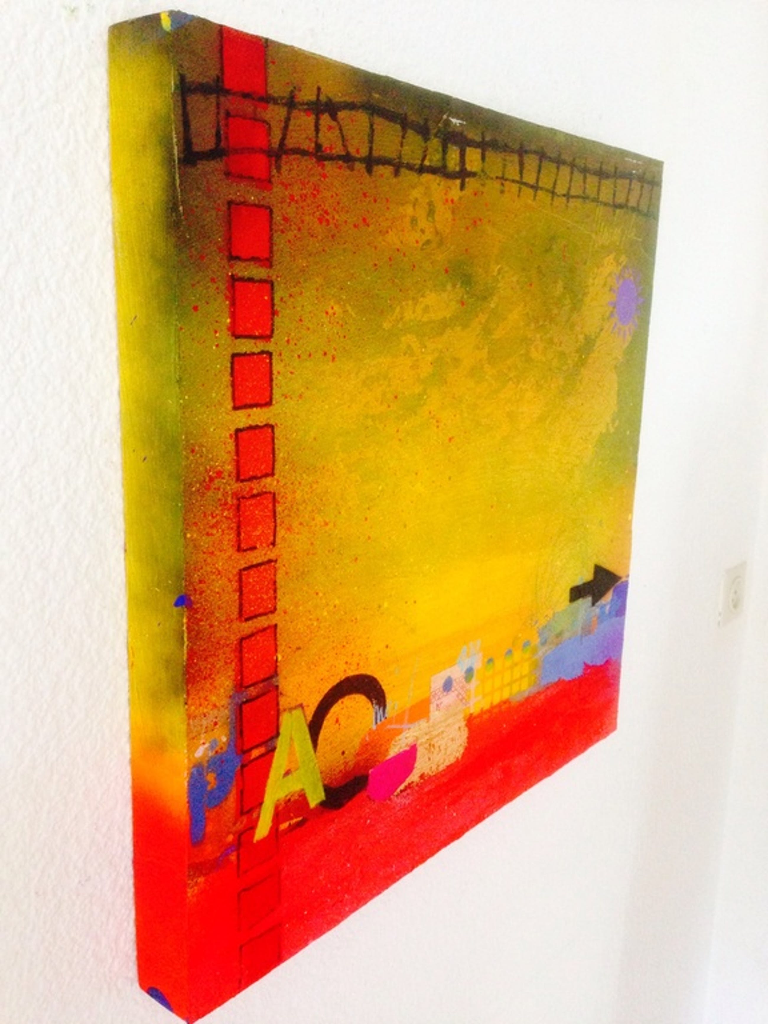 Schilderij in gemengde techniek , van de kunstenaar theo koster afmetingen 55x55x4 cm titel: stairway to heaven , handgesigneerd , galerieverkoop waarde 1250 €.