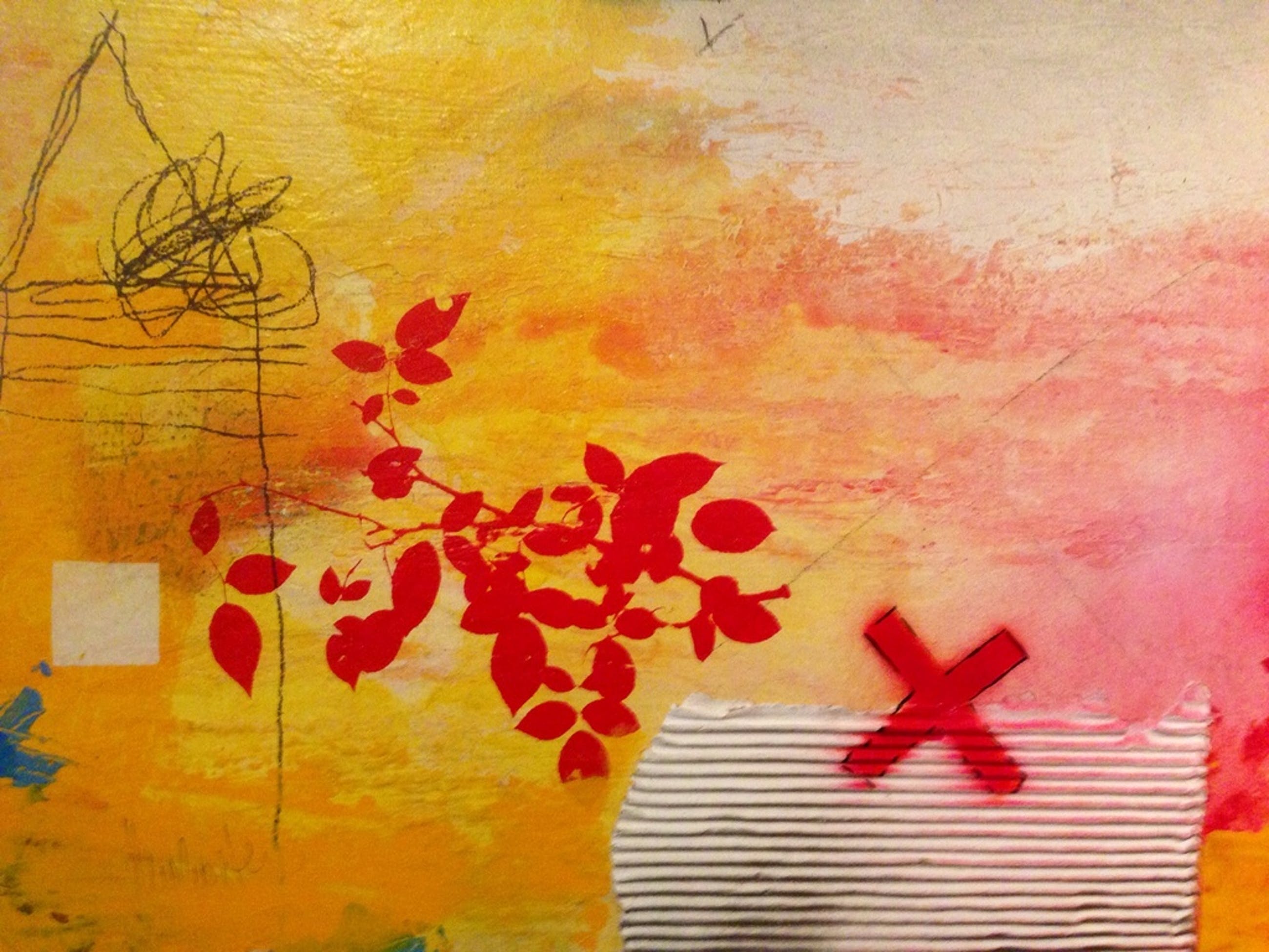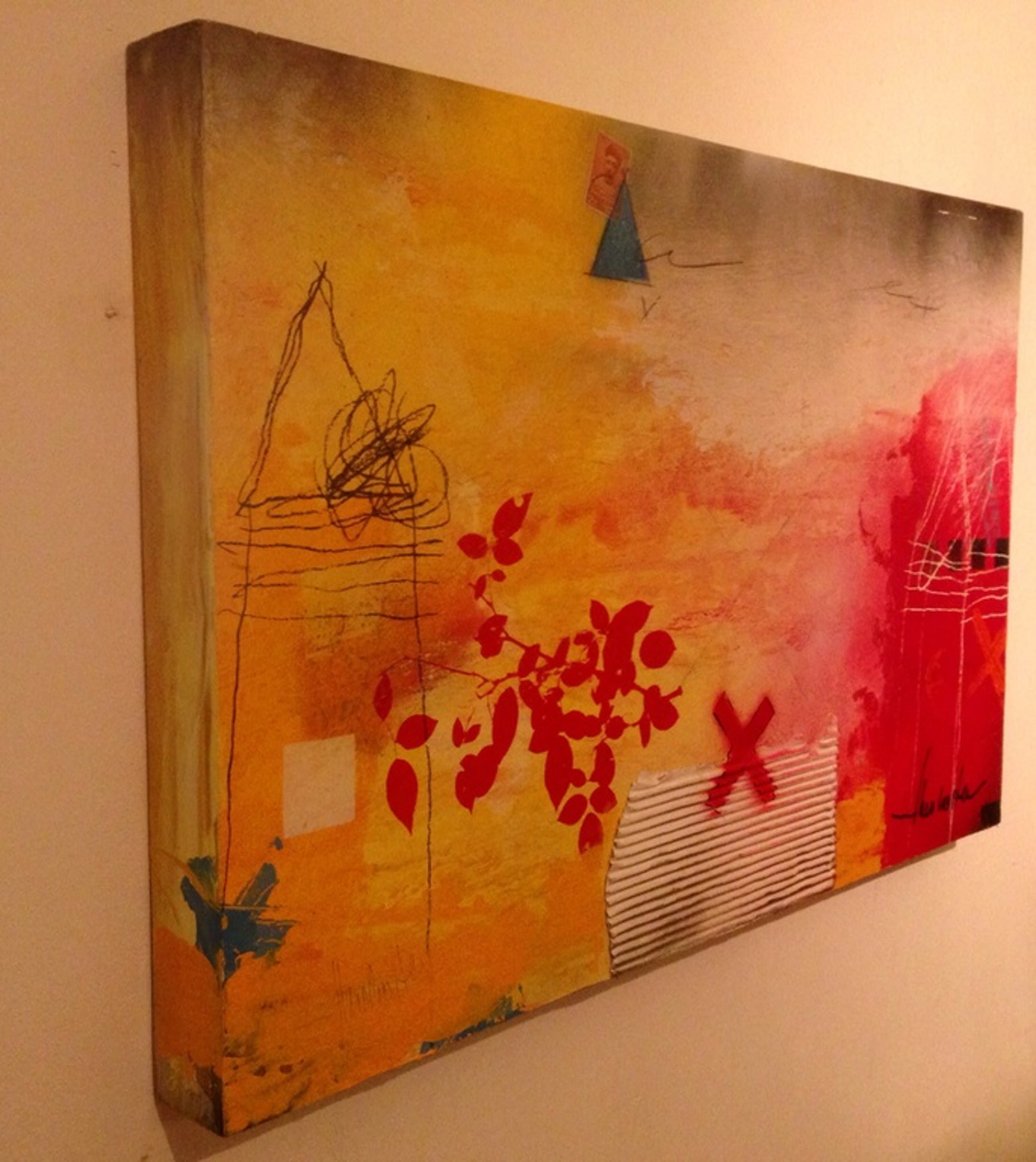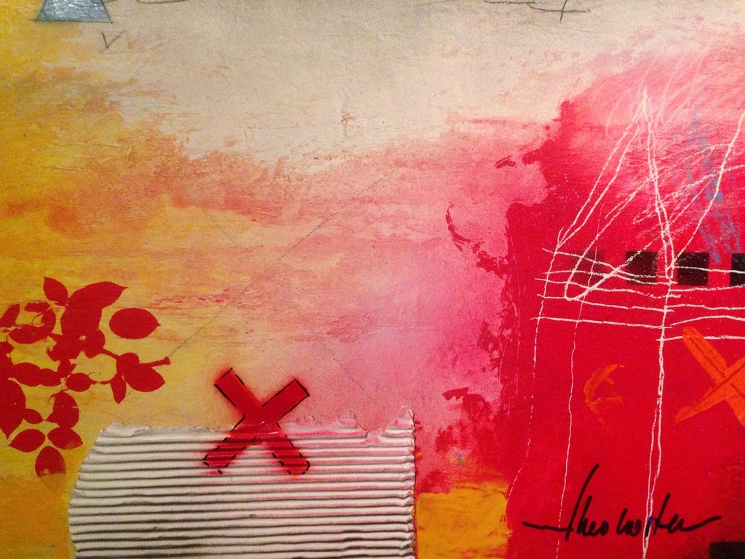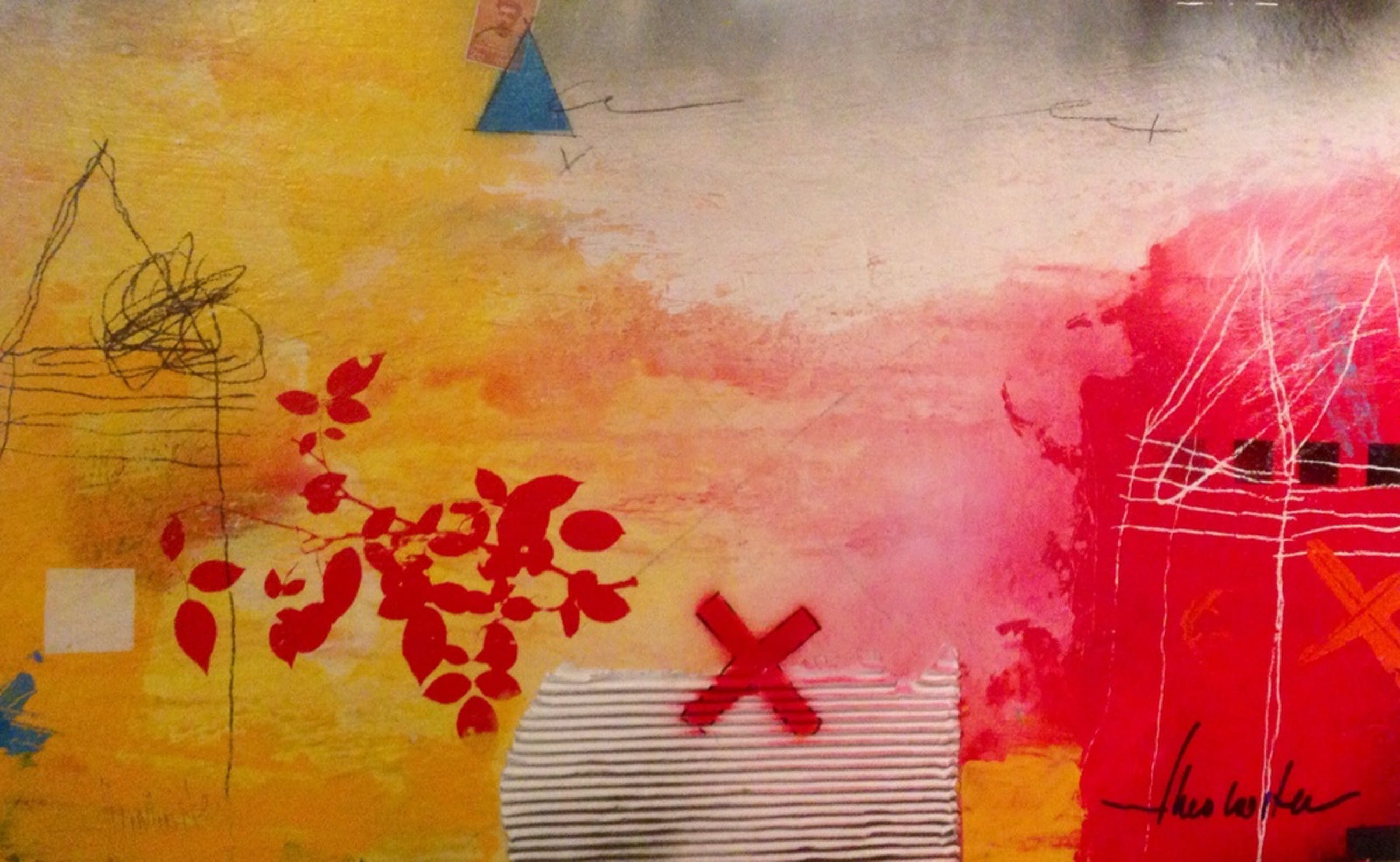 Schilderij van de kunstenaar theo koster in gemengde techniek afmeting 70x45x5 cm titel : traces 1 hand gesigneerd in goede staat .