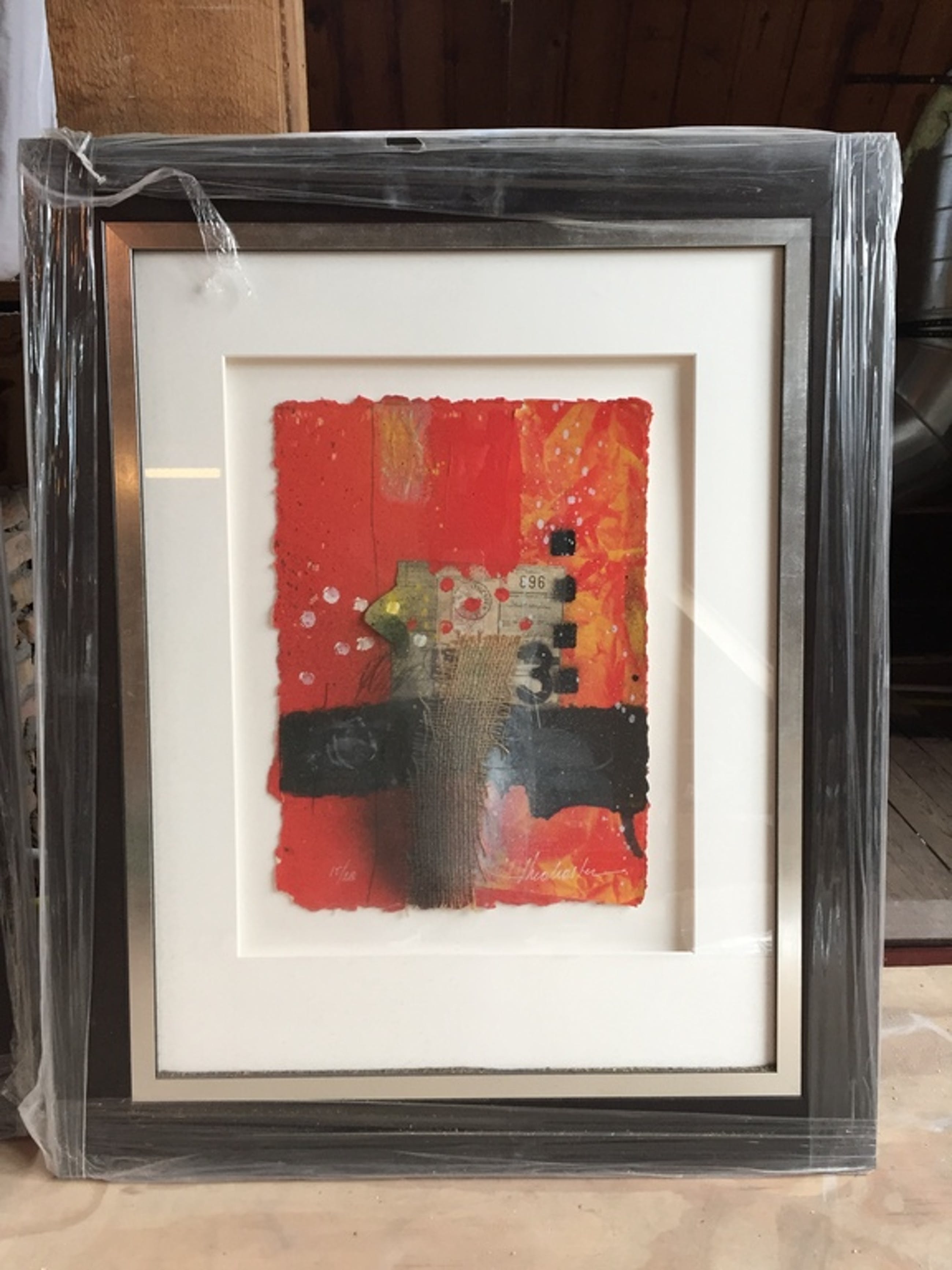 Zeefdruk op handgeschept papier van Theo Koster. Titel : 3. Oplage 28 stuks, dit is nummer 15. Formaat zeefdruk 30 x 40 cm. Volledig zuurvrij ingelijst, opgelegd met verdiept passepartout. Lijstmaat 65 x 80 cm. Handgesigneerd en genummerd.