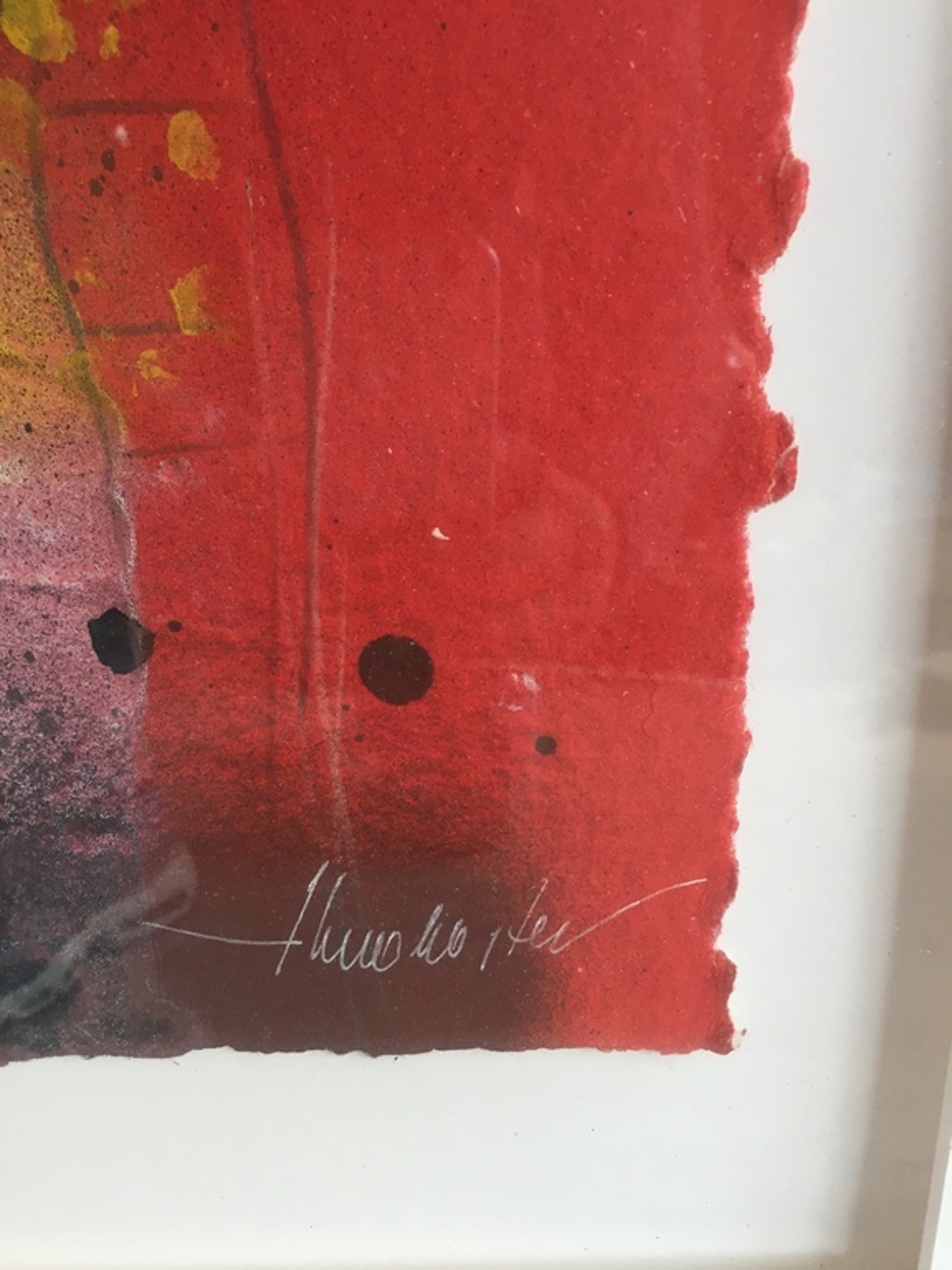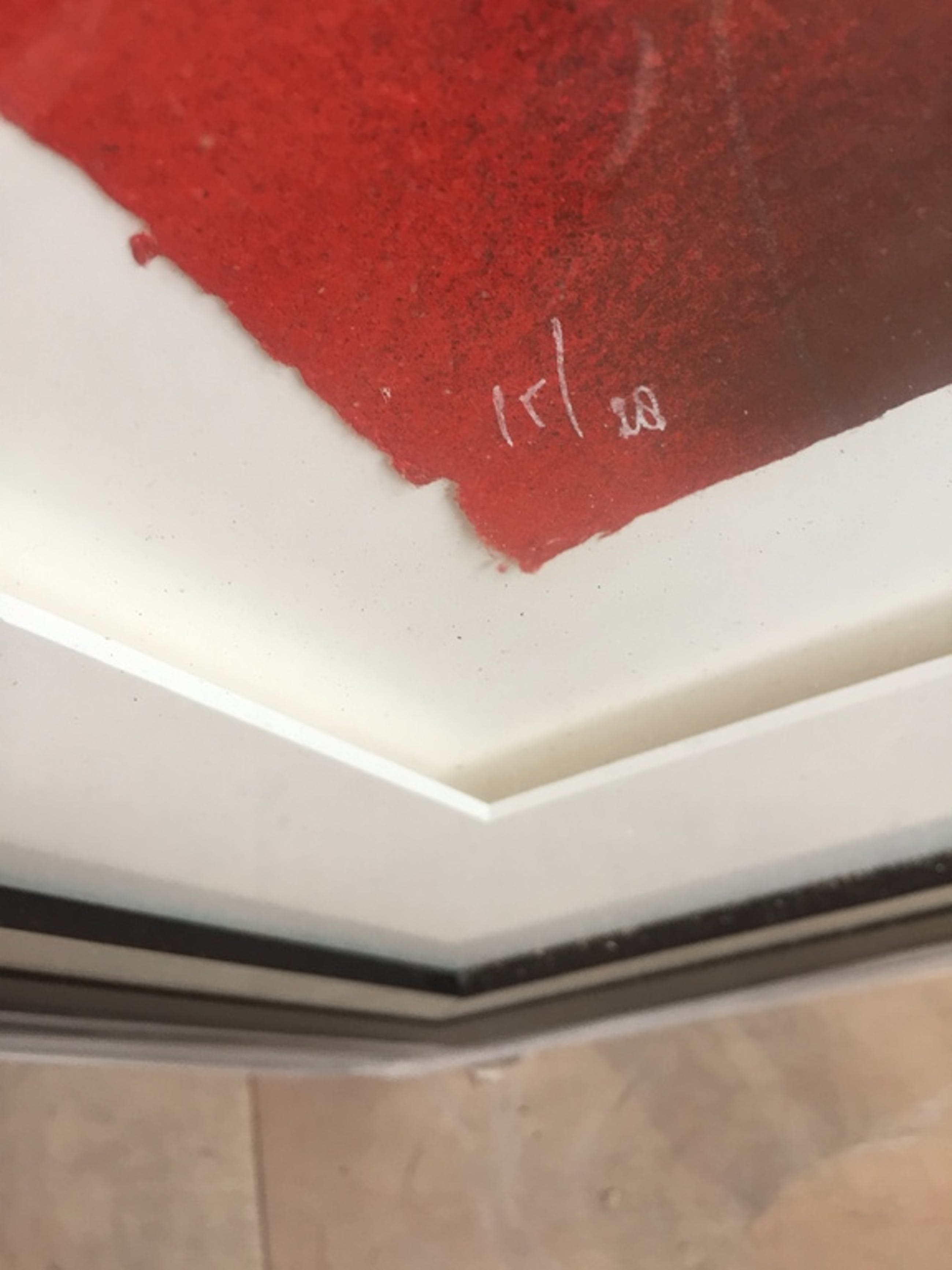 Zeefdruk op handgeschept papier van Theo Koster. Titel : 5. Oplage 28 stuks, dit is nummer 15. Formaat zeefdruk 30 x 40 cm. Volledig zuurvrij ingelijst, opgelegd met verdiept passepartout. Lijstmaat 65 x 80 cm. Handgesigneerd en genummerd.