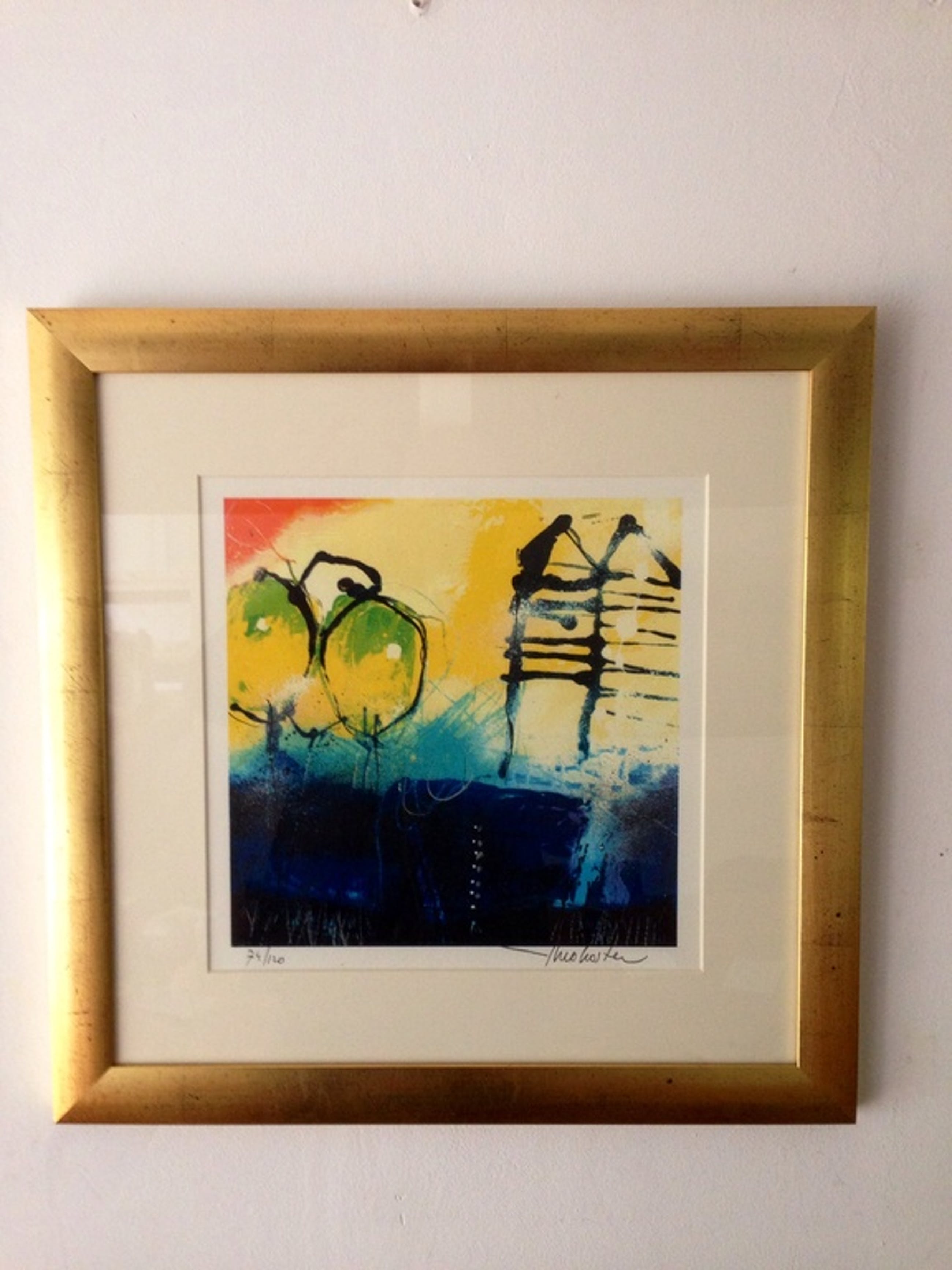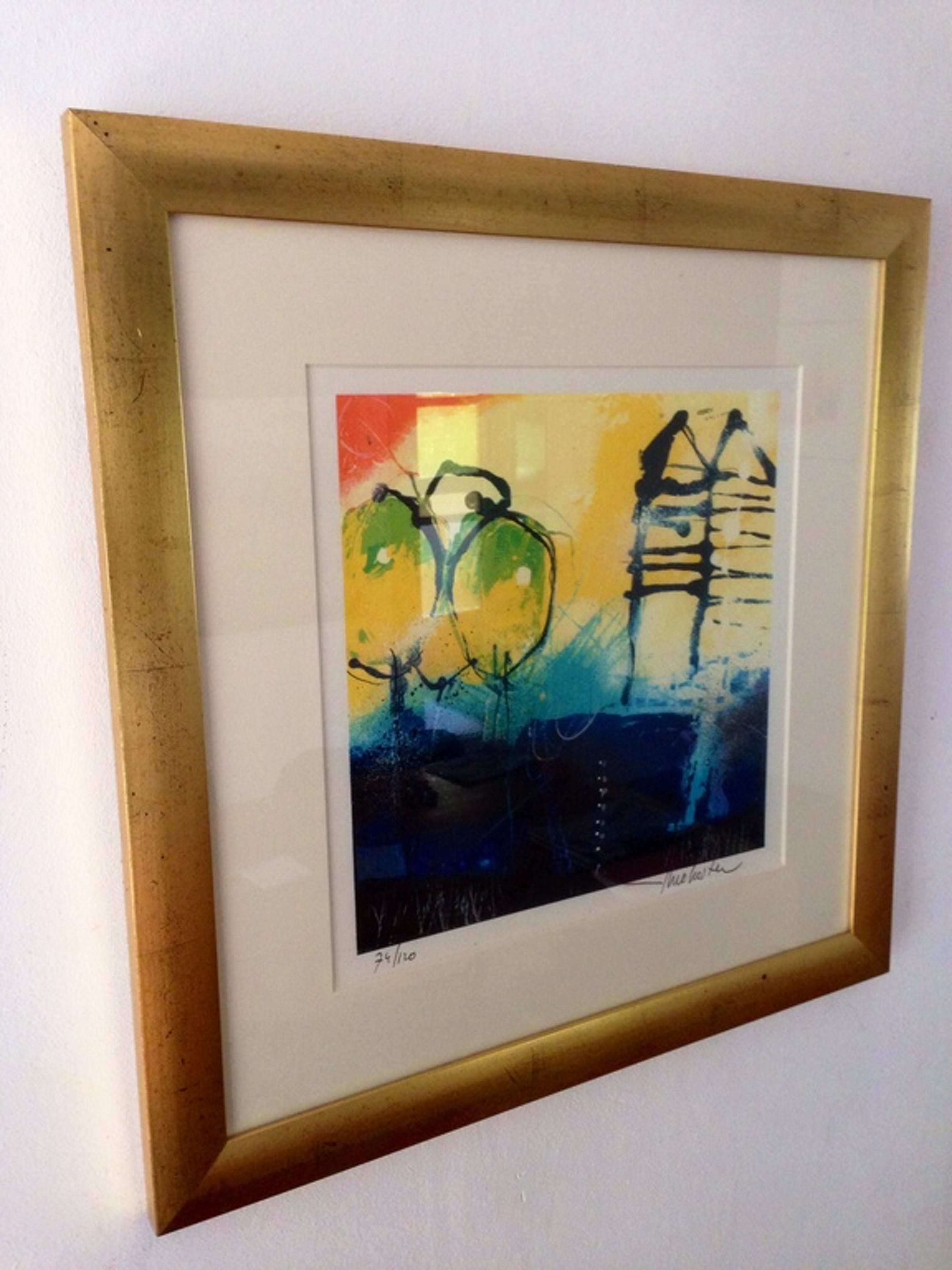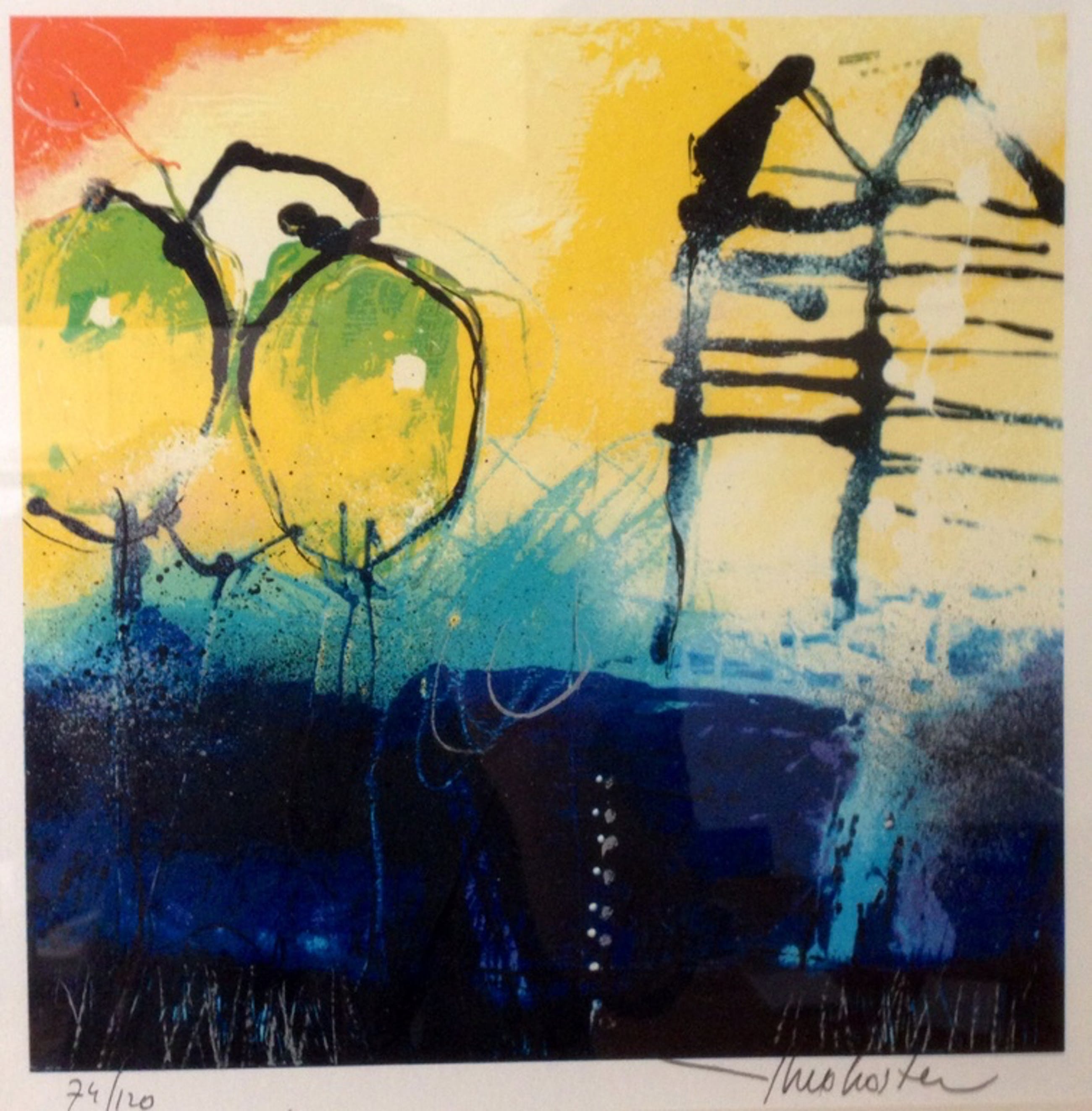 Prachtig ingelijste (bladgoud) zeefdruk , van theo koster .titel : homeland , afmeting 50x50 cm handgesigneerd oplagenr. 74/120 galerieverkoop waarde 650 €