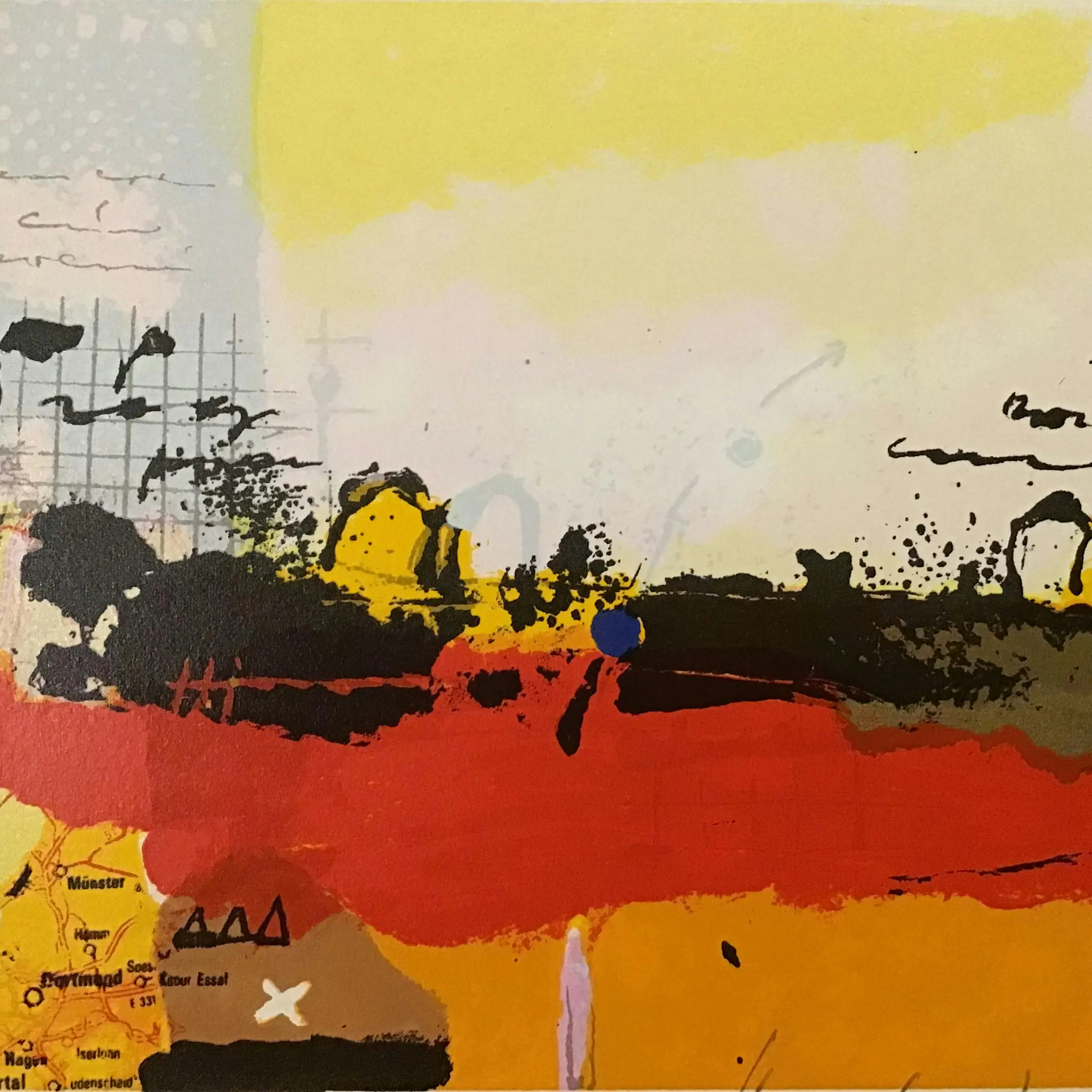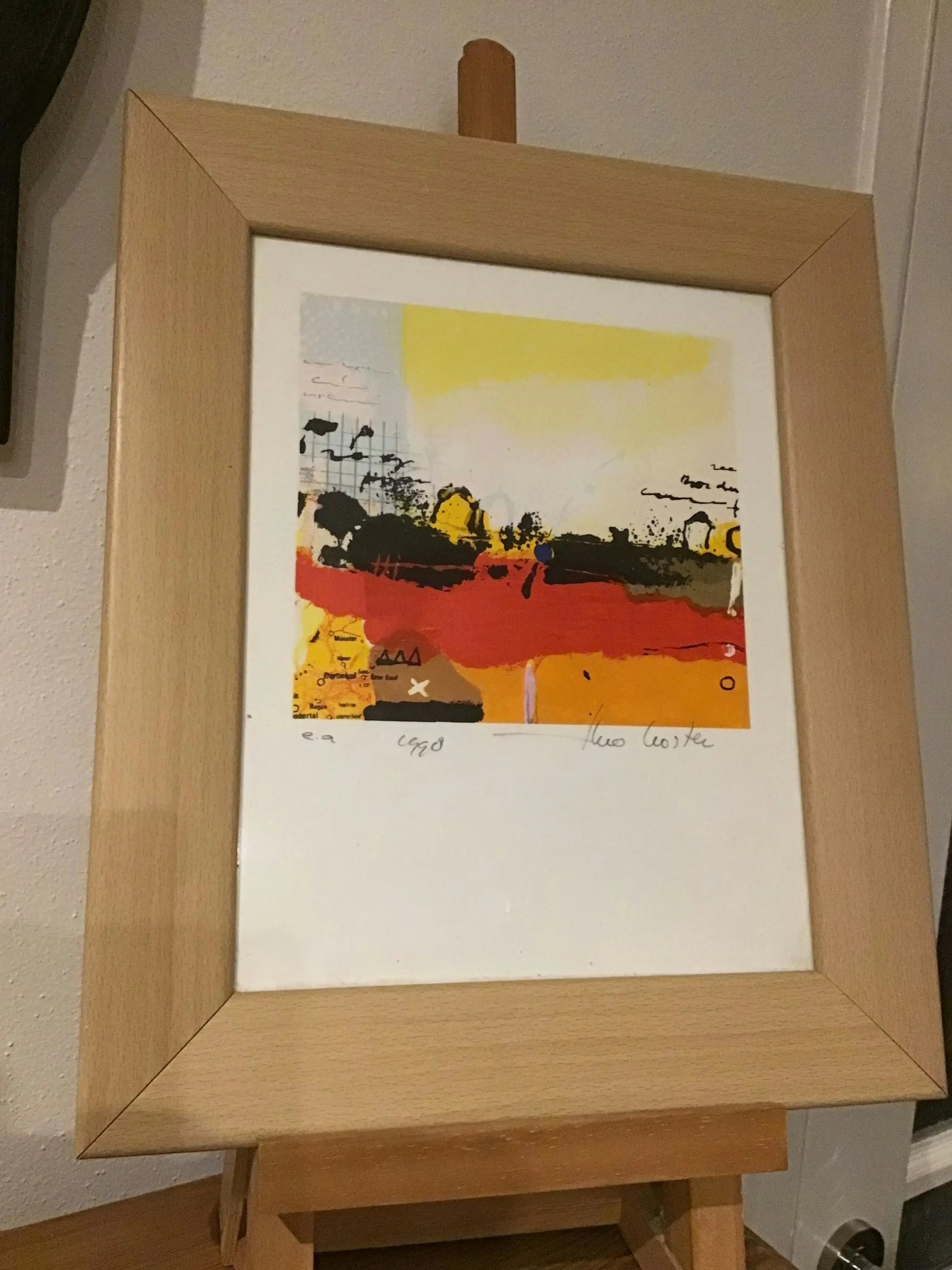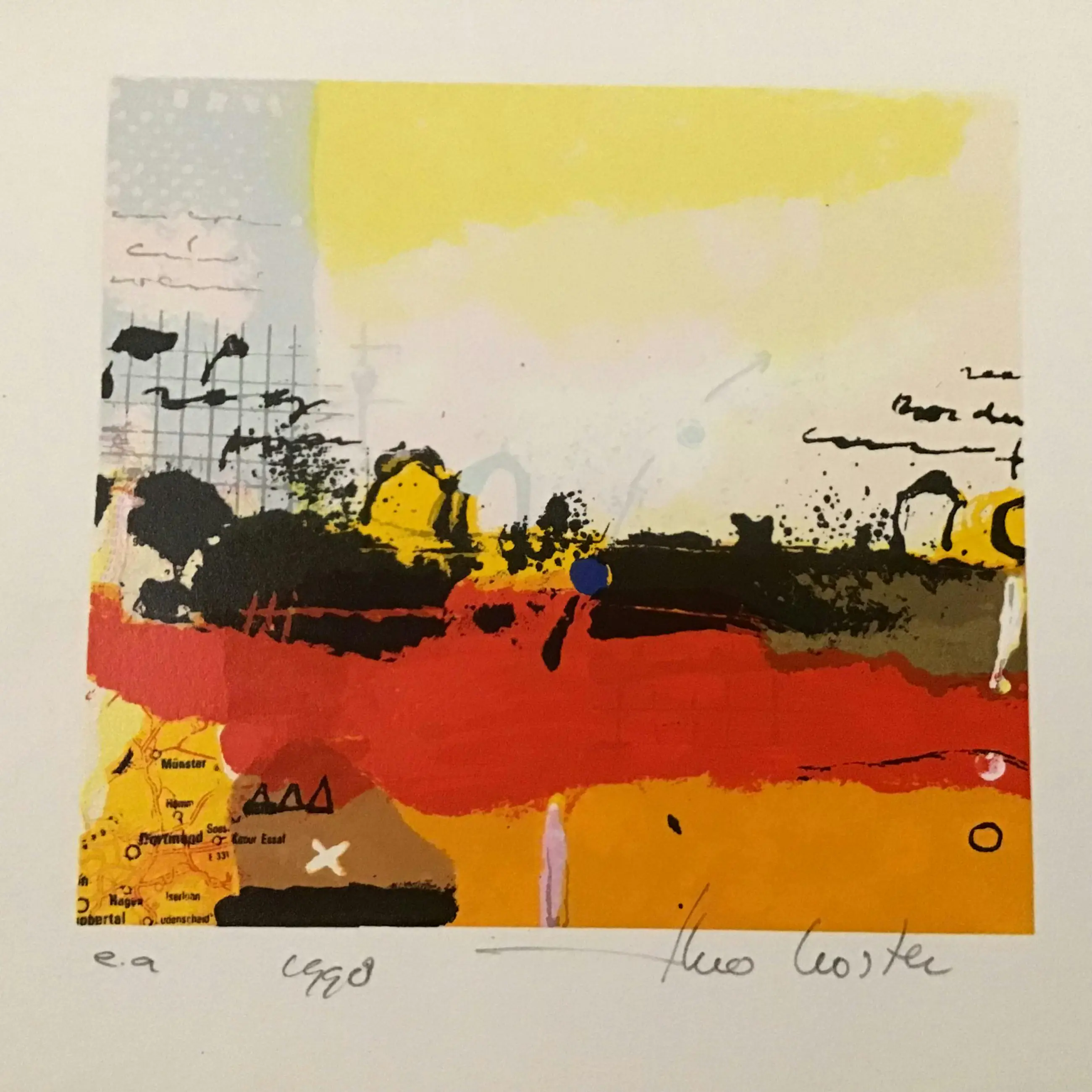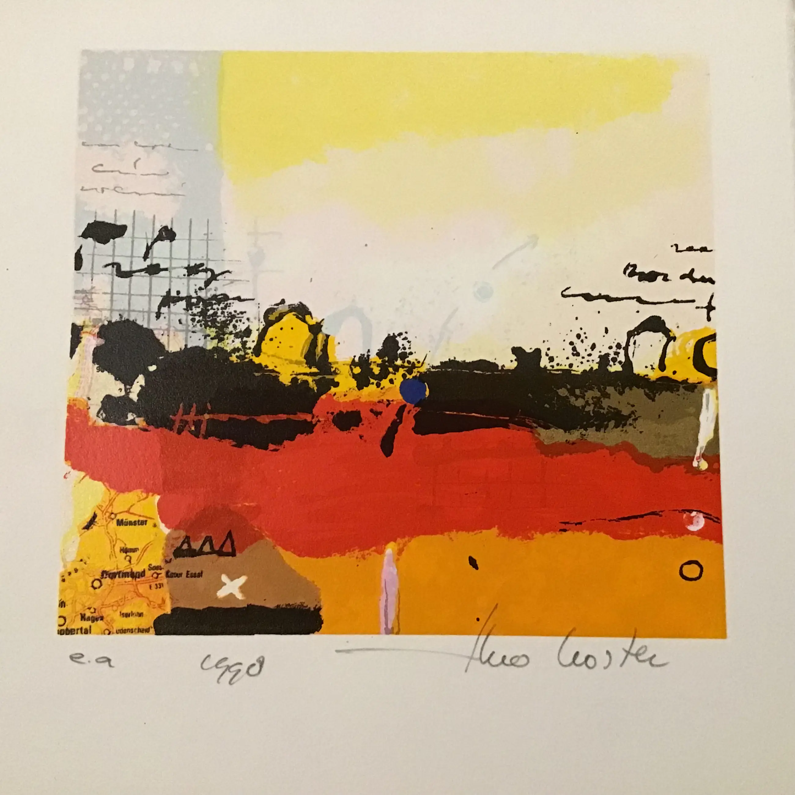 Perfecte zeefdruk. Theo Koster (Emmeloord, Nederland, 1952) volgde zijn opleiding aan de Gerrit Rietveld Academie in Amsterdam en aan de Academie voor Beeldende Kunst in Arnhem. Toen al waren zijn schilderijen landschappelijk van aard, zij het ingetogener dan zijn meer recente werk en hij ontwikkelde een eigen beeldtaal die hij tot op de dag van vandaag gebruikt en uitbreidt. Kenmerkend voor zijn werk is de vlakverdeling; grootse luchten boven land of water met een lage horizon en het heldere kleurgebruik is eigentijds. Zijn gevoel voor de juiste kleurkeuze en de dynamische verfbehandeling creëren een specifieke sfeer in elk afzonderlijk schilderij. Verder maakt hij gebruik van grafische – en collagetechnieken.
