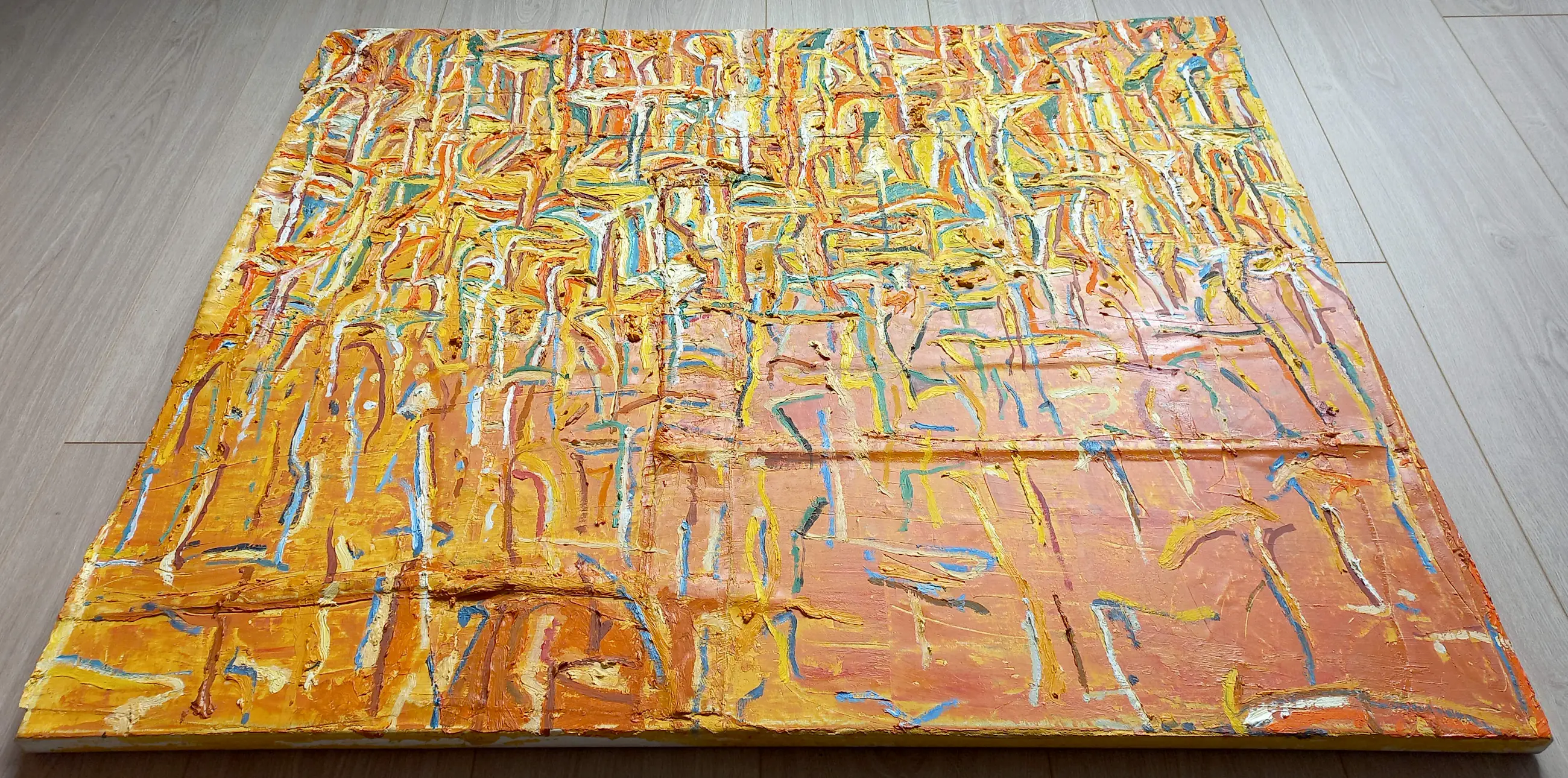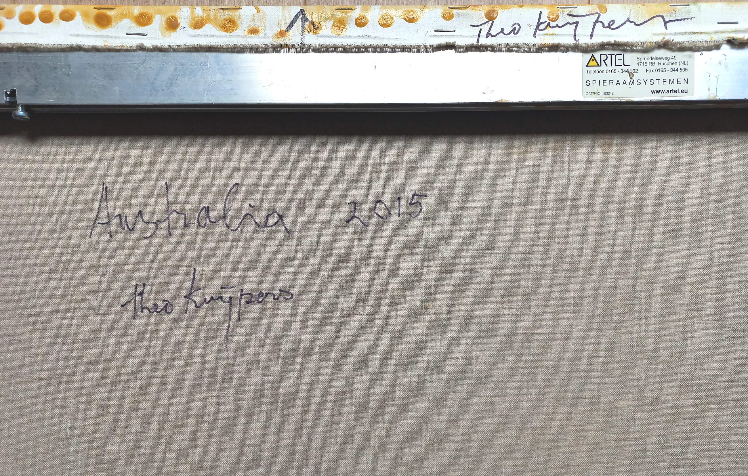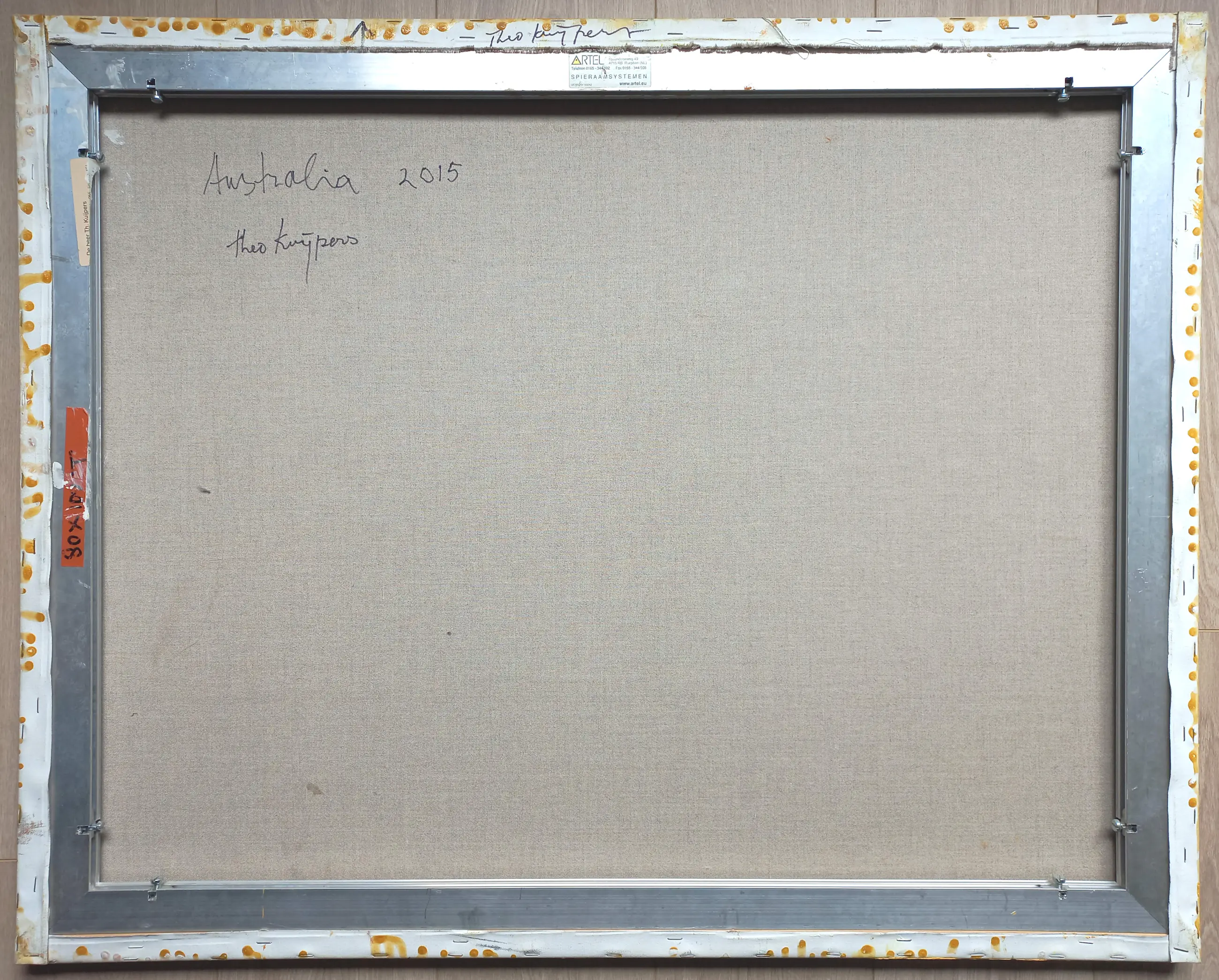 Prachtige lichte compositie van Theo Kuijpers. Olieverf en collage op doek, achterop dubbel gesigneerd, getiteld en gedateerd (2015), op state-of-the-art aluminium Artel spieraam. Over de rand heen geschilderd dus kan/moet zo aan de muur. In zeer goede conditie.