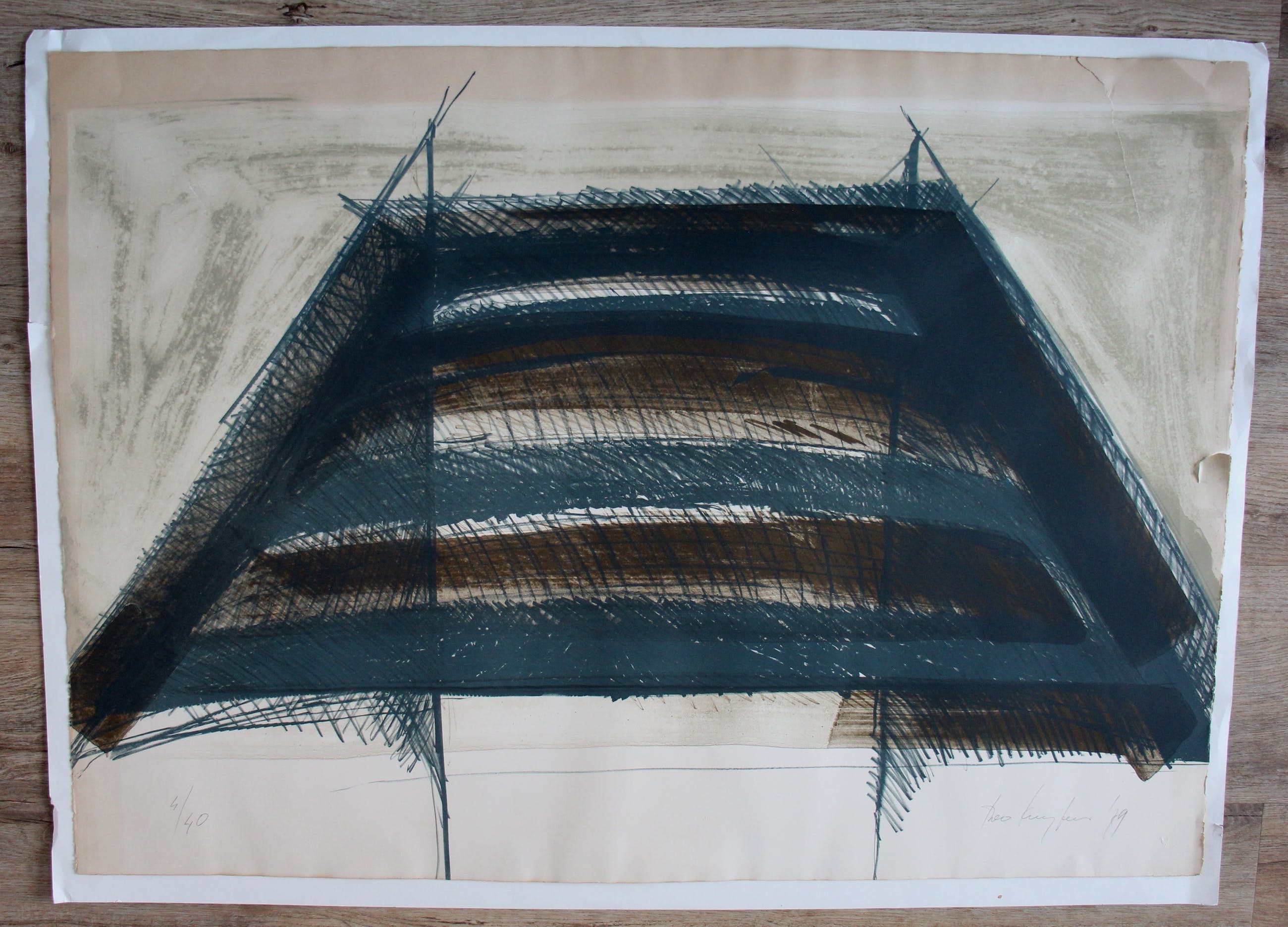 Litho van Theo Kuijpers. Jaar: 1979. Nummer: 4/40. Afmetingen blad: H80 x b110cm. Afmetingen voorstelling: H63.5 x b106cm. Het werk is rechts onderin gesigneerd door de kunstenaar. De authenticiteit van het aangeboden werk wordt volledig gegarandeerd. Een certificaat van echtheid kan, op aanvraag, worden gemaild.