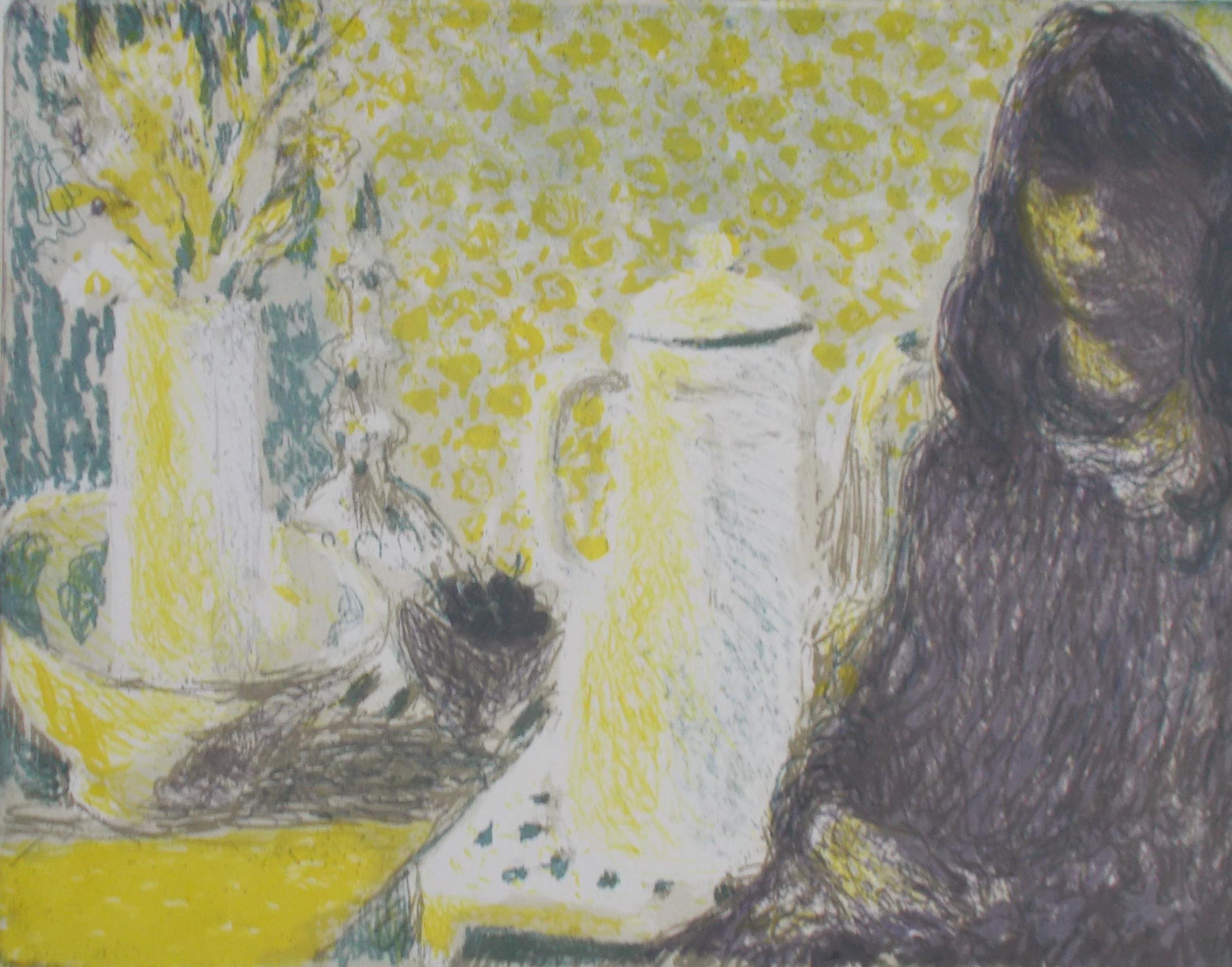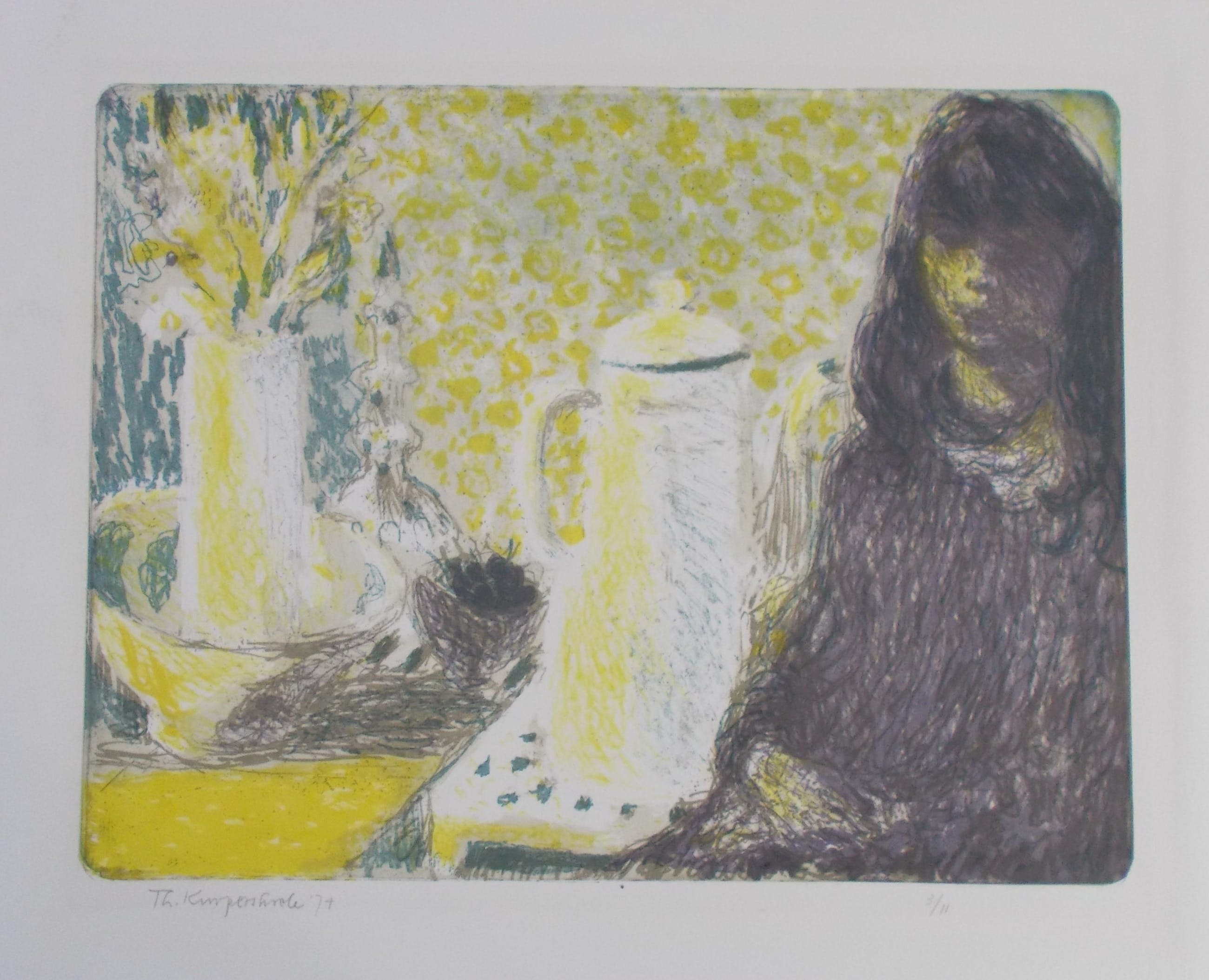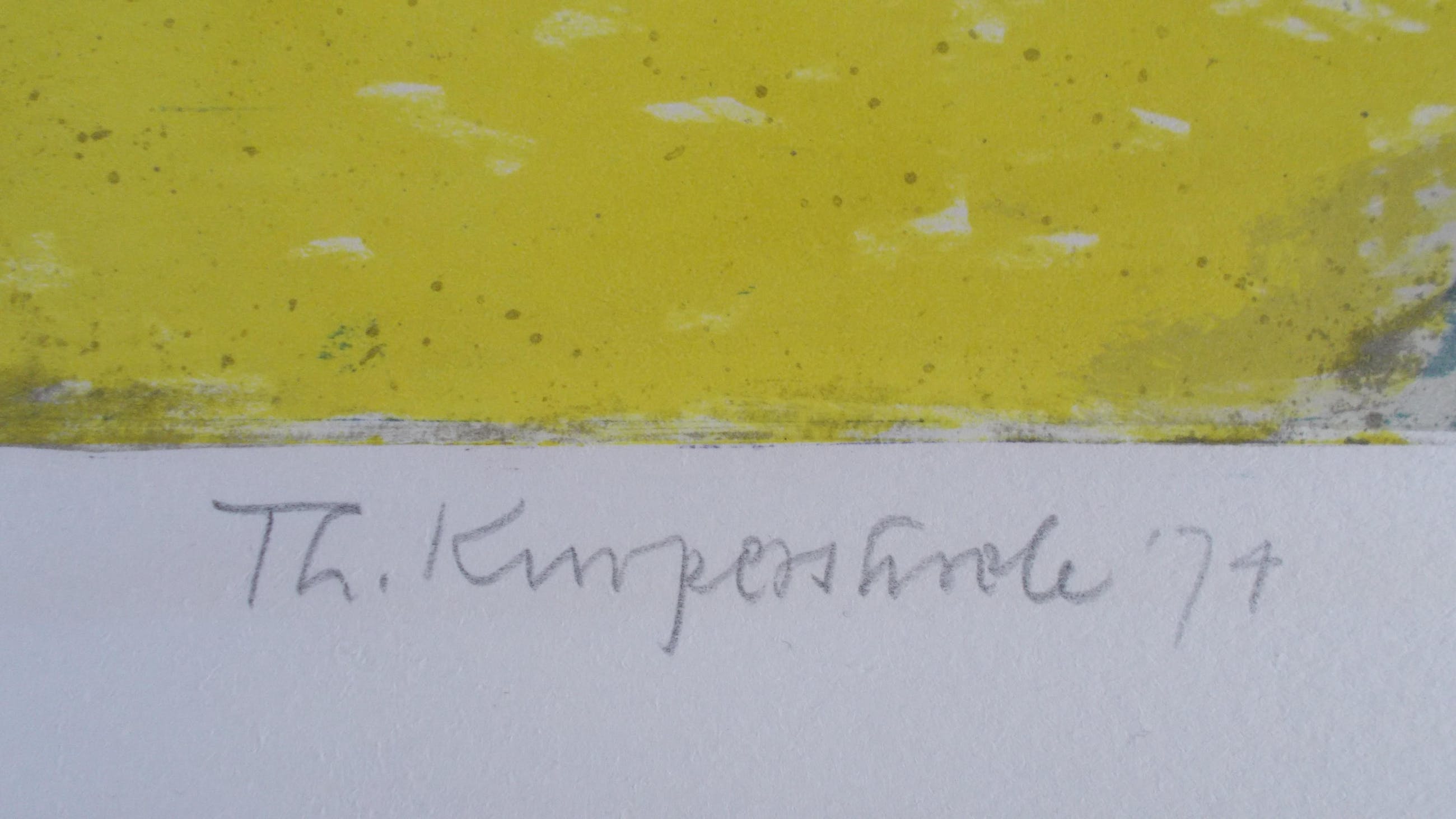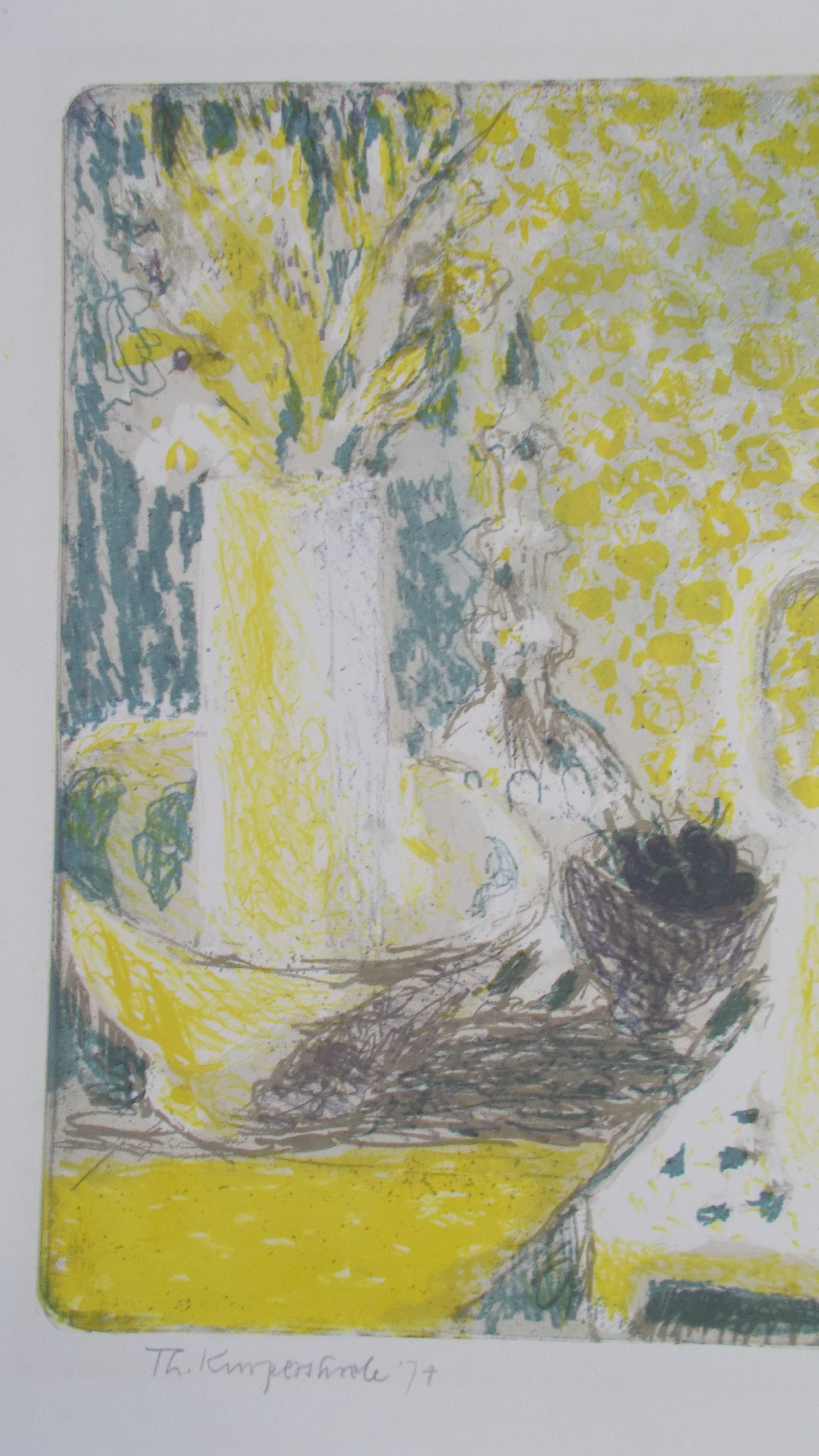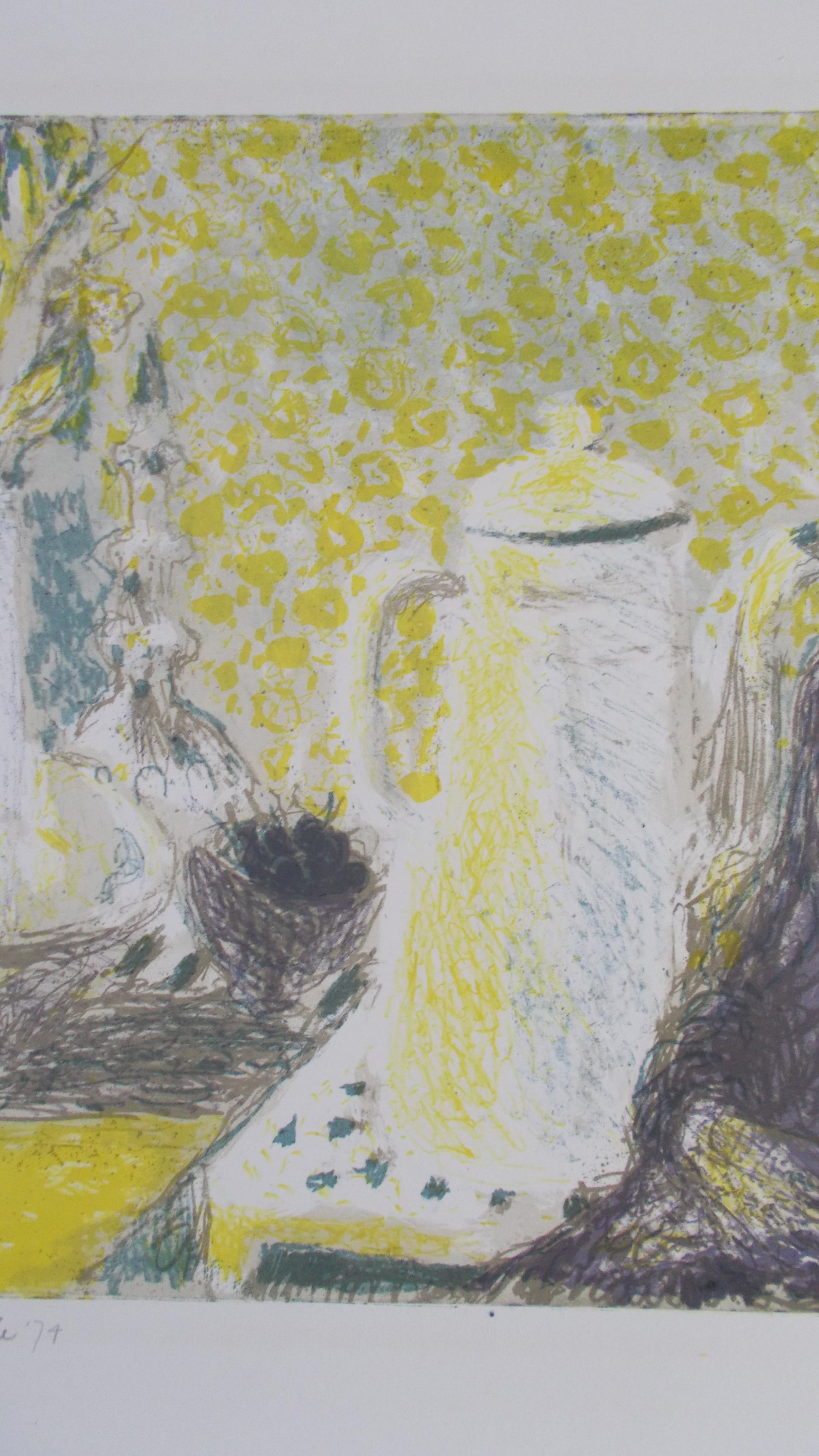Kleurenlitho uit 1974.Potlood gesigneerd en gedateerd linksonder.Genummerd 3/11 rechtsonder. (zeer kleine oplage!!)Beeldmaat 34,5 x 45 cm.Bladmaat 43,5 x 54 cm.Losbladig.