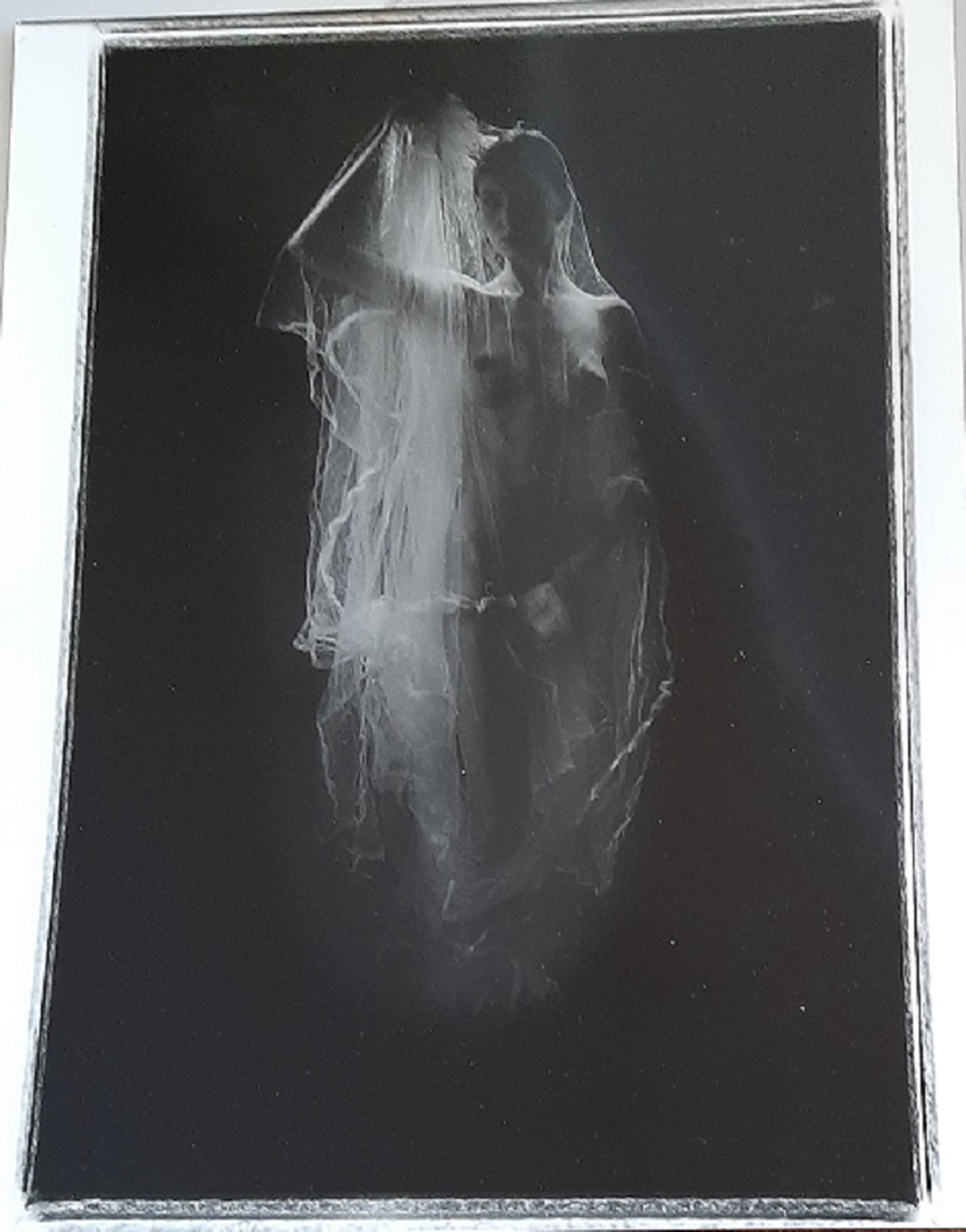 Mooi gefotografeerd naakt vrouwelijk model onder doorzichtig tule door Theo Lode de Leede