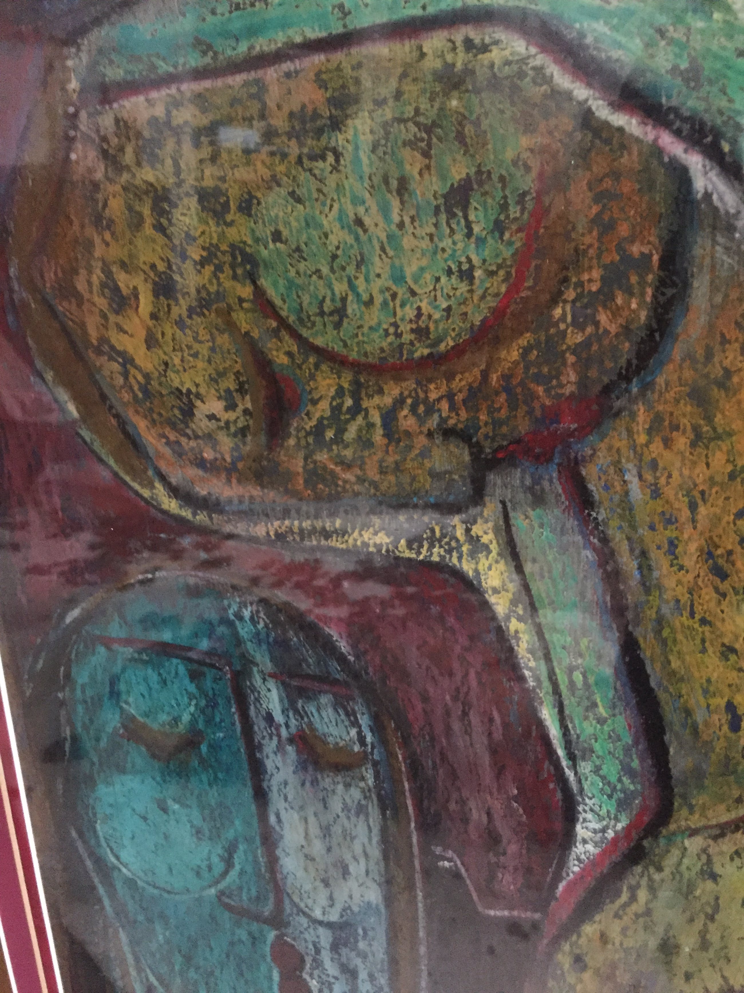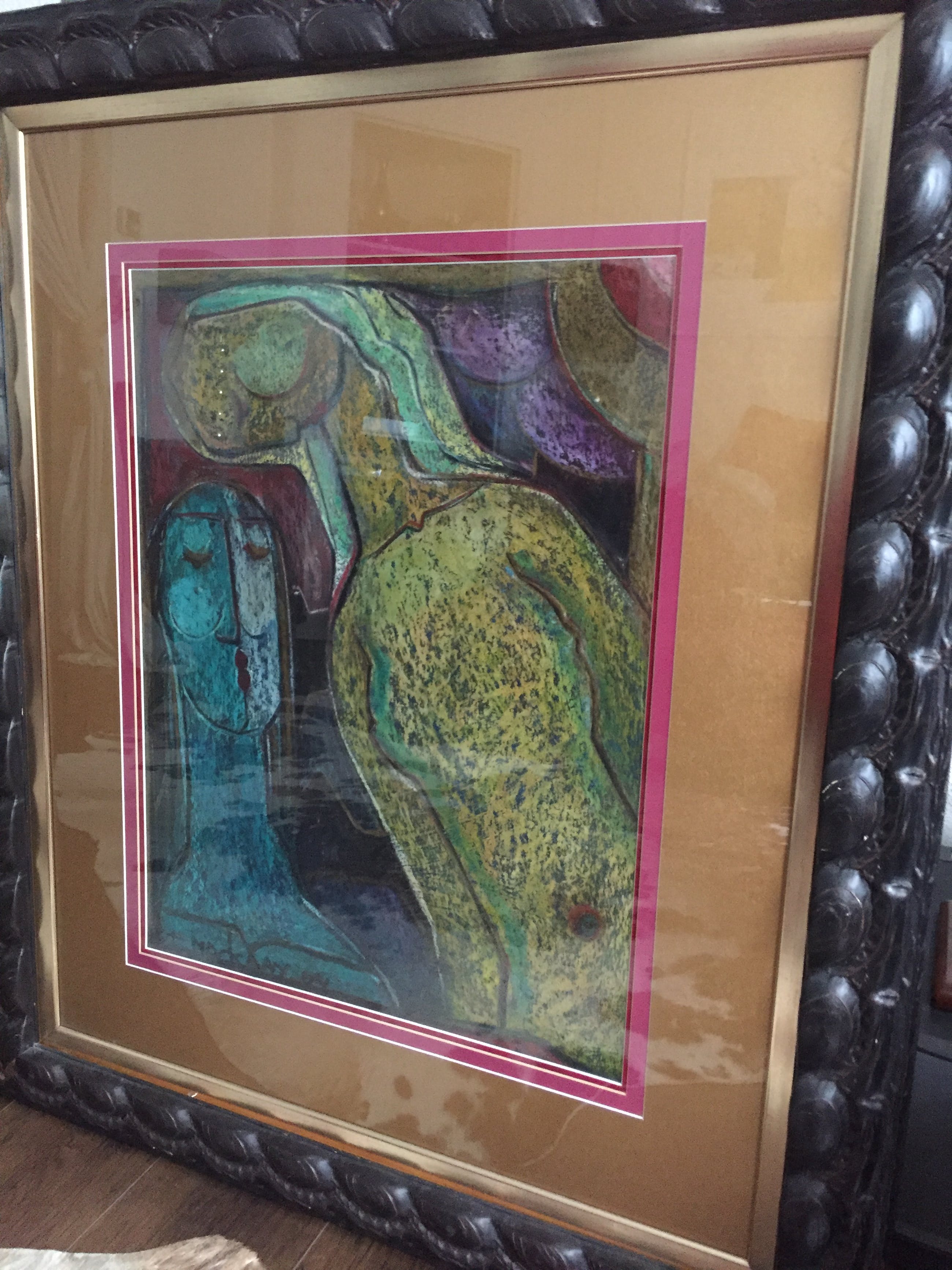 Prachtige Picasso achtingen uiting van kleuren en lijnen in twee vrouwen met hele mooie kleuren schakering paars blauw etc. Driedubbele passe-partout en stoere lijst. Kan zo aan de muur .