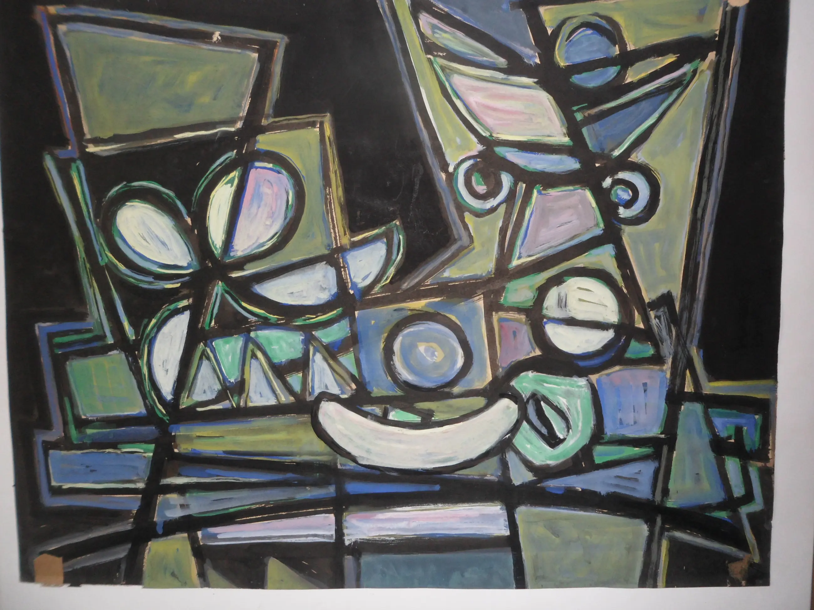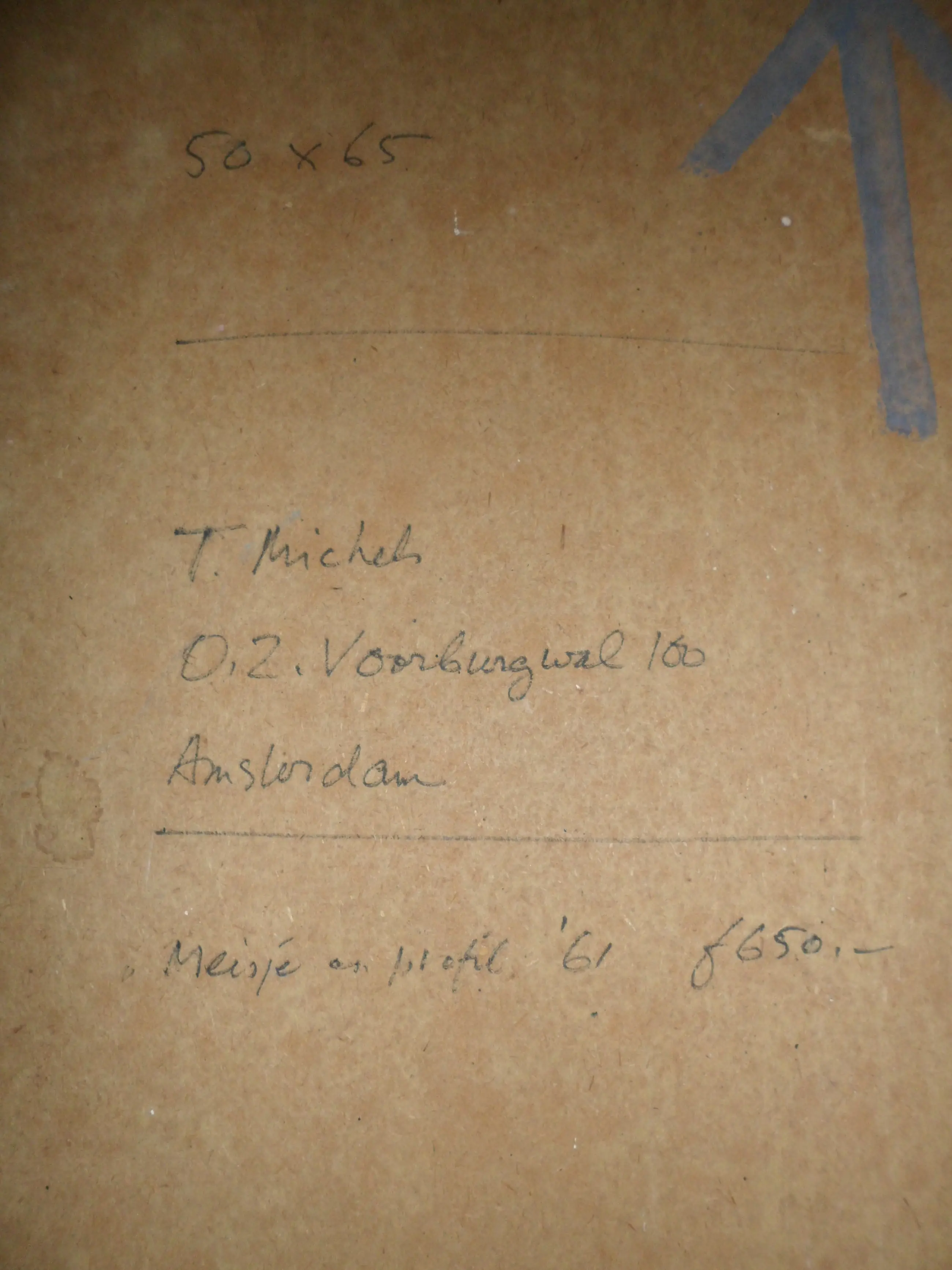 Bijzonder werk van Theo Michels omdat de drager, papier in dit geval, aan twee zijden is beschilderd. De zijde met de signatuur is het uiteindelijk geworden.