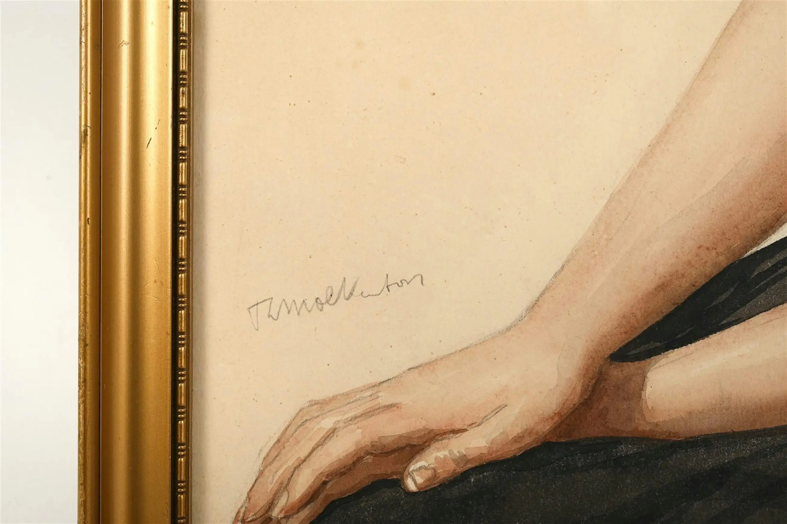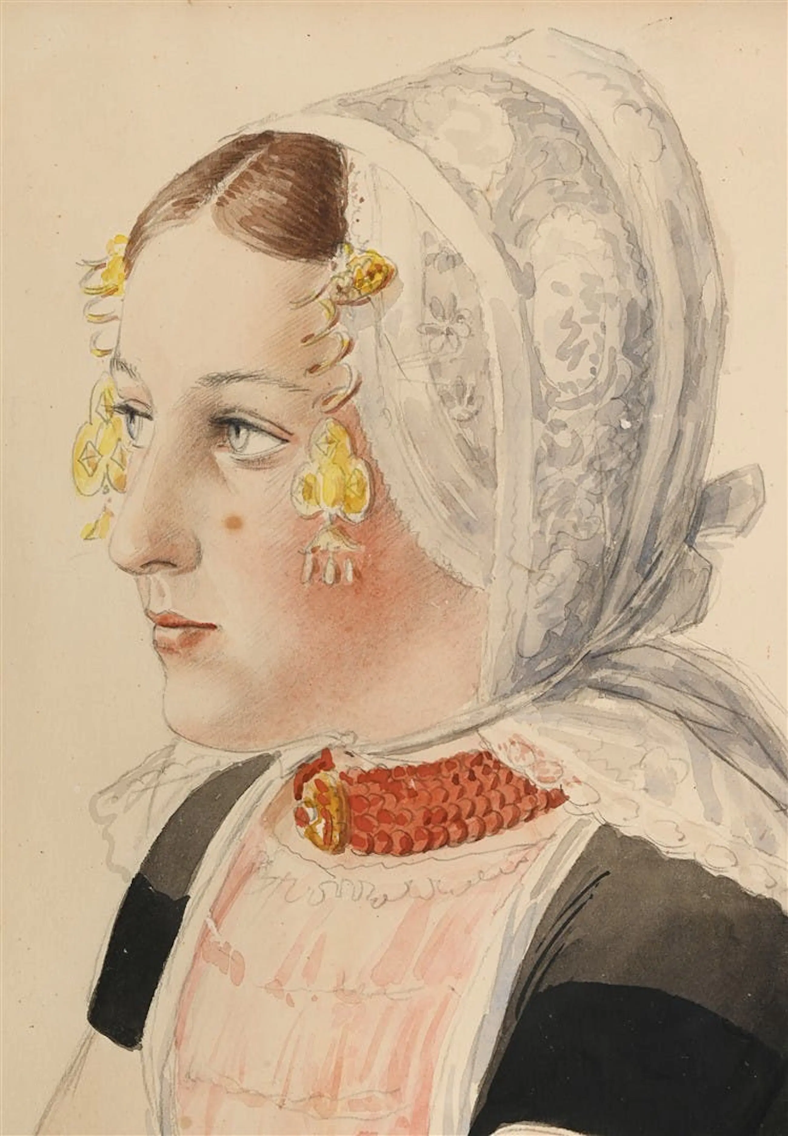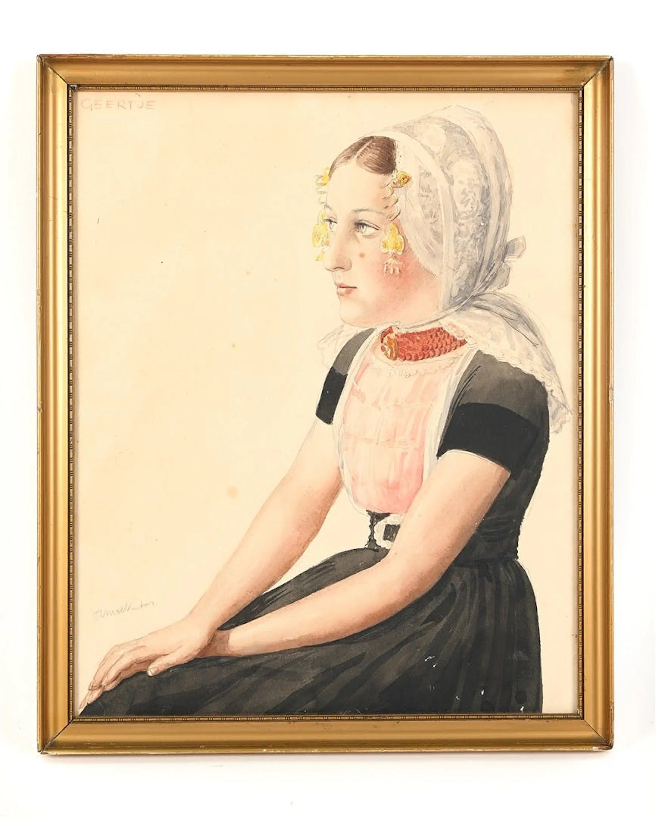 Portret van "Geertje" in Walcherse klederdracht, uitgevoerd in aquarel en potlood door Antoon Molkenboer (1872–1960). Gedetailleerde weergave van de kanten muts, gouden oorijzers en bloedkoralen ketting. Linksonder gesigneerd. Inclusief vergulde lijst.