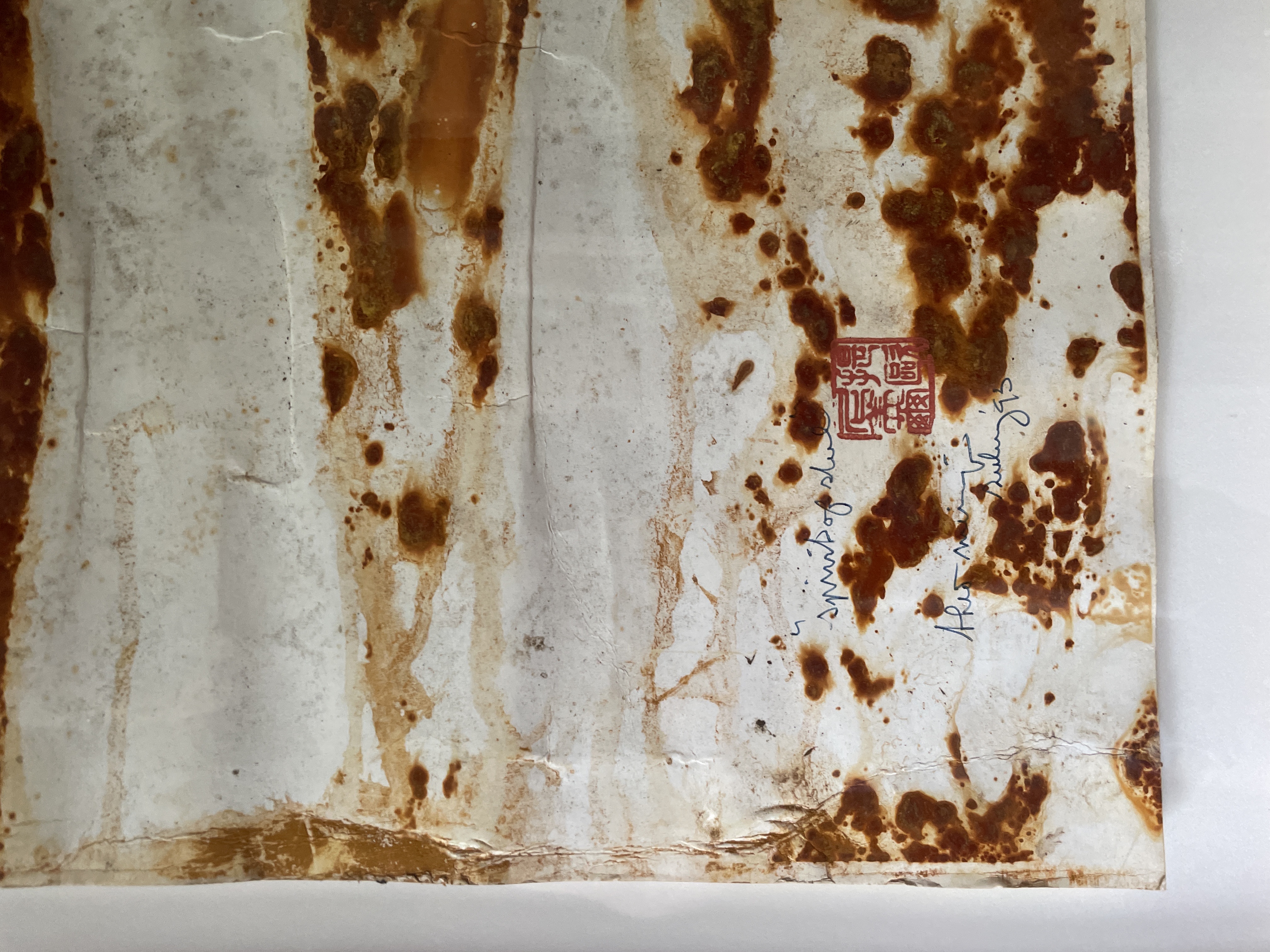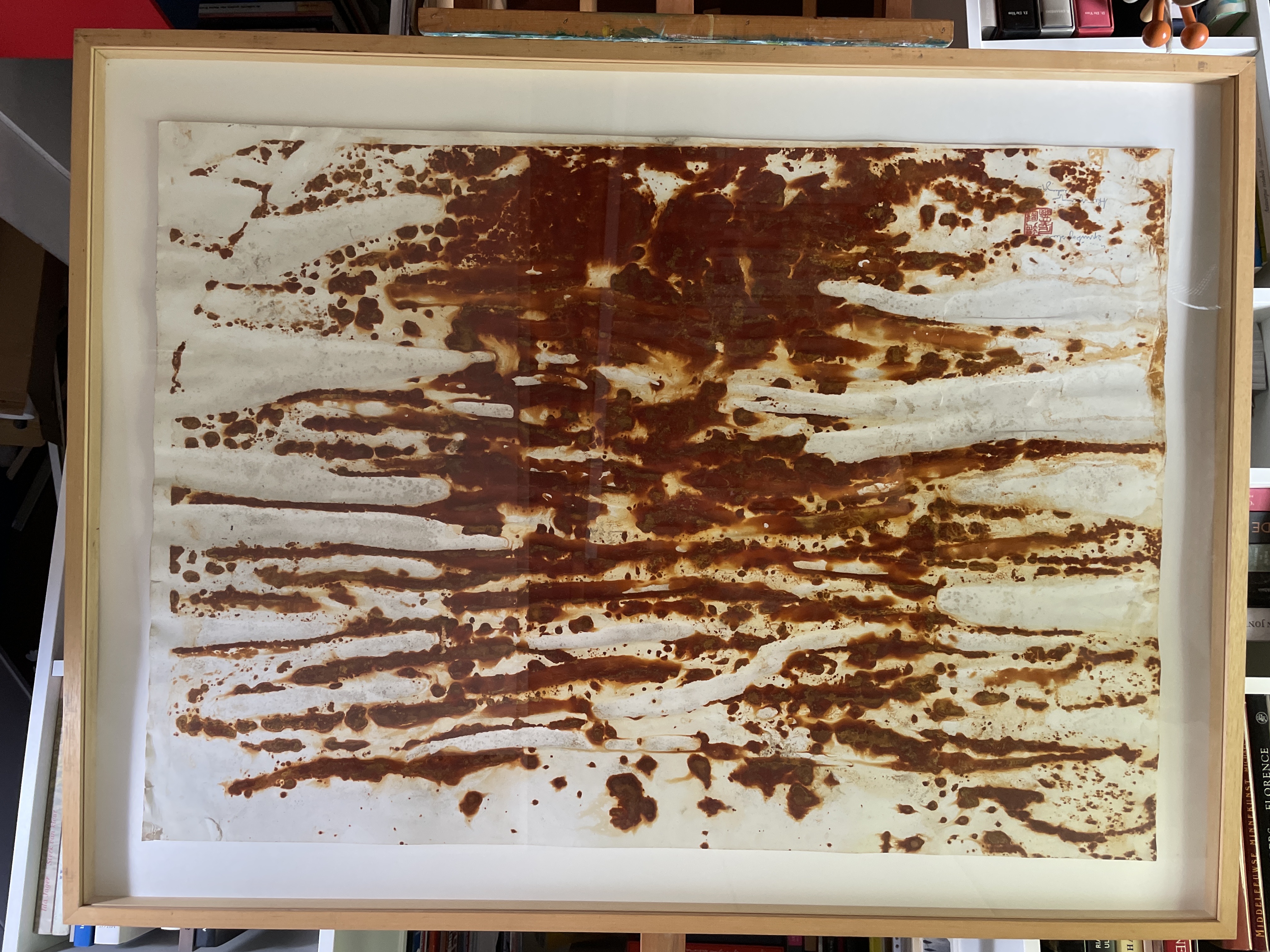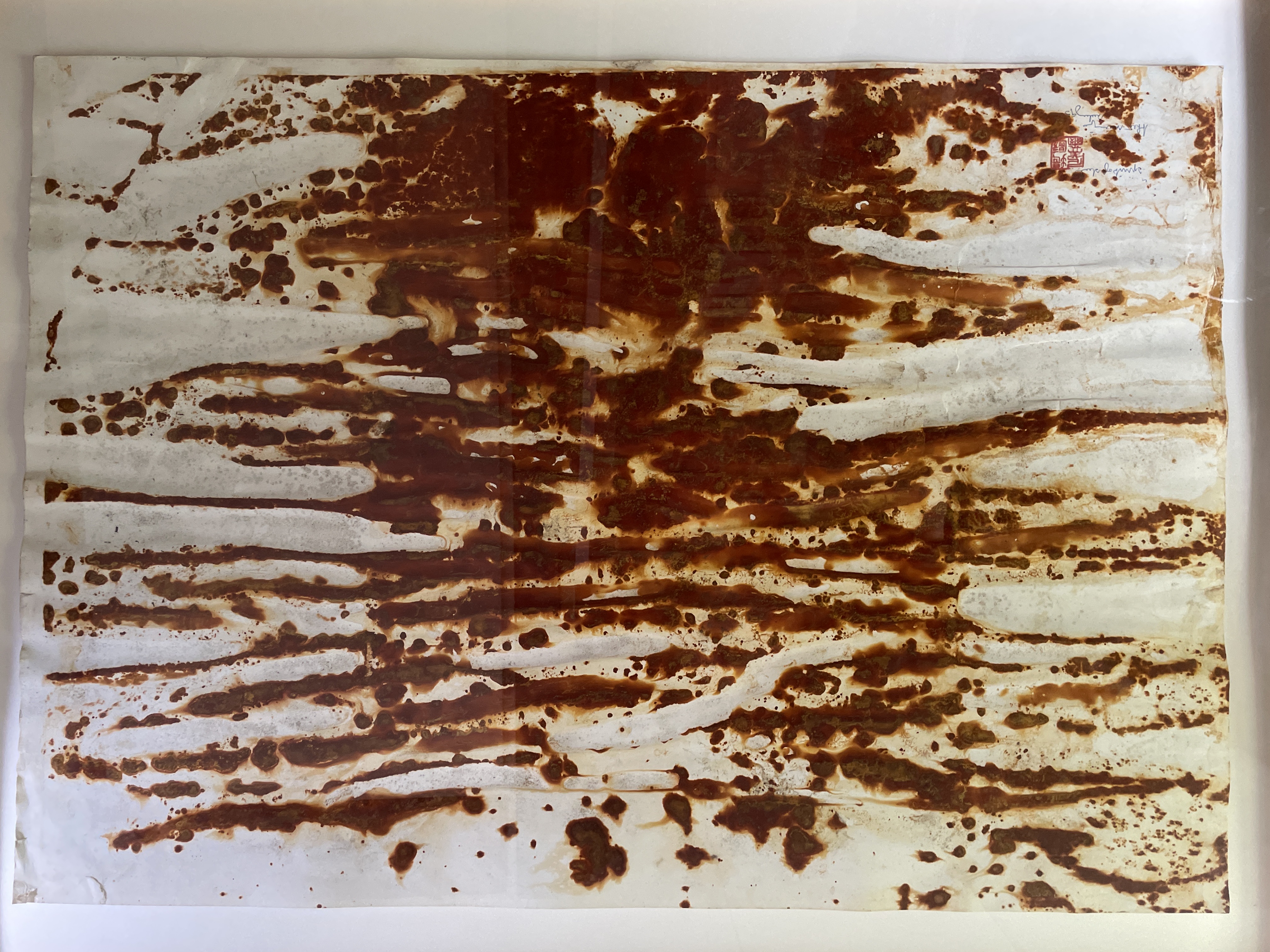 Grote ferroprint van Theo Niermeijer. Hij legde vellen papier tussen geroeste stalen platen en liet de tijd en het weer zijn werk doen. Vanwege het horizontale karakter van dit werk heeft het iets landschappelijks. Het werk is getiteld en gesineerd; de titel is alleen moeilijk leesbaar. Zie de foto’s.