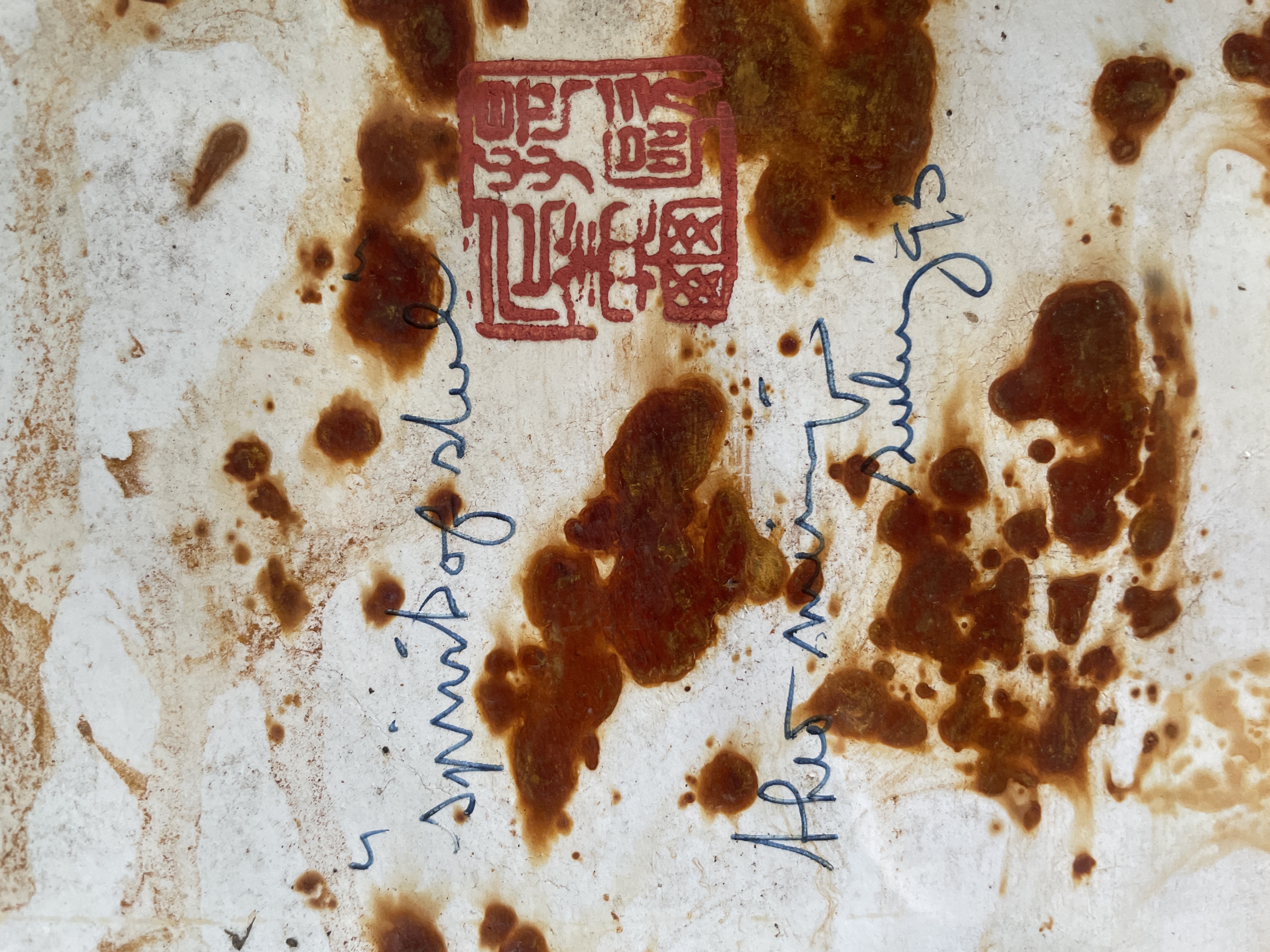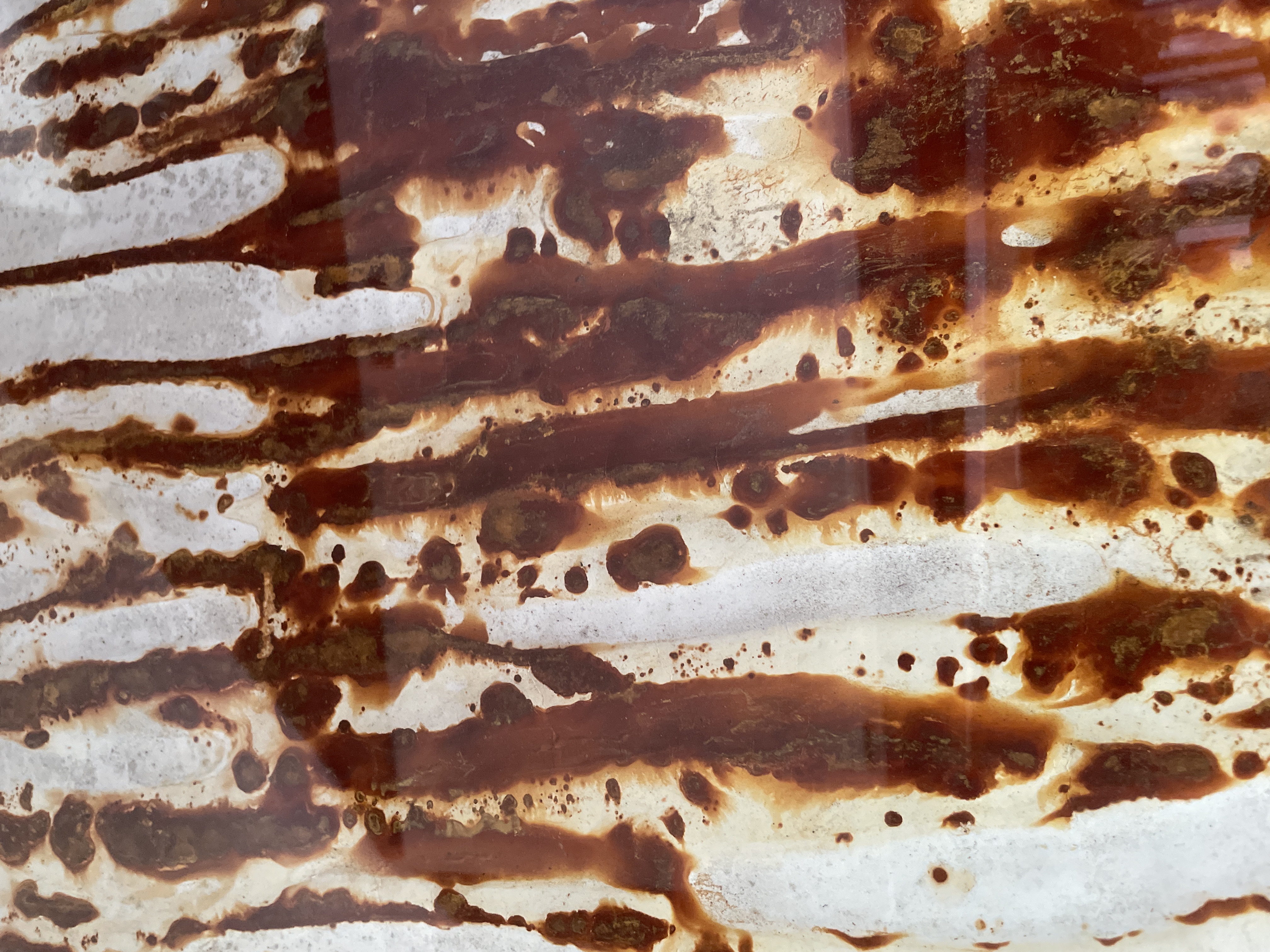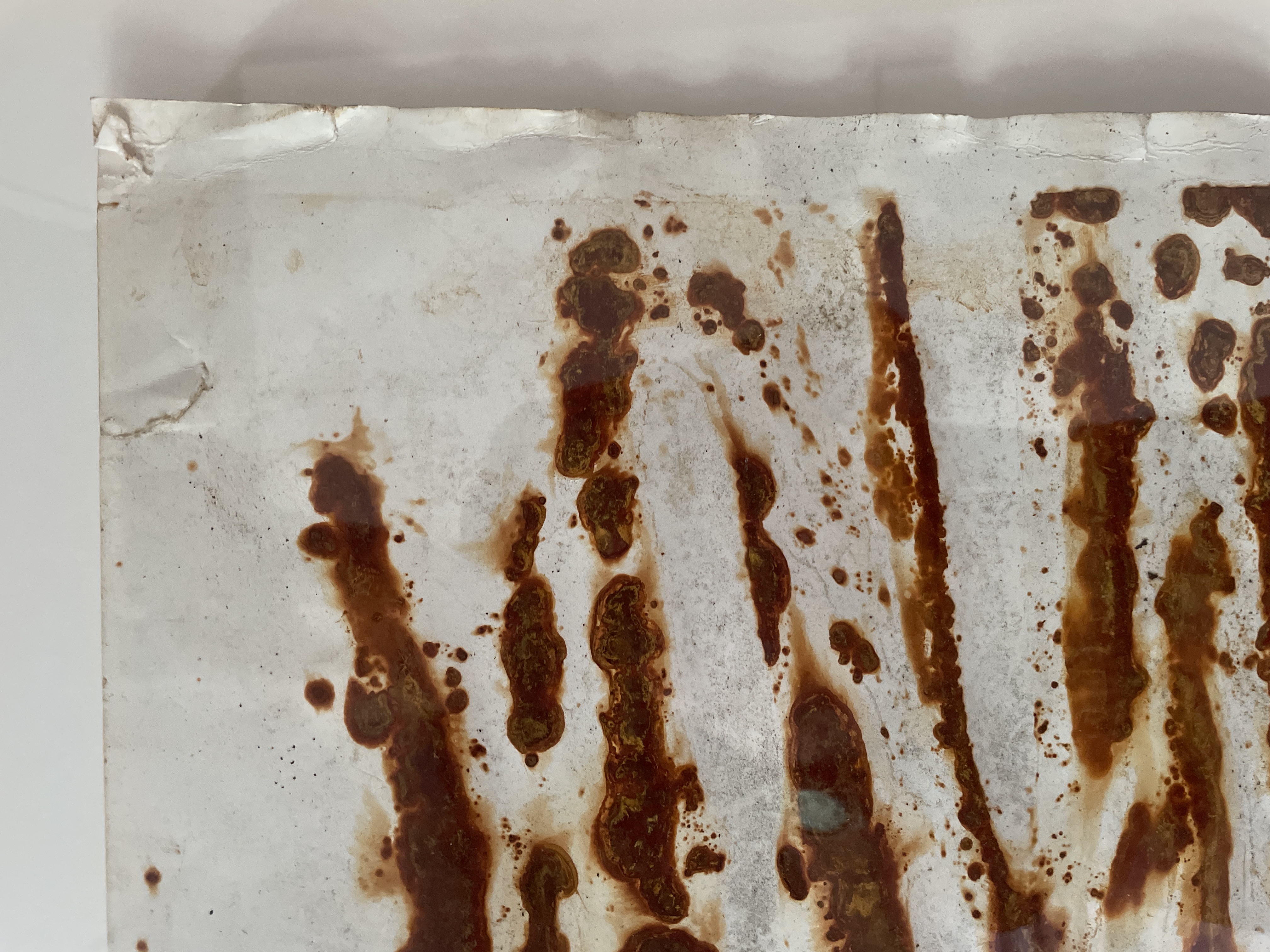 Grote ferroprint van Theo Niermeijer. Hij legde vellen papier tussen geroeste stalen platen en liet de tijd en het weer zijn werk doen. Vanwege het horizontale karakter van dit werk heeft het iets landschappelijks. Het werk is getiteld en gesineerd; de titel is alleen moeilijk leesbaar. Zie de foto’s.